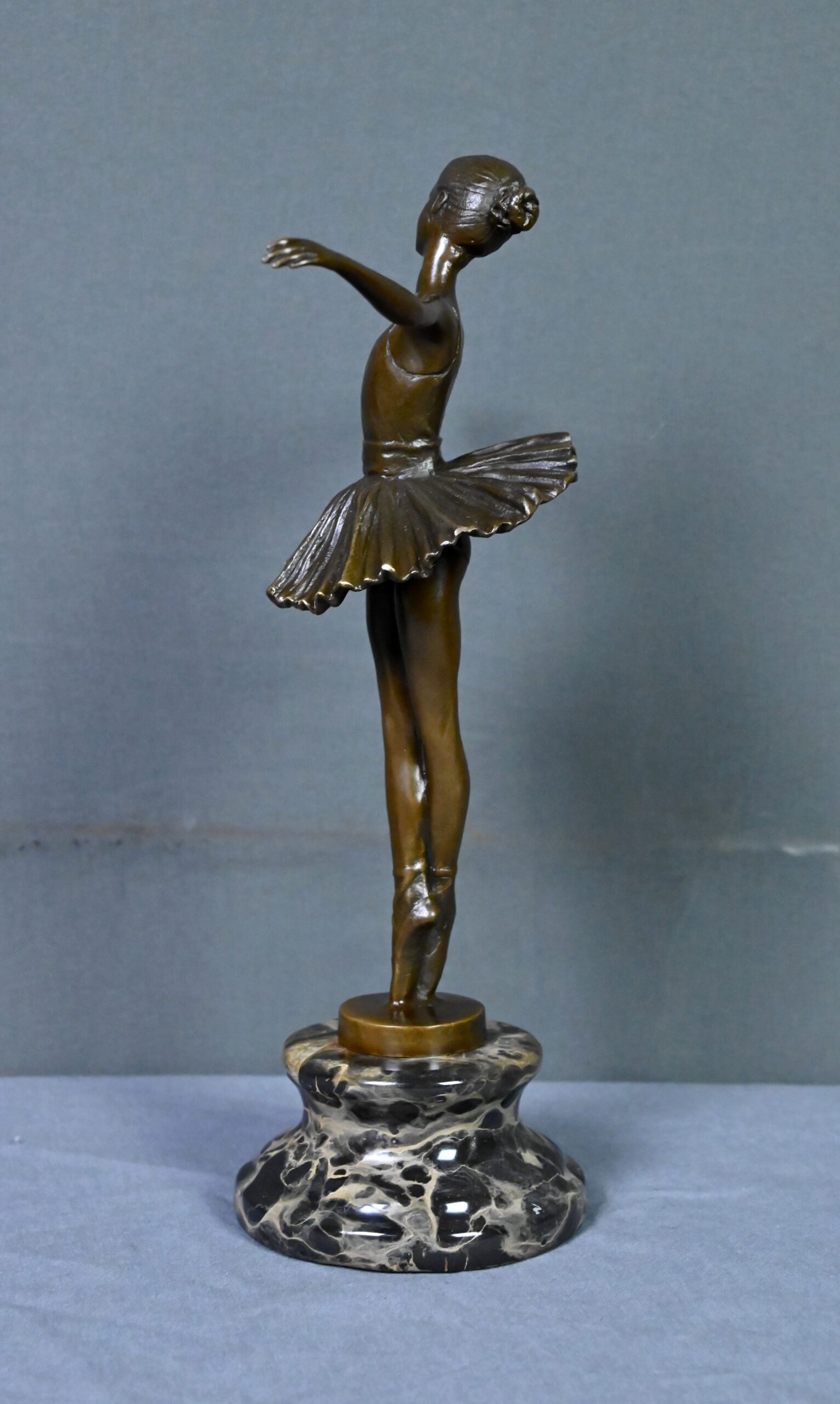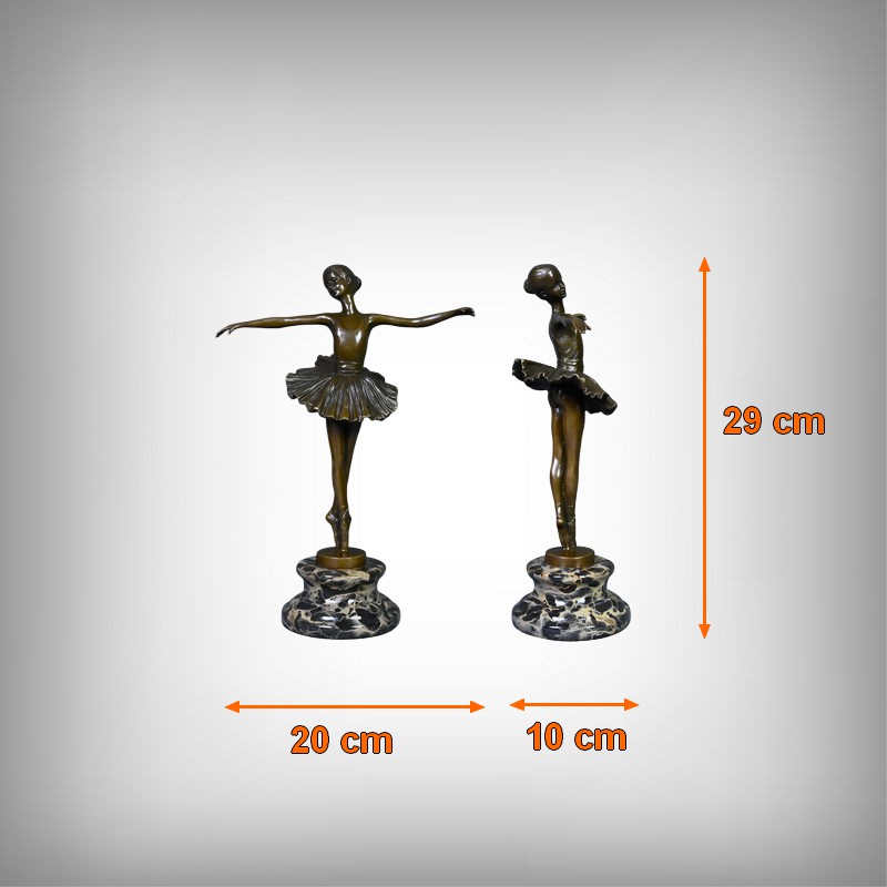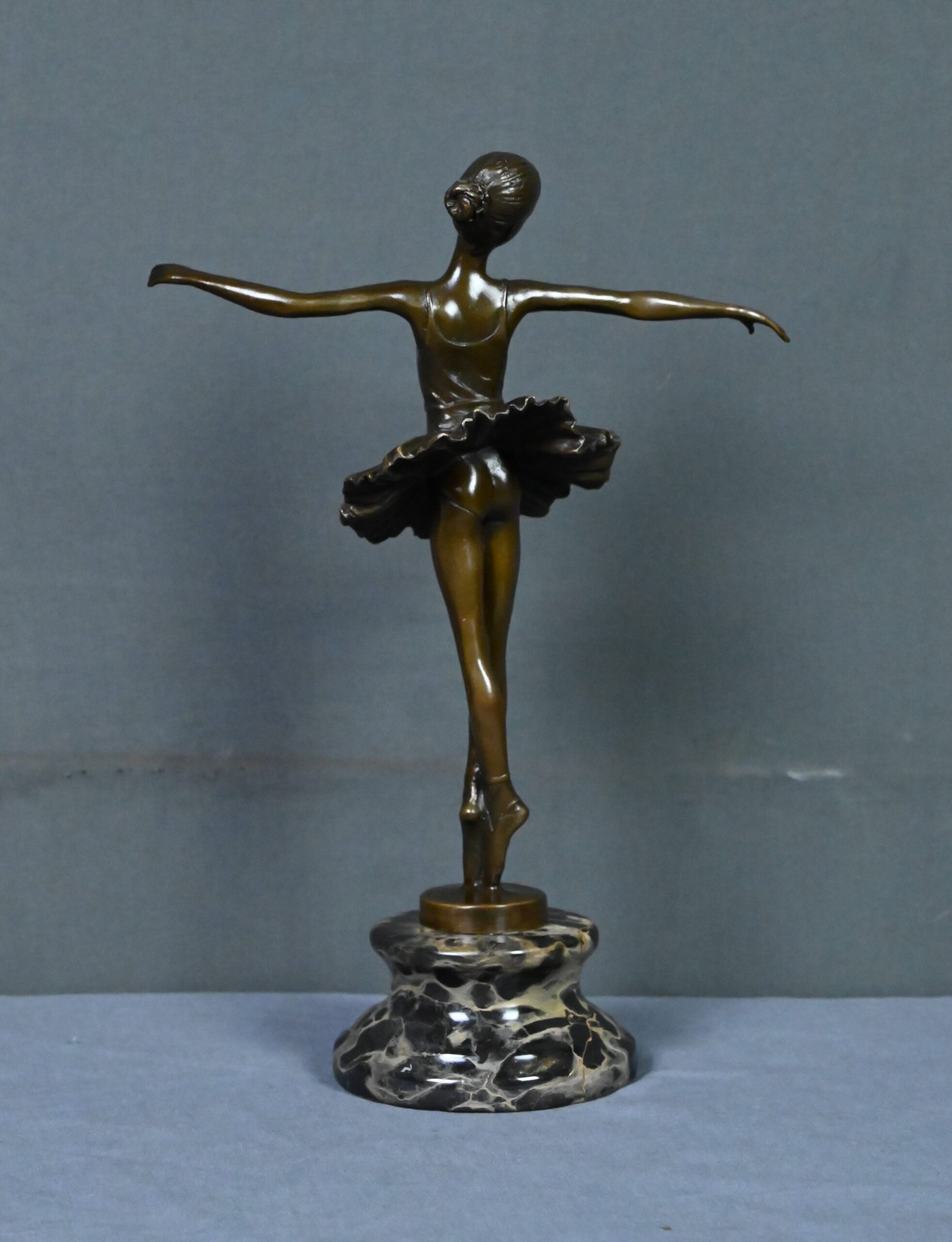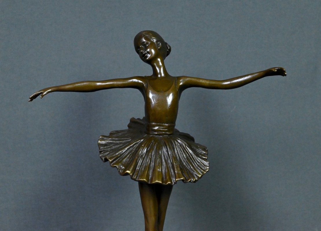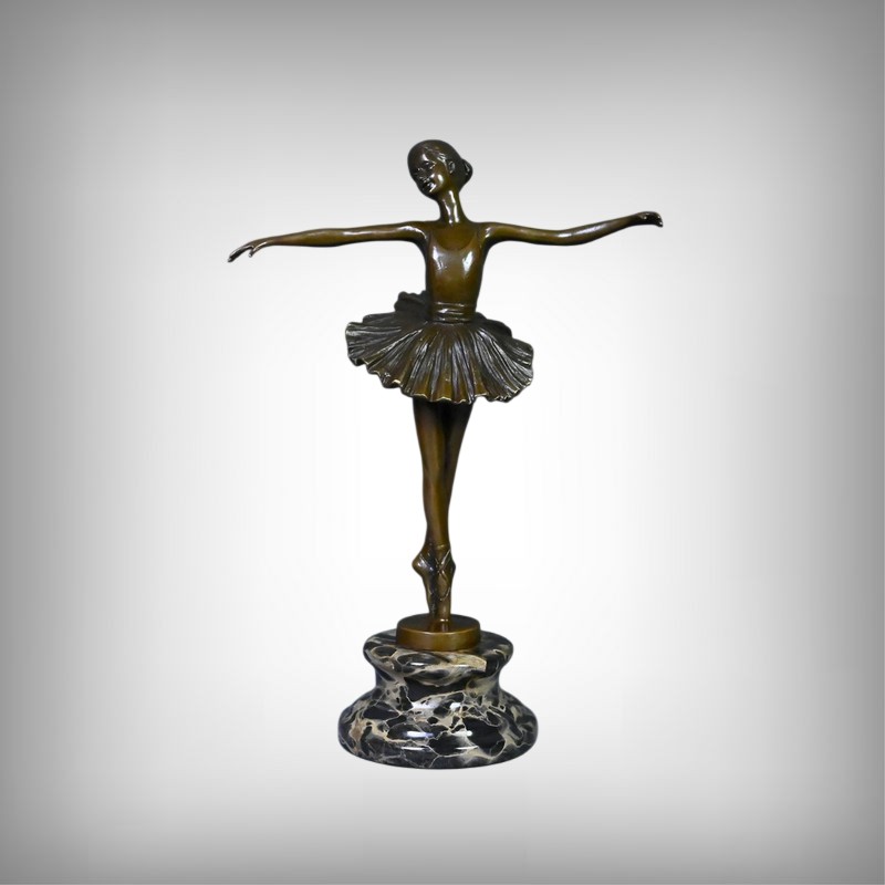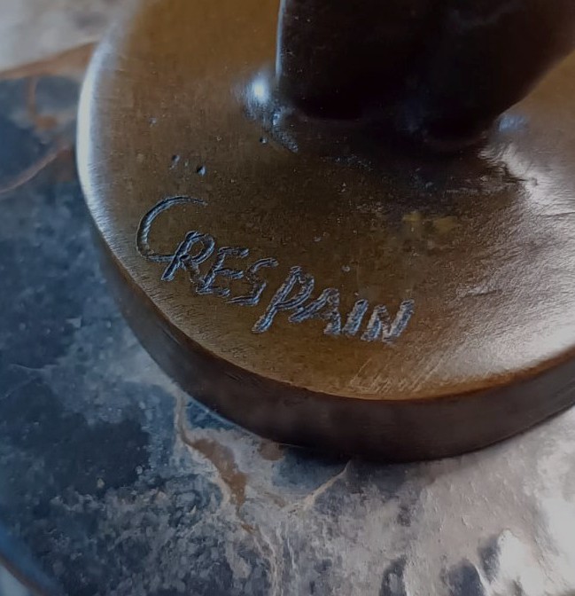 Élégante et aérienne, cette ballerine en bronze signée Crespain incarne la grâce intemporelle du ballet classique. Figée dans un équilibre parfait, en pointe, les bras délicatement déployés, elle semble suspendue dans un instant de pure poésie. Le sculpteur maîtrise ici avec finesse le mouvement, la tension du corps, la légèreté du tutu finement ciselé. Chaque détail témoigne d’un savoir‑faire remarquable, où la précision anatomique se marie à une sensibilité artistique rare. Reposant sur un socle en marbre en piédouche qui souligne la verticalité de la figure, cette œuvre dégage une présence à la fois douce et affirmée. Elle attire naturellement le regard et apporte une touche de raffinement à tout intérieur — qu’il s’agisse d’un salon contemporain, d’un bureau élégant ou d’une collection dédiée aux arts du mouvement. Cette sculpture au sujet intemporel est une pièce idéale pour les amateurs d’art figuratif, les passionnés de danse ou les collectionneurs en quête d’une œuvre expressive et harmonieuse.