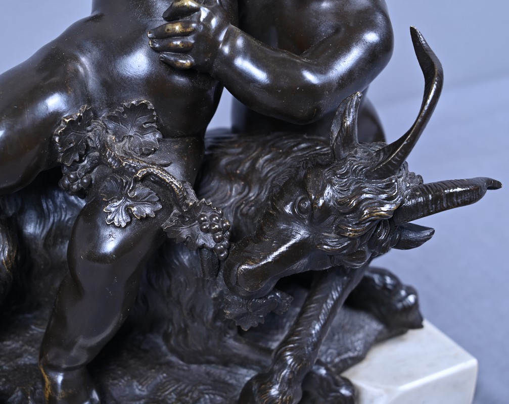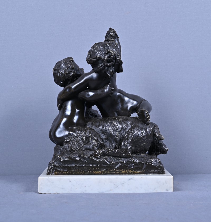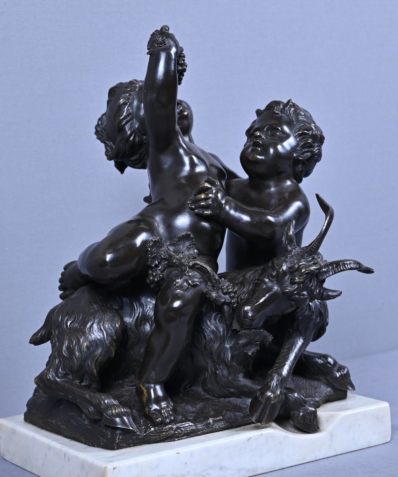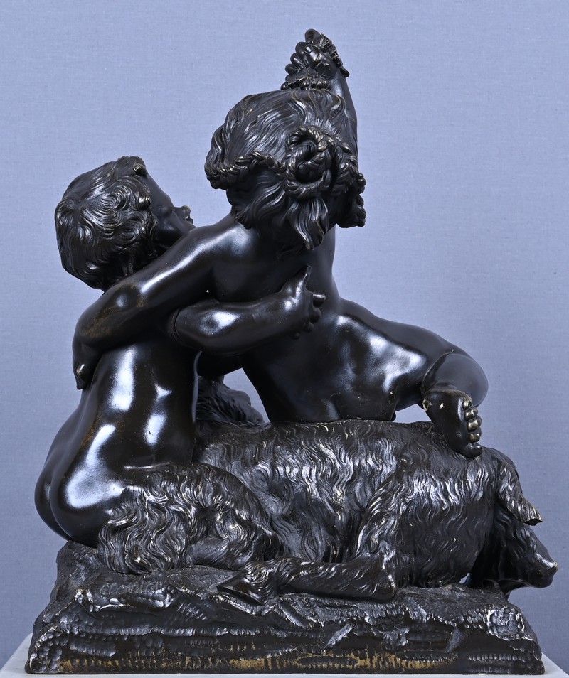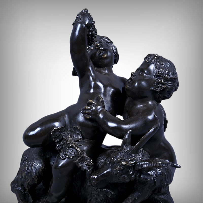 Intitulé L’Enfance de Bacchus, ce bronze patiné d’une grande finesse est une œuvre emblématique du style gracieux et expressif de Clodion, maître incontesté de la sculpture du XVIIIe siècle. Sur un socle en marbre veiné qui souligne la noblesse du sujet, deux enfants aux traits délicatement modelés incarnent l’esprit de Bacchus dans une scène pastorale empreinte de vivacité. Bacchus, juché sur le dos d’un bouc au pelage finement ciselé, brandit une grappe de raisin dans un geste triomphant, tandis qu’un faune regarde comme fasciné avec une naïveté joyeuse. Le mouvement est fluide et chaque détail — des boucles des cheveux aux feuilles de vignes — témoigne d’un savoir-faire. L’ensemble possède une profondeur visuelle remarquable et la signature de Clodion est présente sur la terrasse. Cette composition dynamique et mythologique, célèbre l’innocence et l’abondance dans une esthétique néoclassique raffinée. Une pièce de collection rare, idéale pour les amateurs d’art ancien, les passionnés de mythologie ou les intérieurs élégants en quête d’une œuvre à la fois décorative et historique.