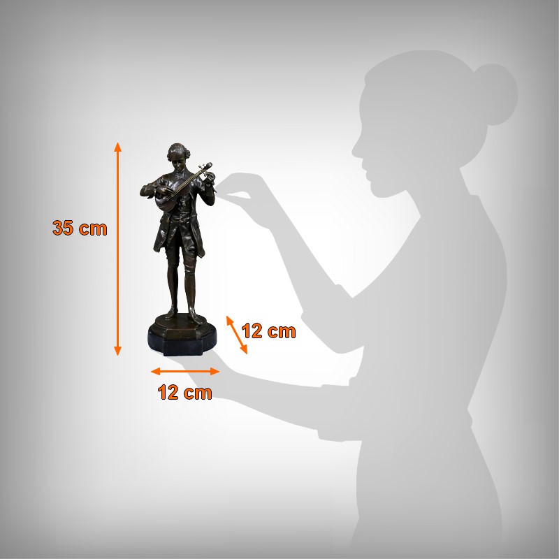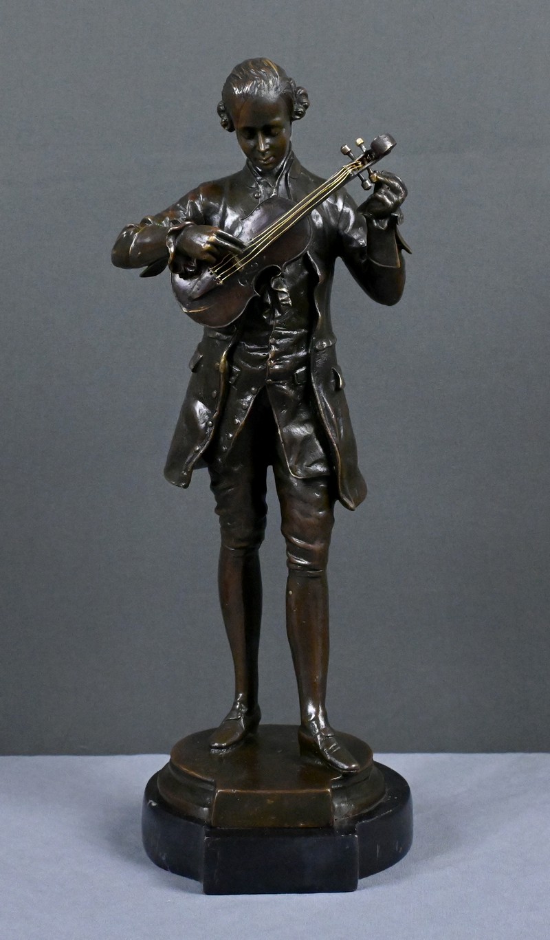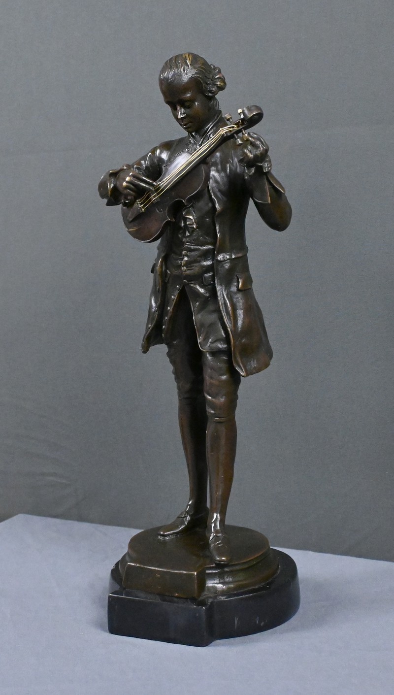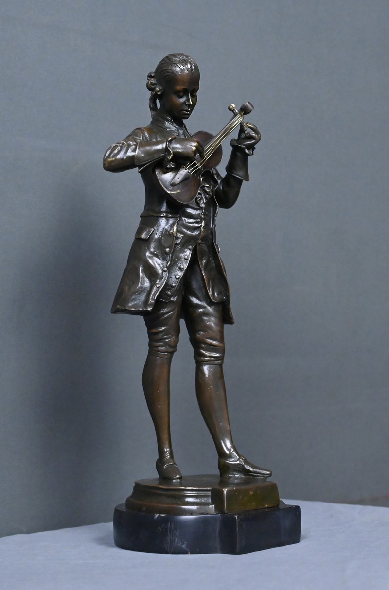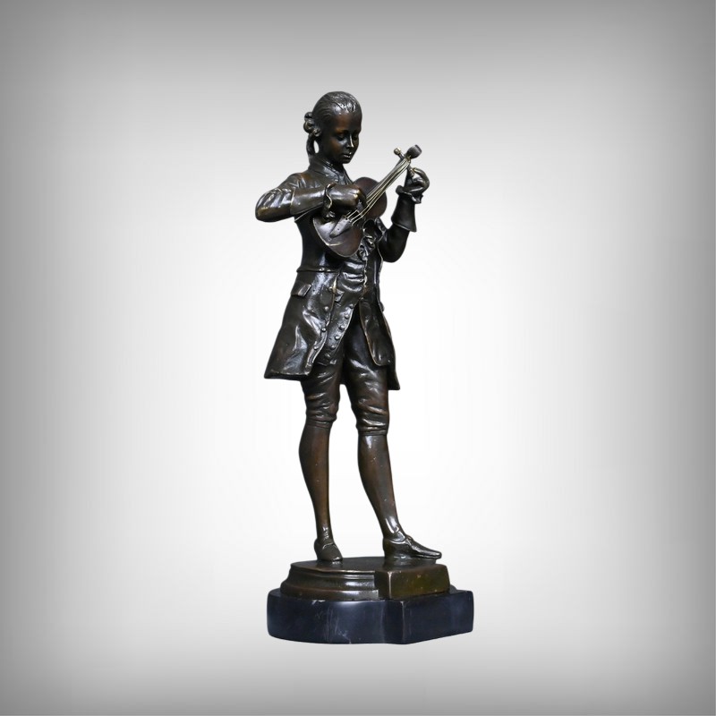 Ce bronze représente Mozart, la tête inclinée, accordant son violon tenu contre lui. Les détails du costume d’époque — redingote, gilet, culotte et souliers à boucle — sont rendus avec une grande précision, soulignant l’élégance du XVIIIᵉ siècle et l’aura du compositeur.