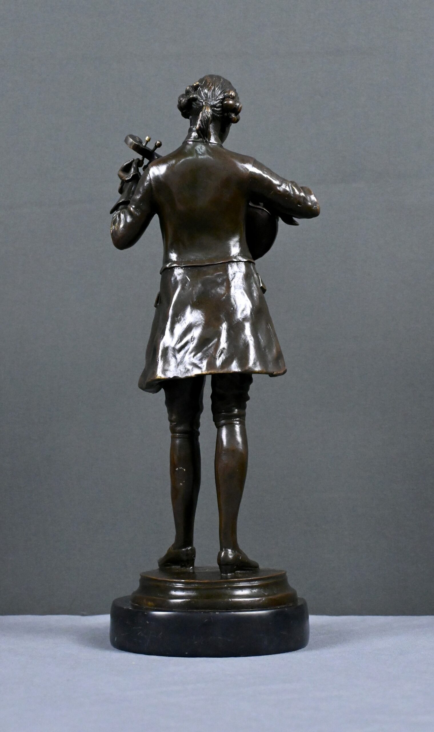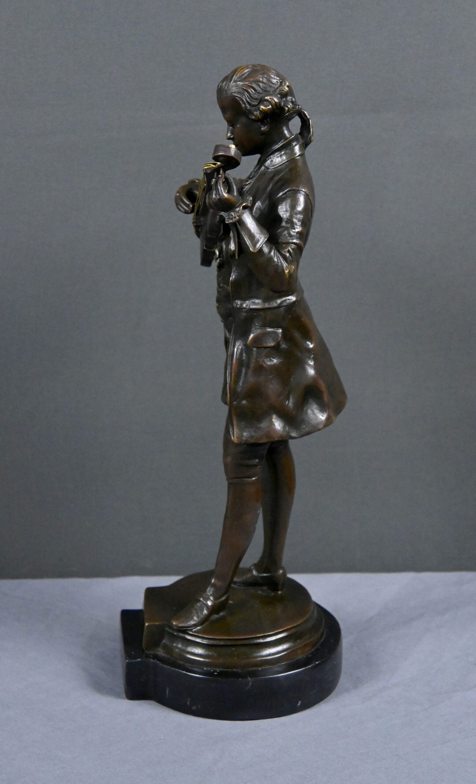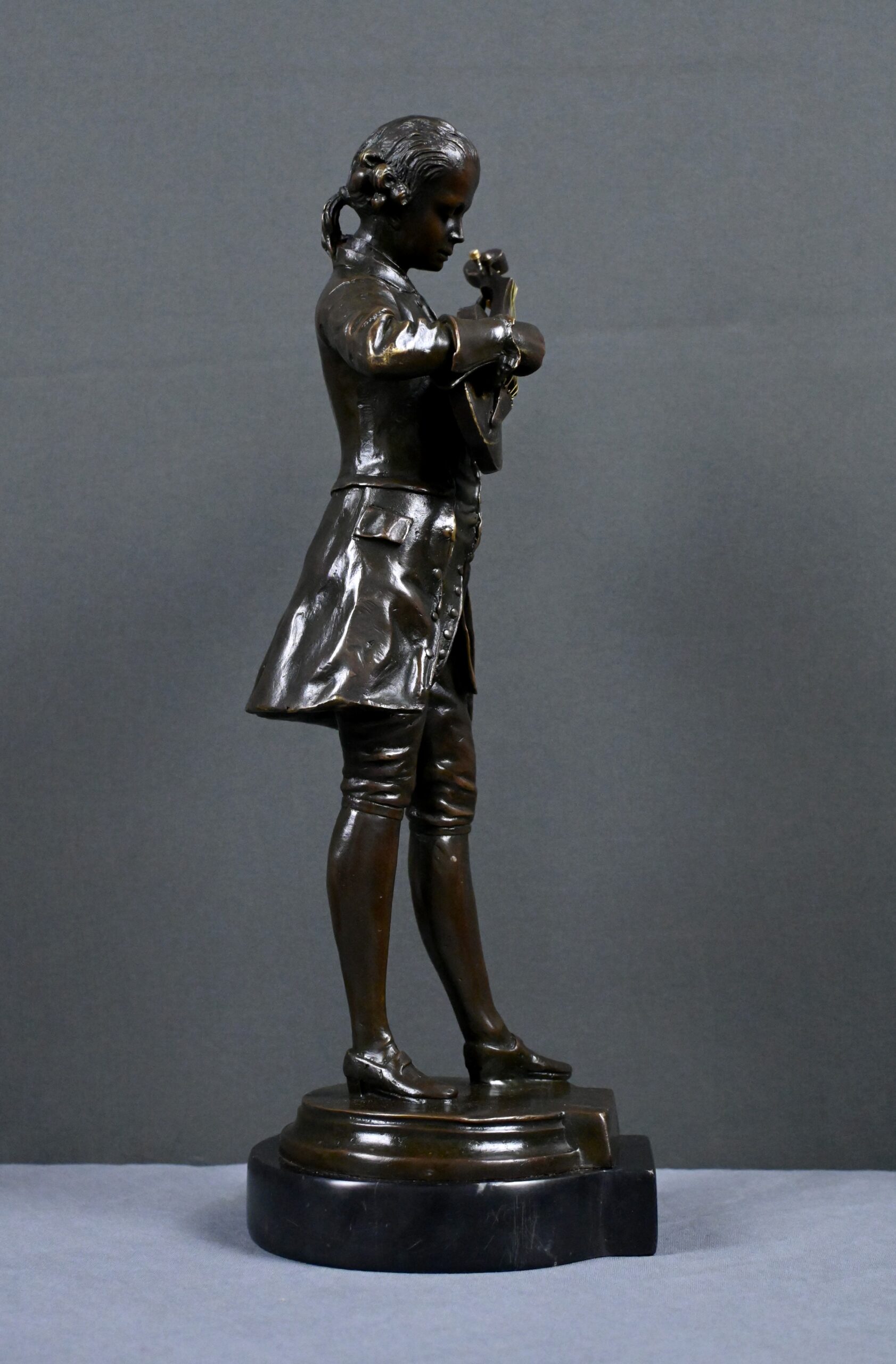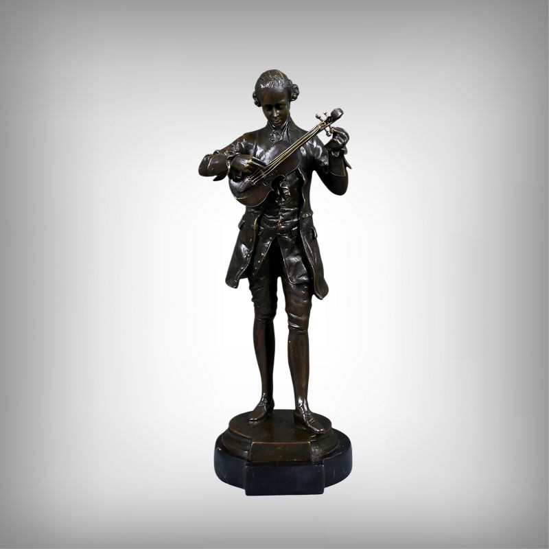 Ce bronze représente Mozart, la tête inclinée, accordant son violon tenu contre lui. Les détails du costume d’époque — redingote, gilet, culotte et souliers à boucle — sont rendus avec une grande précision, soulignant l’élégance du XVIIIᵉ siècle et l’aura du compositeur.