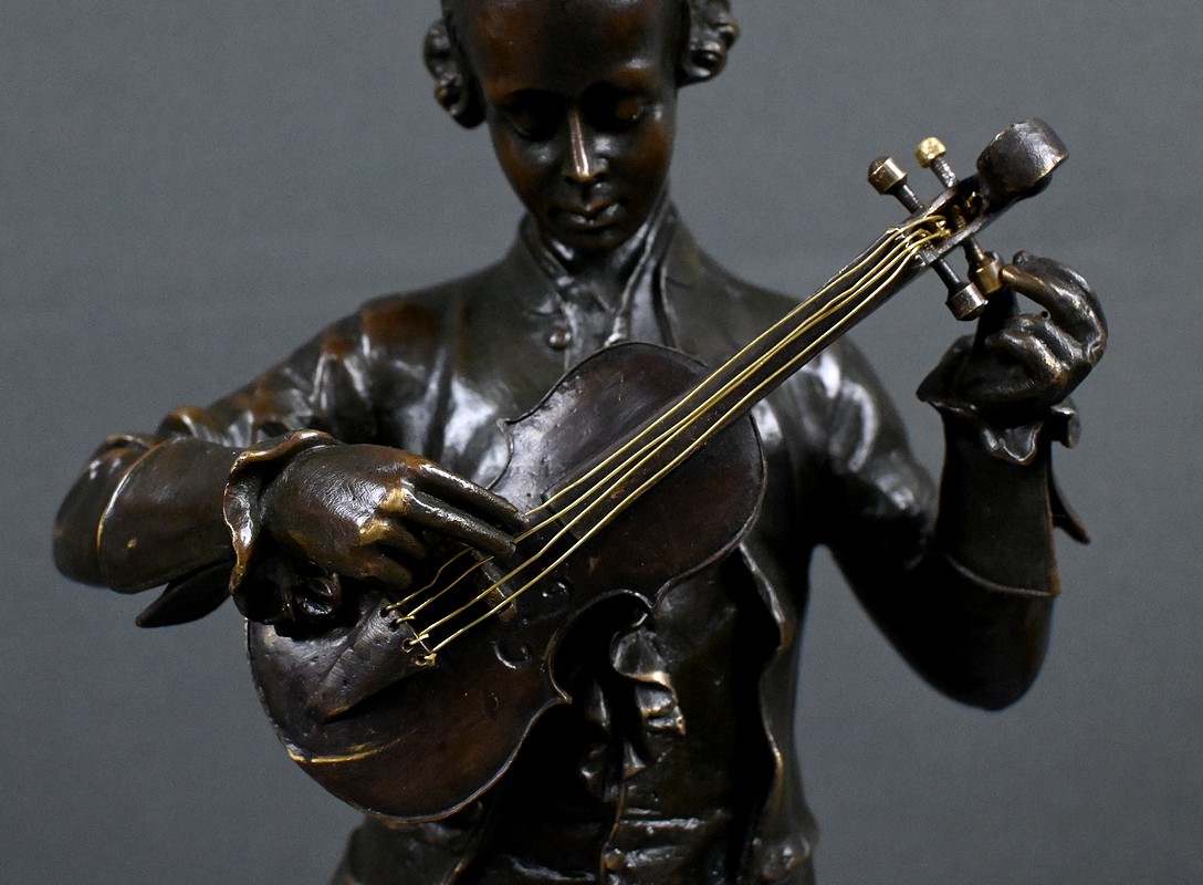 La fonte de qualité et la patine profonde met en valeur les volumes, les plis du vêtement et l’expression concentrée du musicien. Le travail du sculpteur révèle une véritable sensibilité : on perçoit la tension du geste, la maîtrise du violoniste et la profondeur intérieure de l’artiste. Le socle apporte stabilité et présence, donnant à l’ensemble une silhouette harmonieuse et très décorative.