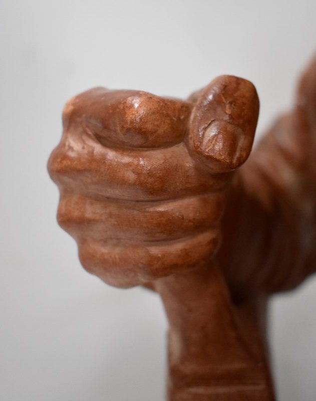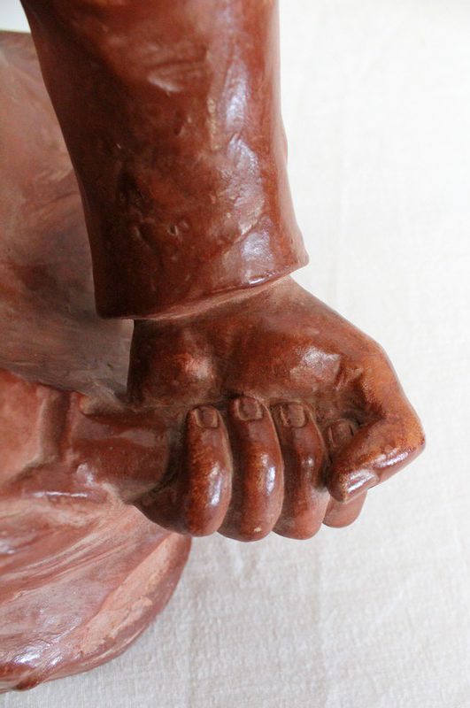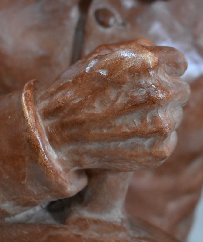 Le poids de sa tâche se devine par ses épaules courbées, mais est contrebalancé par la fermeté de sa poigne et l’impression de force qui s’en dégage.