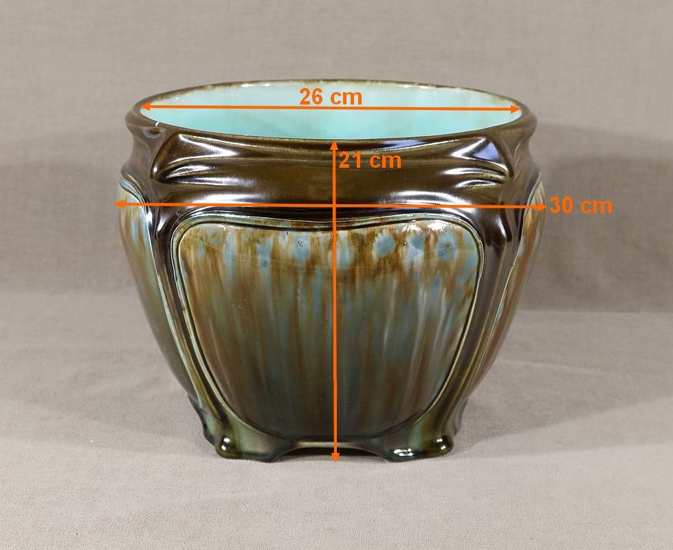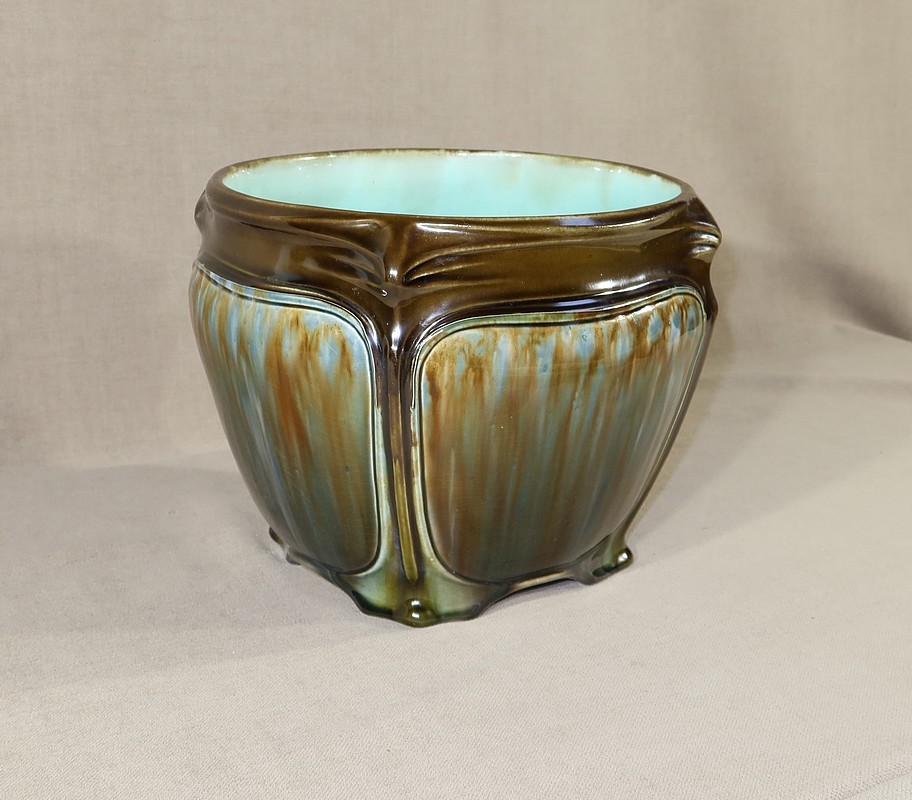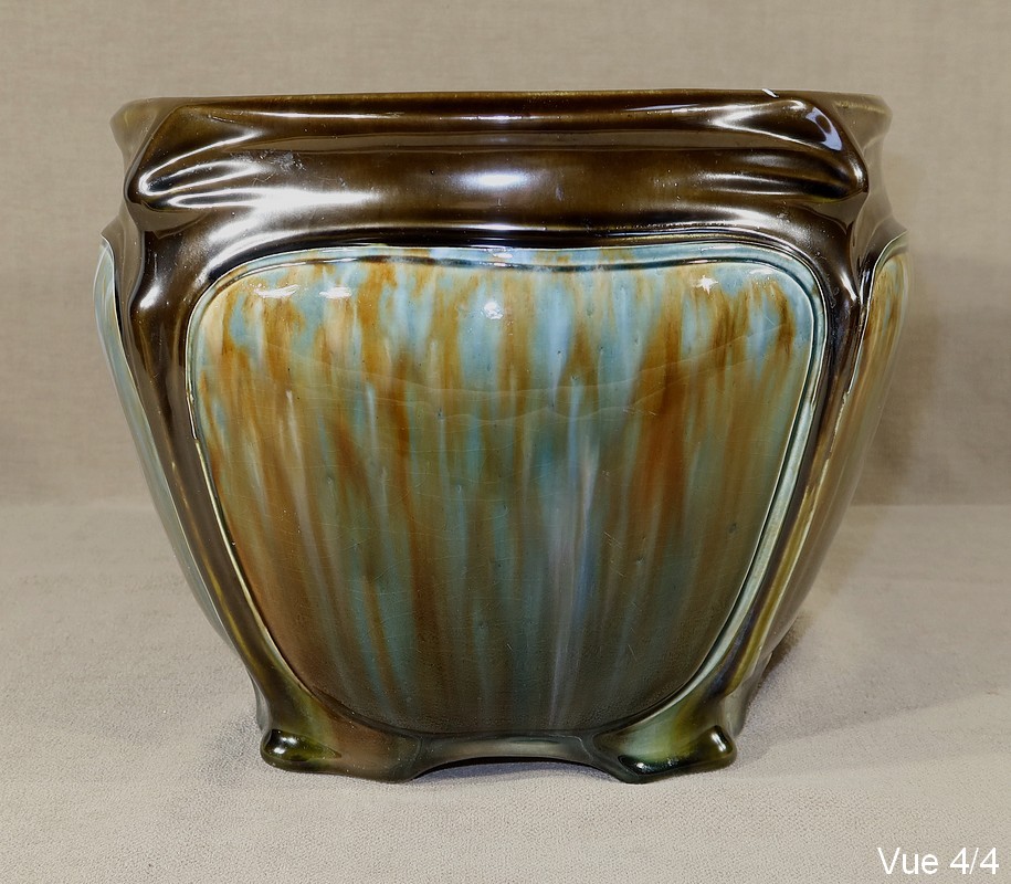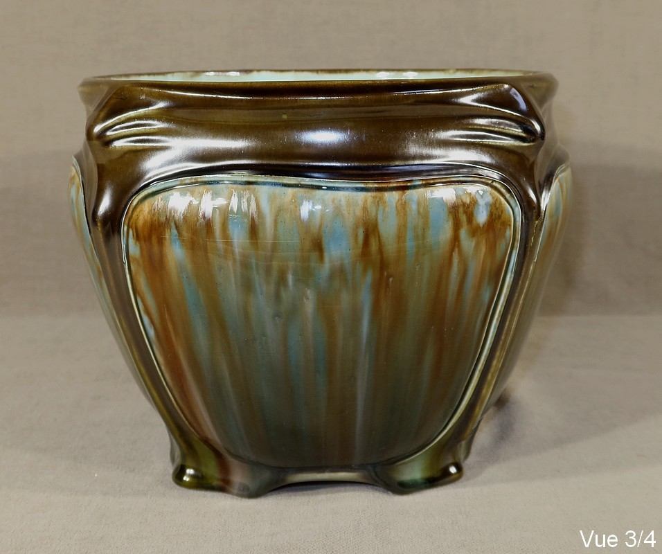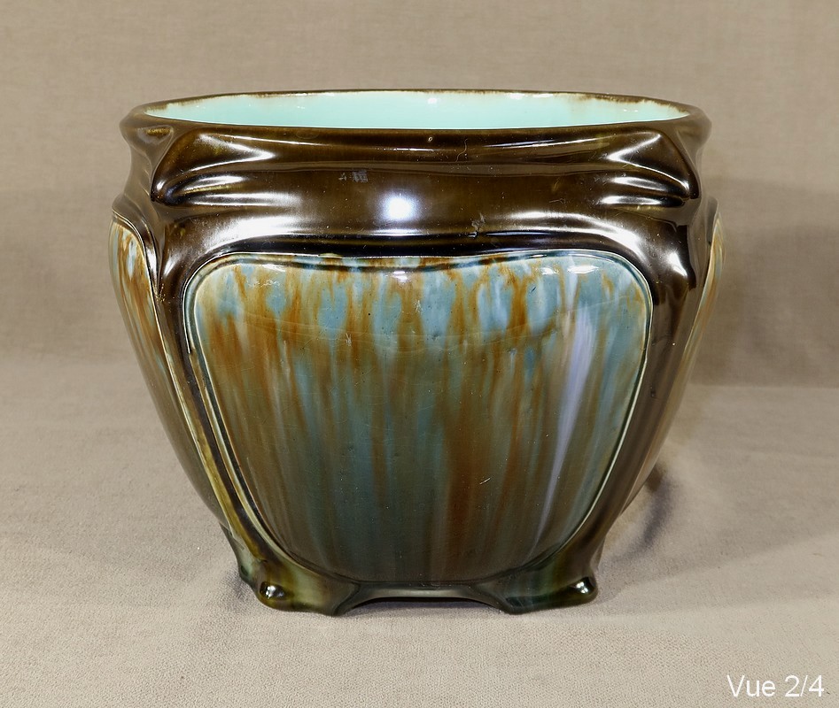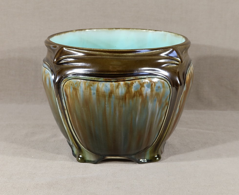 Cache-pot en faïence d’après Hector Guimard, possédant des lignes courbes en relief et un émail brun, nuancé de bleu turquoise.
