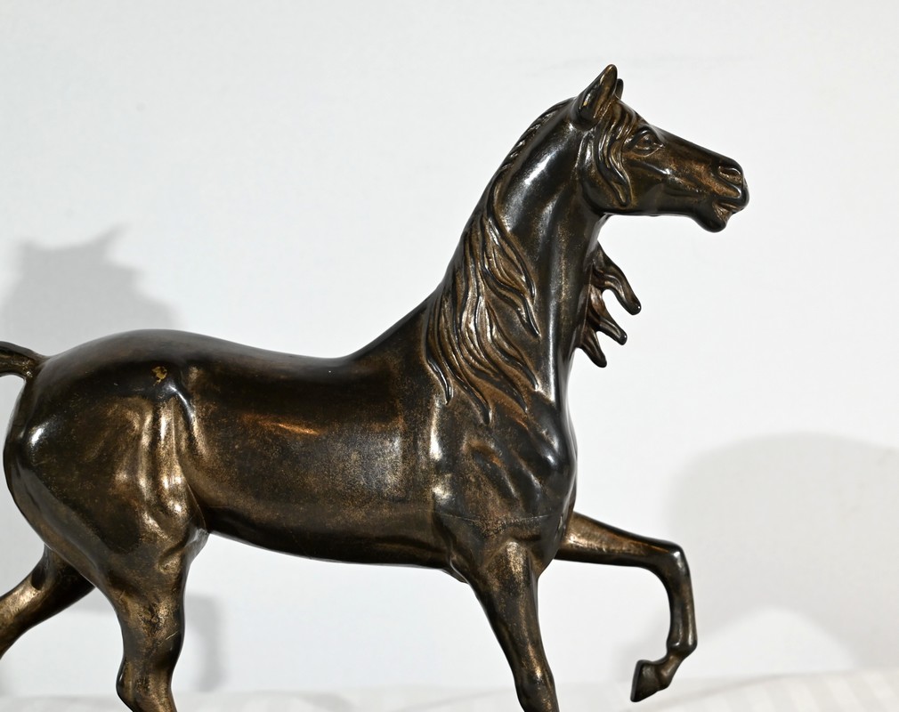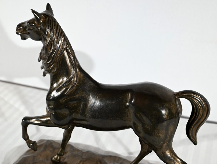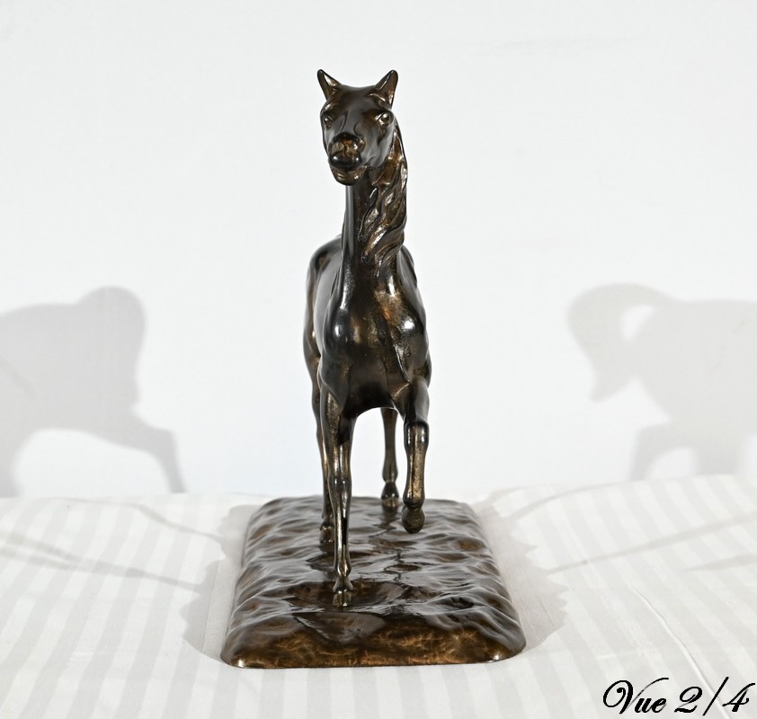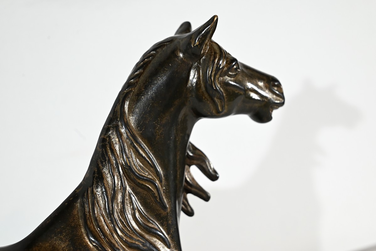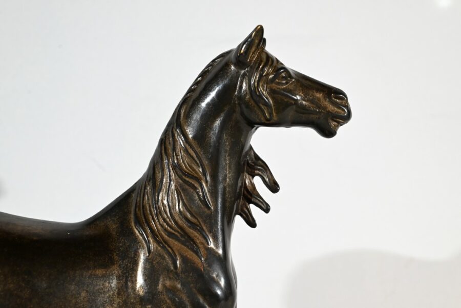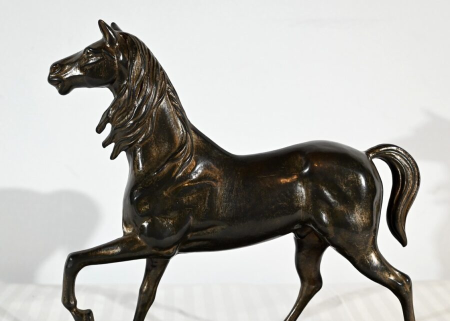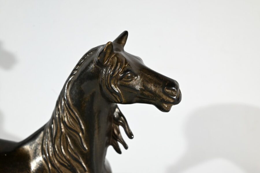 Cette œuvre représente un étalon au pas, la crinière dans le vent.