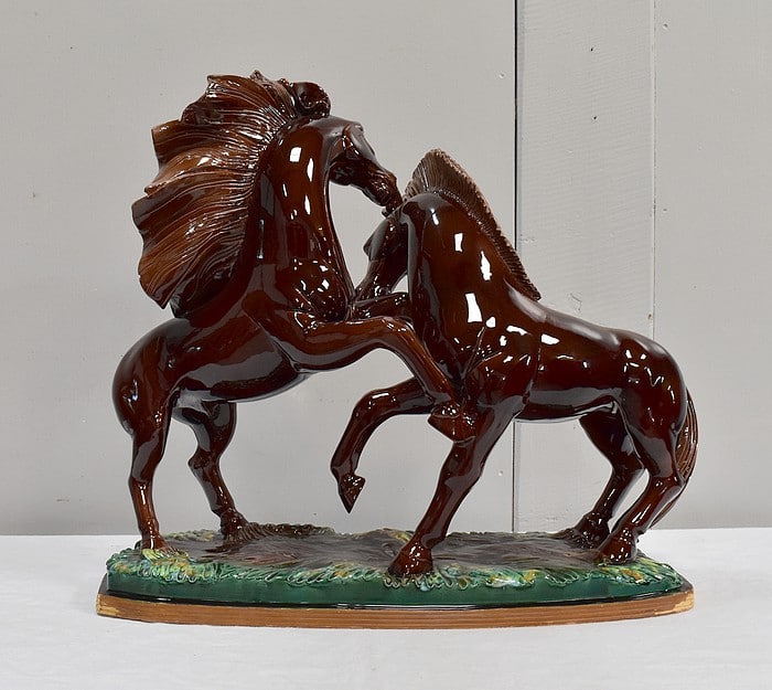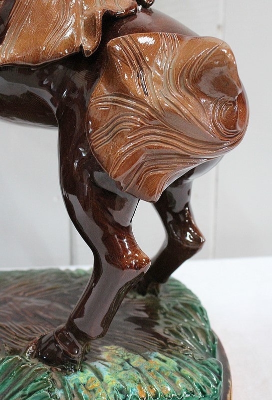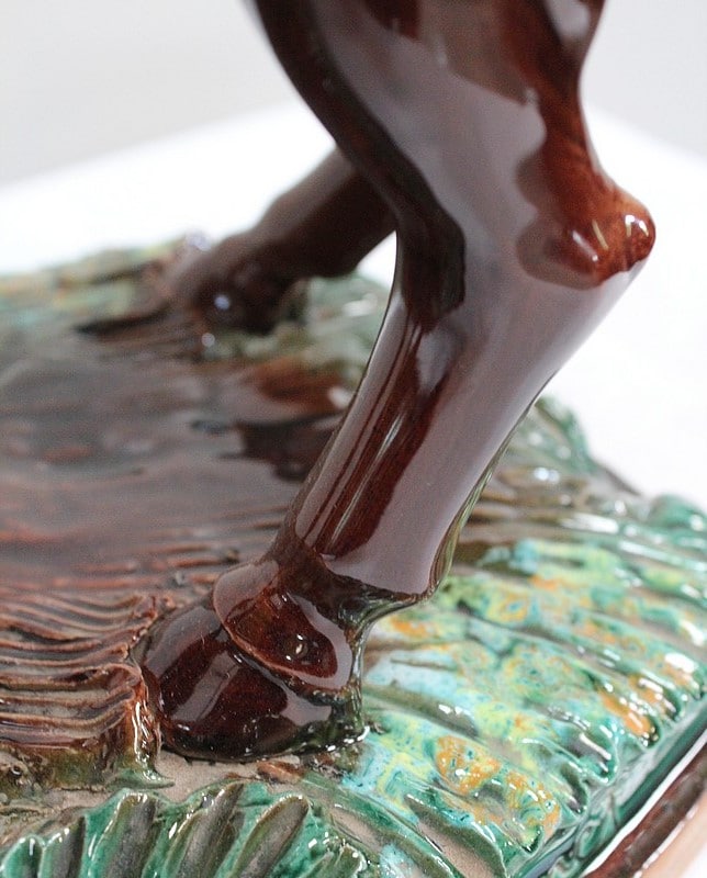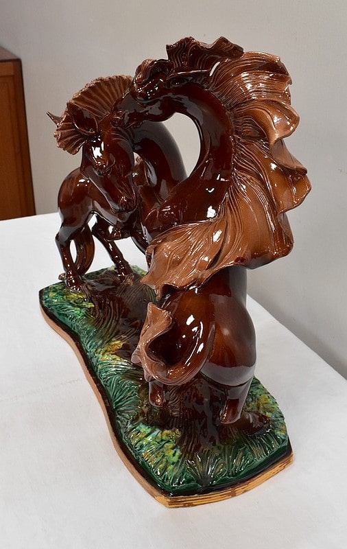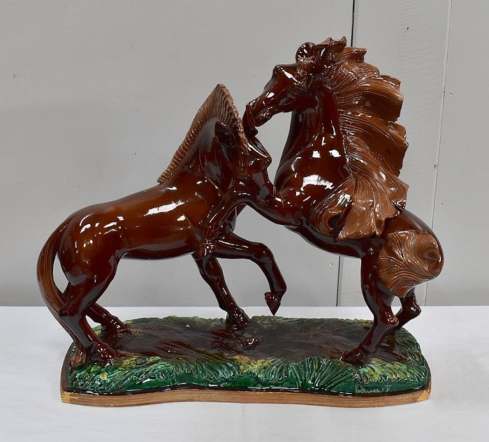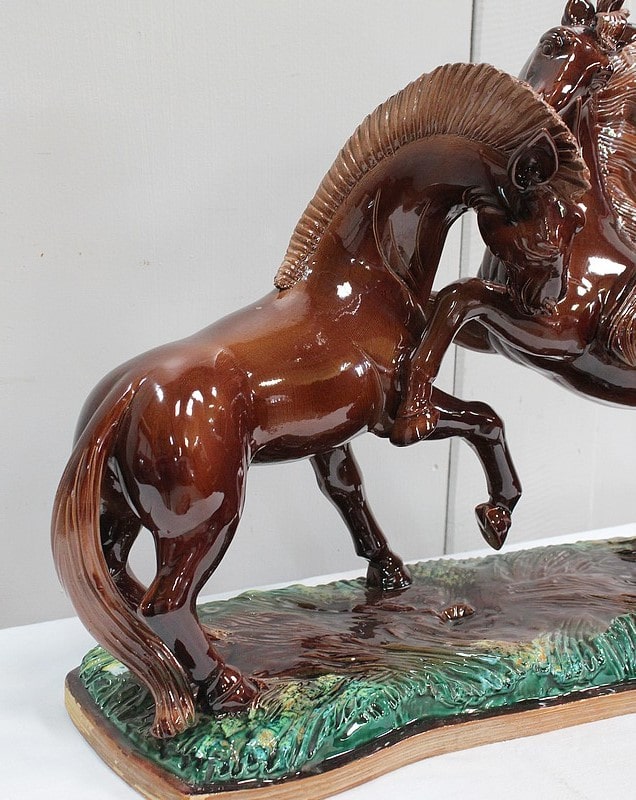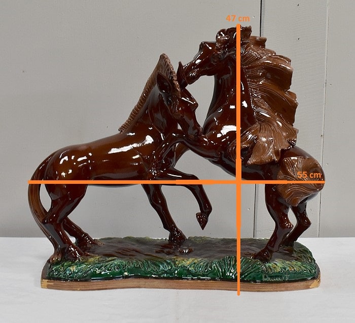 Les sabots de ce binôme reposent sur un socle à dominantes Verte et Marron, nuancées de Jaune, et façonné de manière à imiter une prairie herbue. Cet objet Décoratif animalier, d’une originalité intéressante, voit son socle gravé du nom de son créateur : ‘Prunet’.