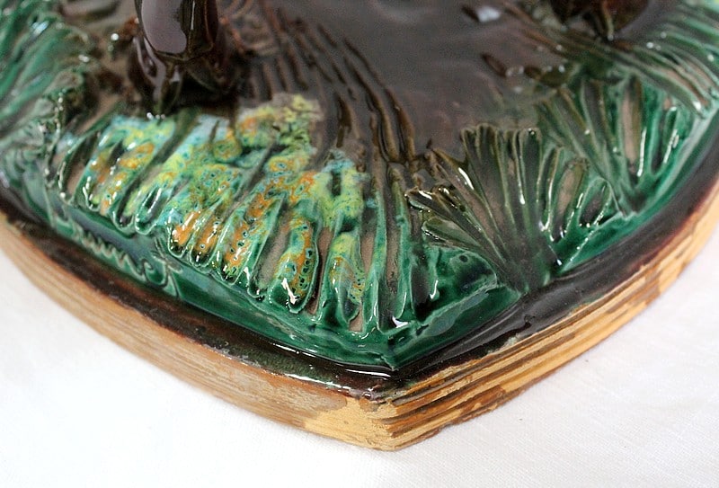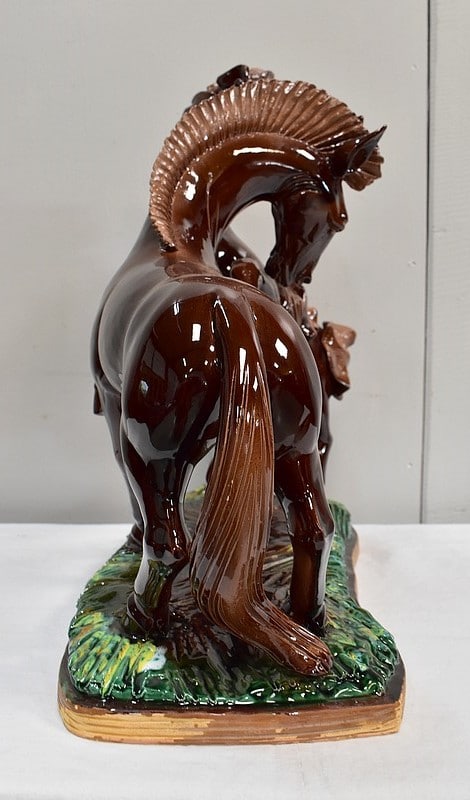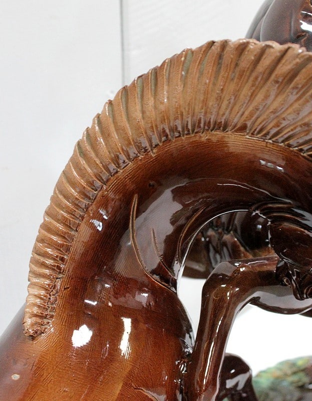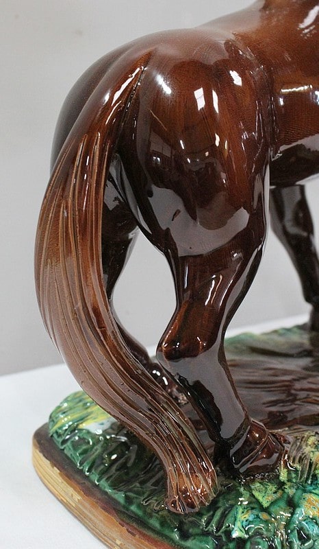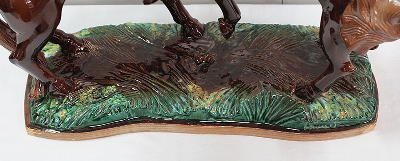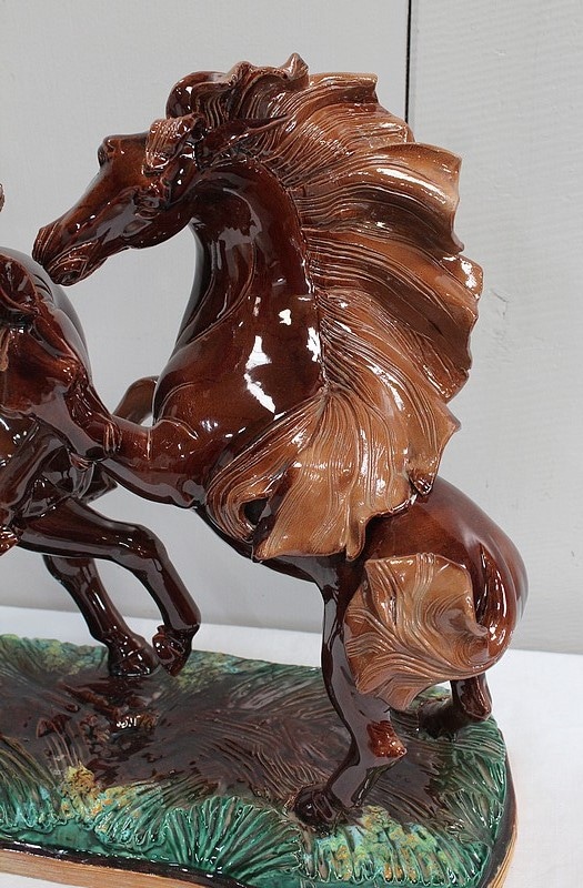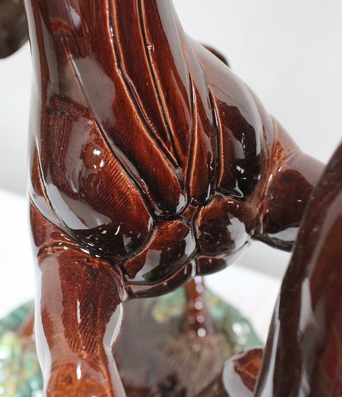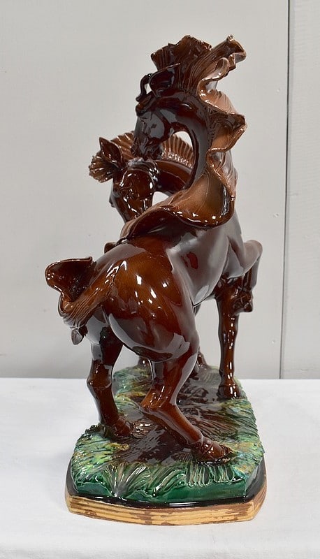Les sabots de ce binôme reposent sur un socle à dominantes Verte et Marron, nuancées de Jaune, et façonné de manière à imiter une prairie herbue. Cet objet Décoratif animalier, d’une originalité intéressante, voit son socle gravé du nom de son créateur : ‘Prunet’.