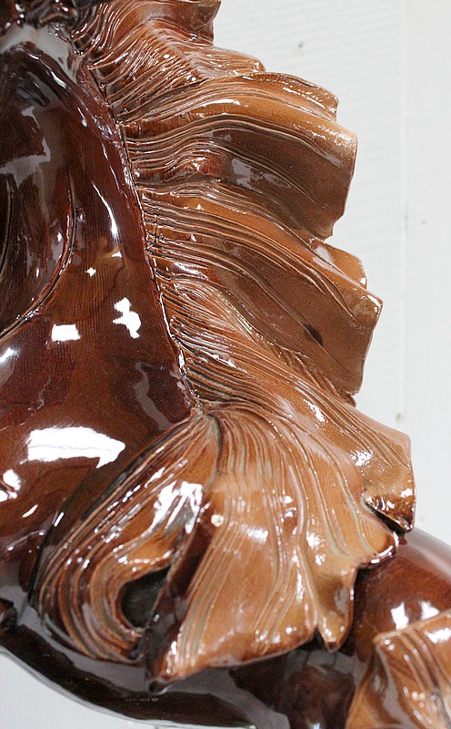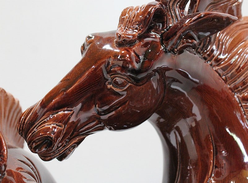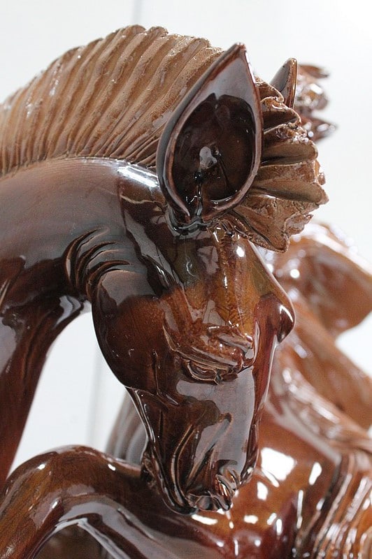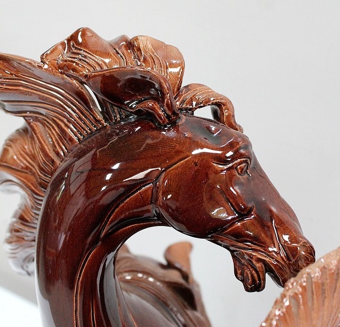 Cet objet Décoratif représente un couple de chevaux sauvages Mustang, aux robes Alezanes à jolis reflets. Cabrés sur leurs pattes arrières, ils paraissent presque enlacés l’un à l’autre. Le mâle, à la crinière Rousse volumineuse voir éparse, semble murmurer quelques mystères à l’oreille de sa femelle, plus sagement coiffée.