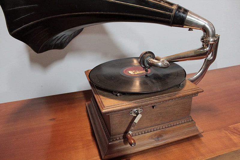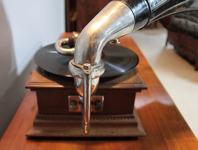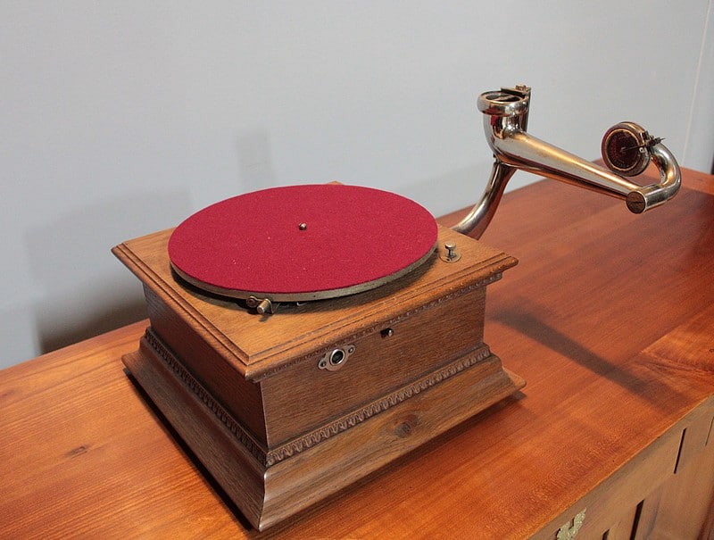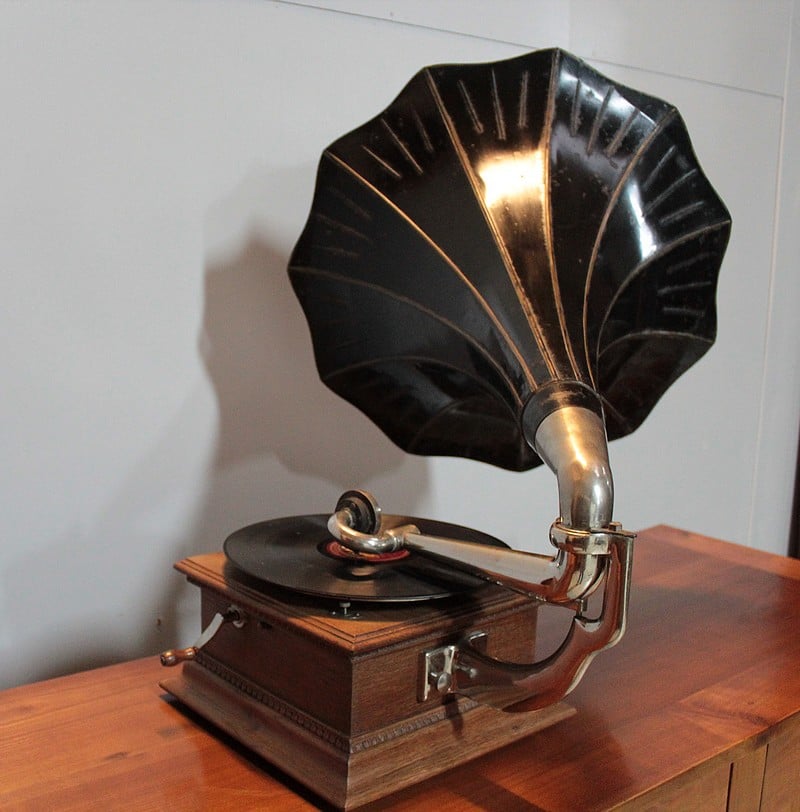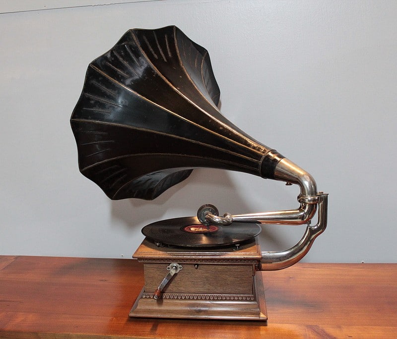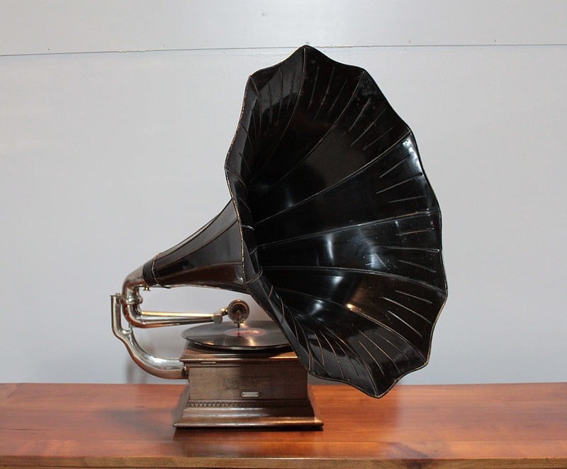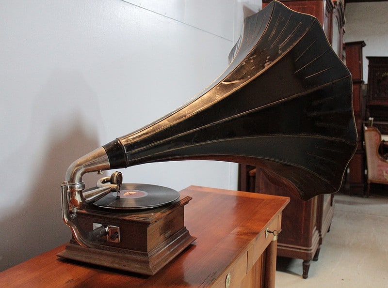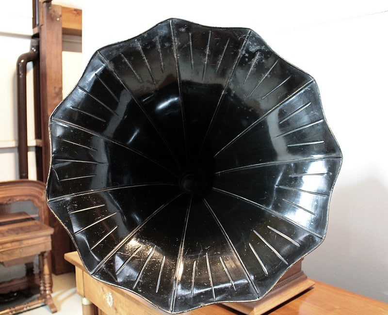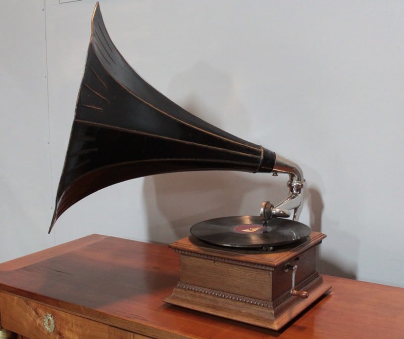 Gramophone à pavillon de marque française ‘Cie FRANCAISE du GRAMOPHONE – PARIS – Breveté SGDG en FRANCE et dans les principaux pays.