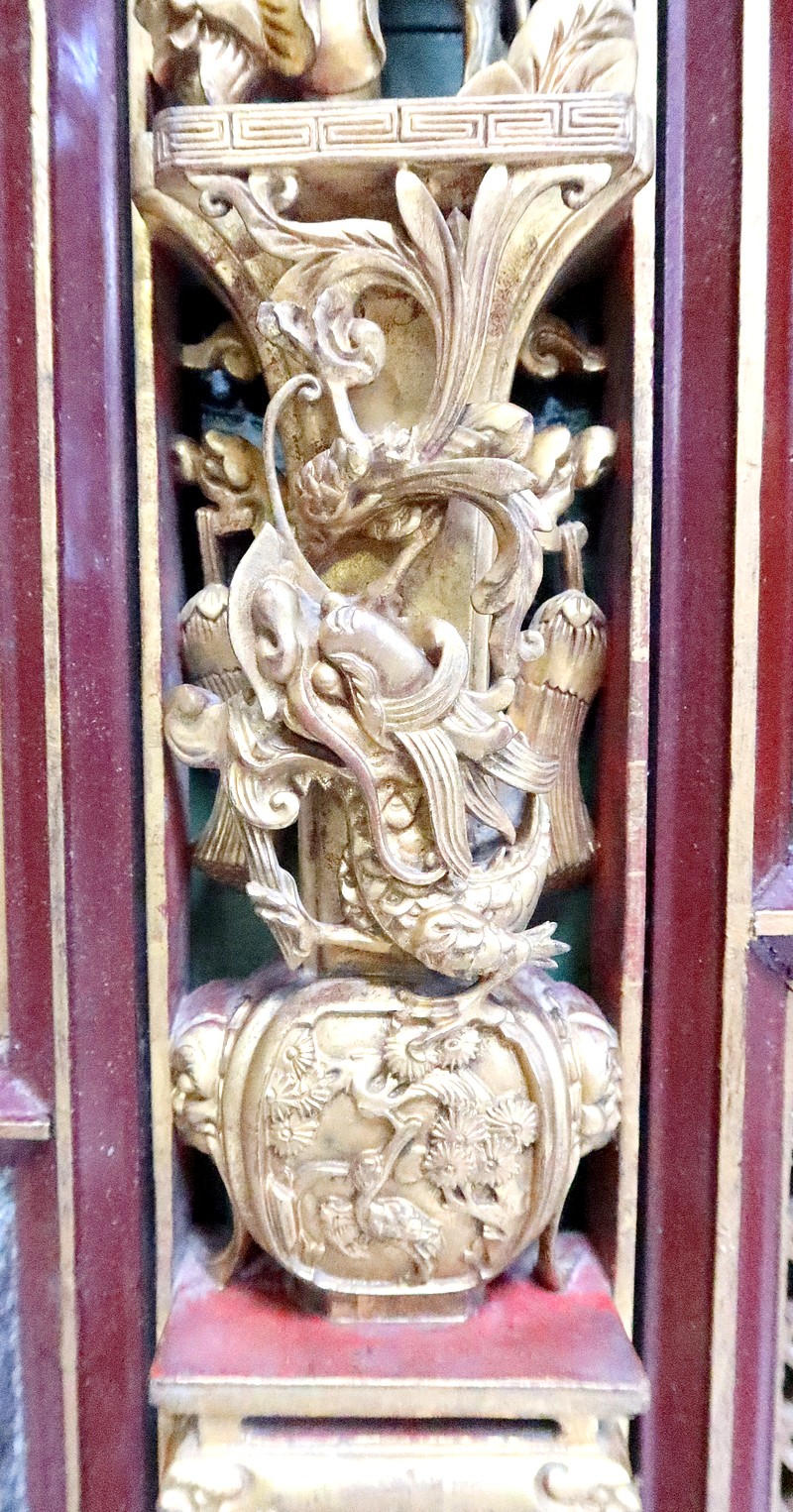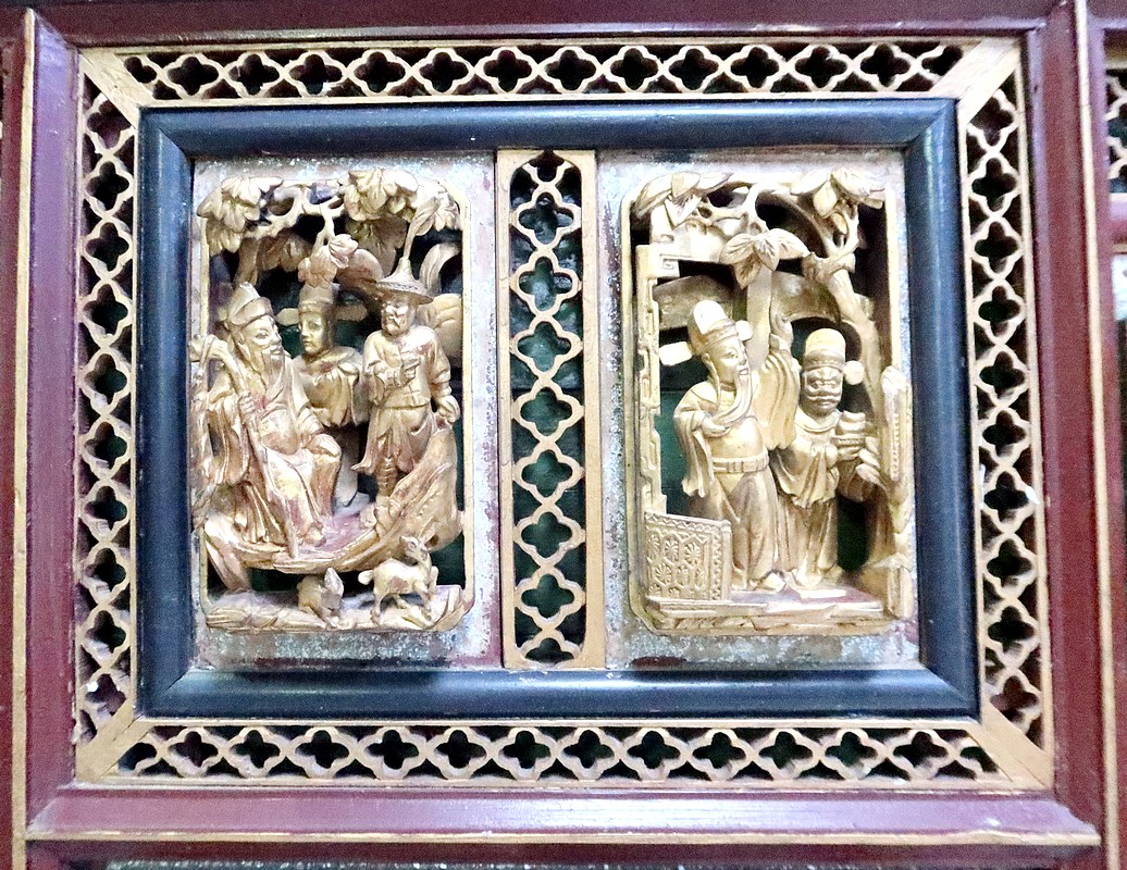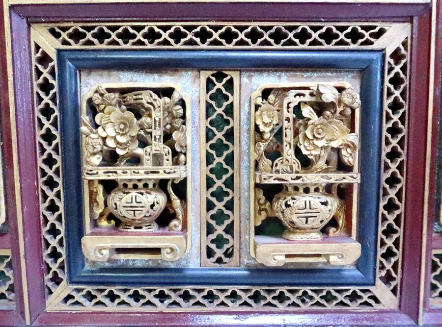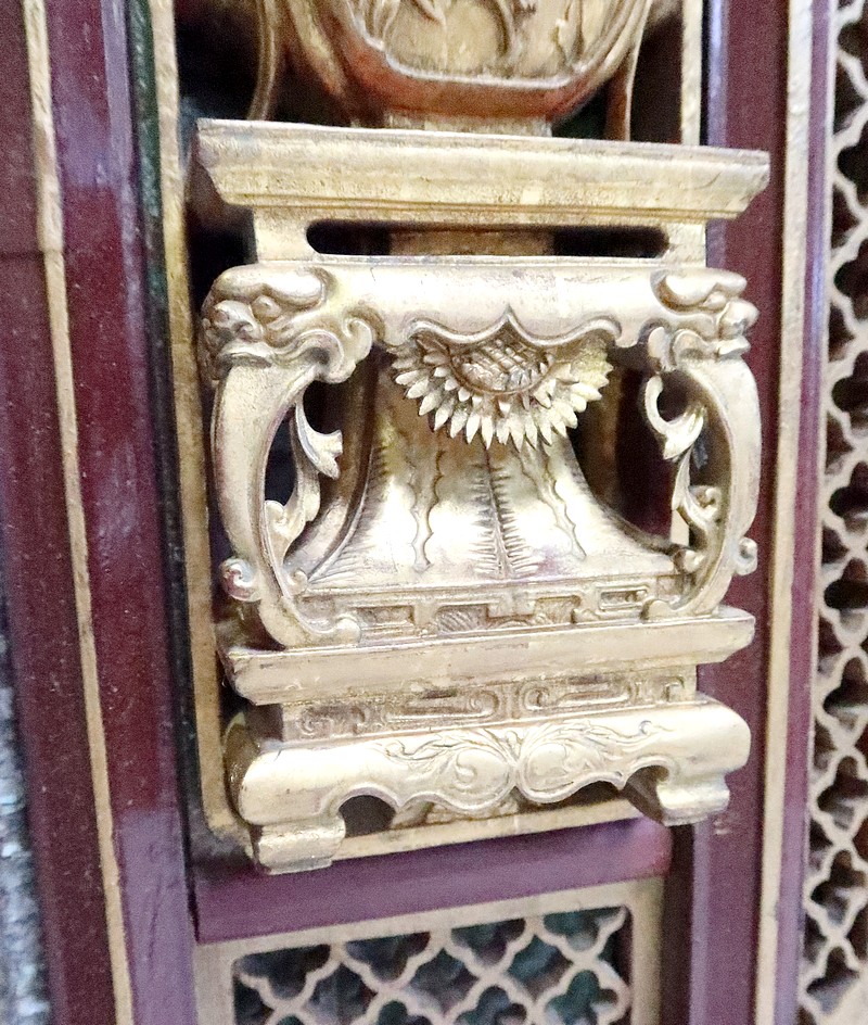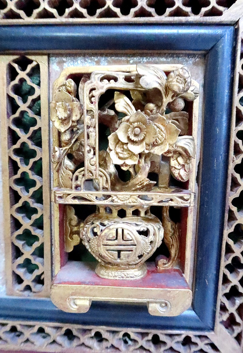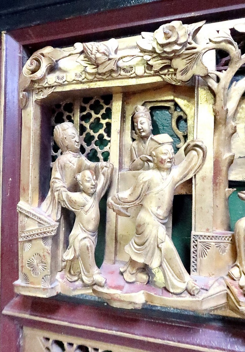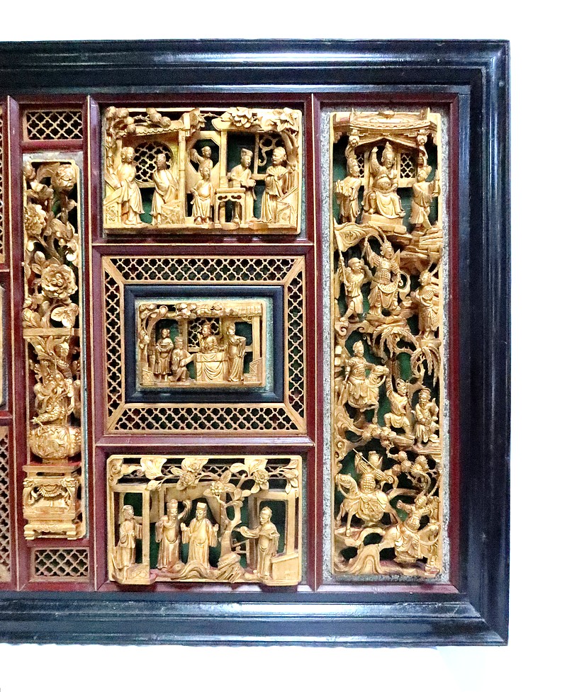 Ces scènes sont cloisonnées par des frises ajourées, des vases fleuris en cartouches, et des baguettes à arêtes dorées.