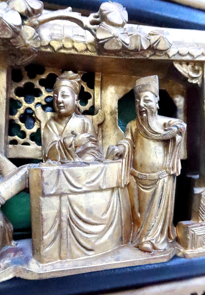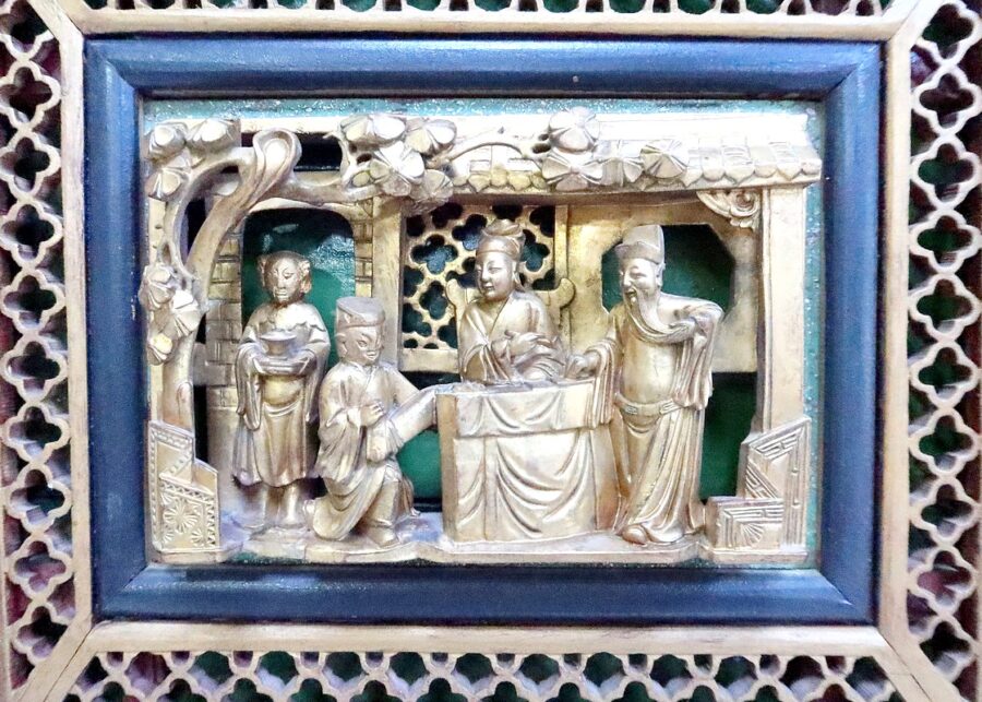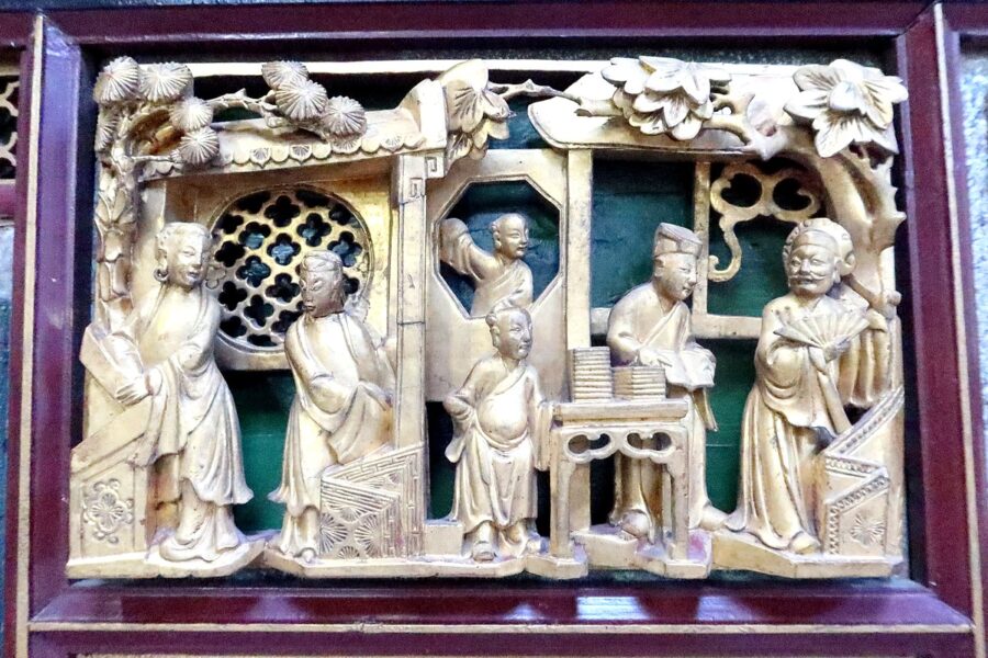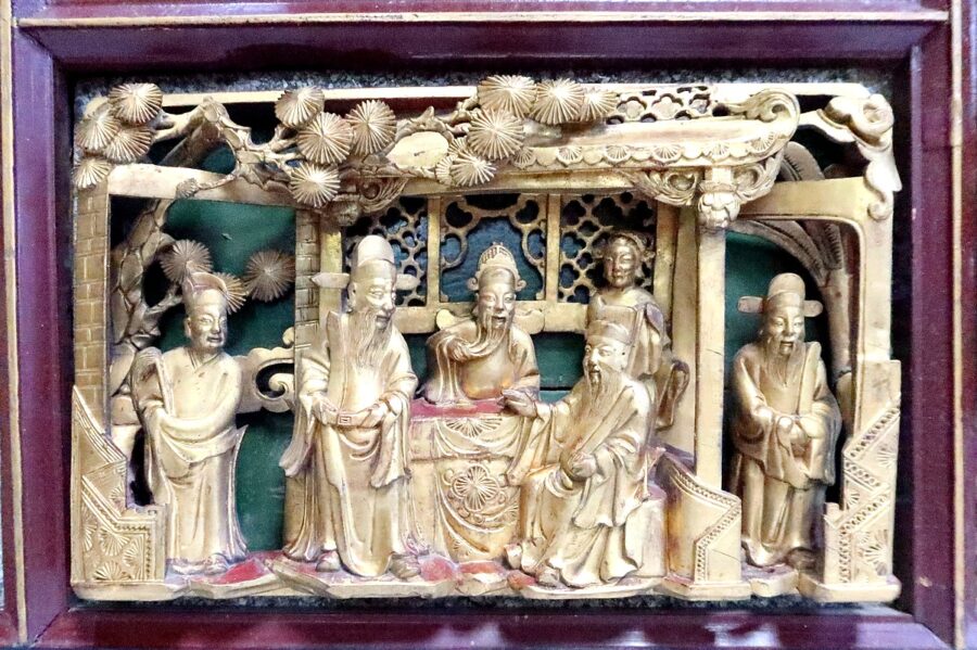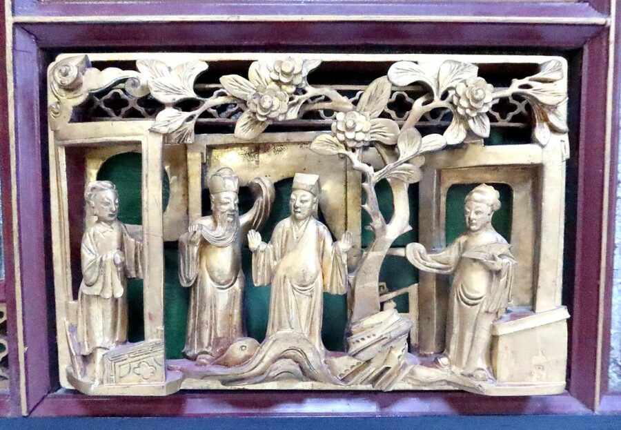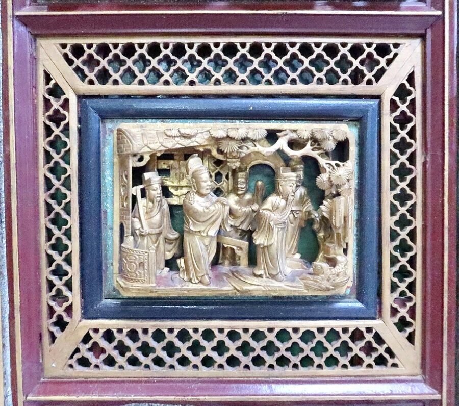 Ses nombreux décors Asiatiques représentent des personnages en tenues traditionnelles, bataillant, ou s’animant dans des activités de la vie quotidienne, au cœur de jardins arborés.