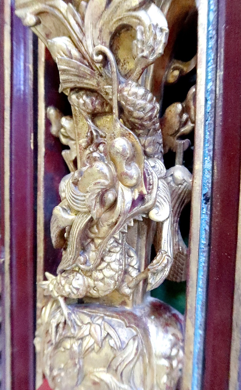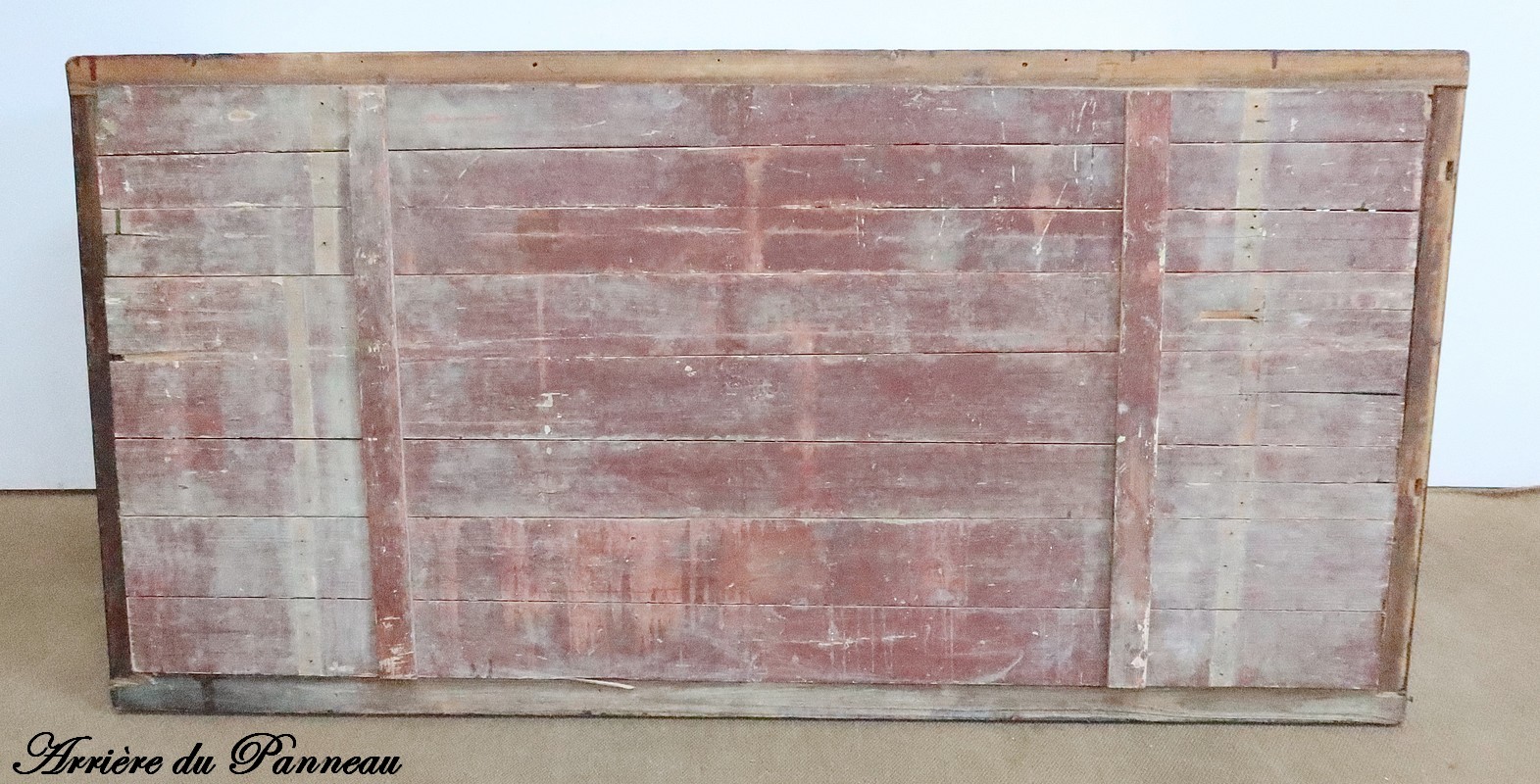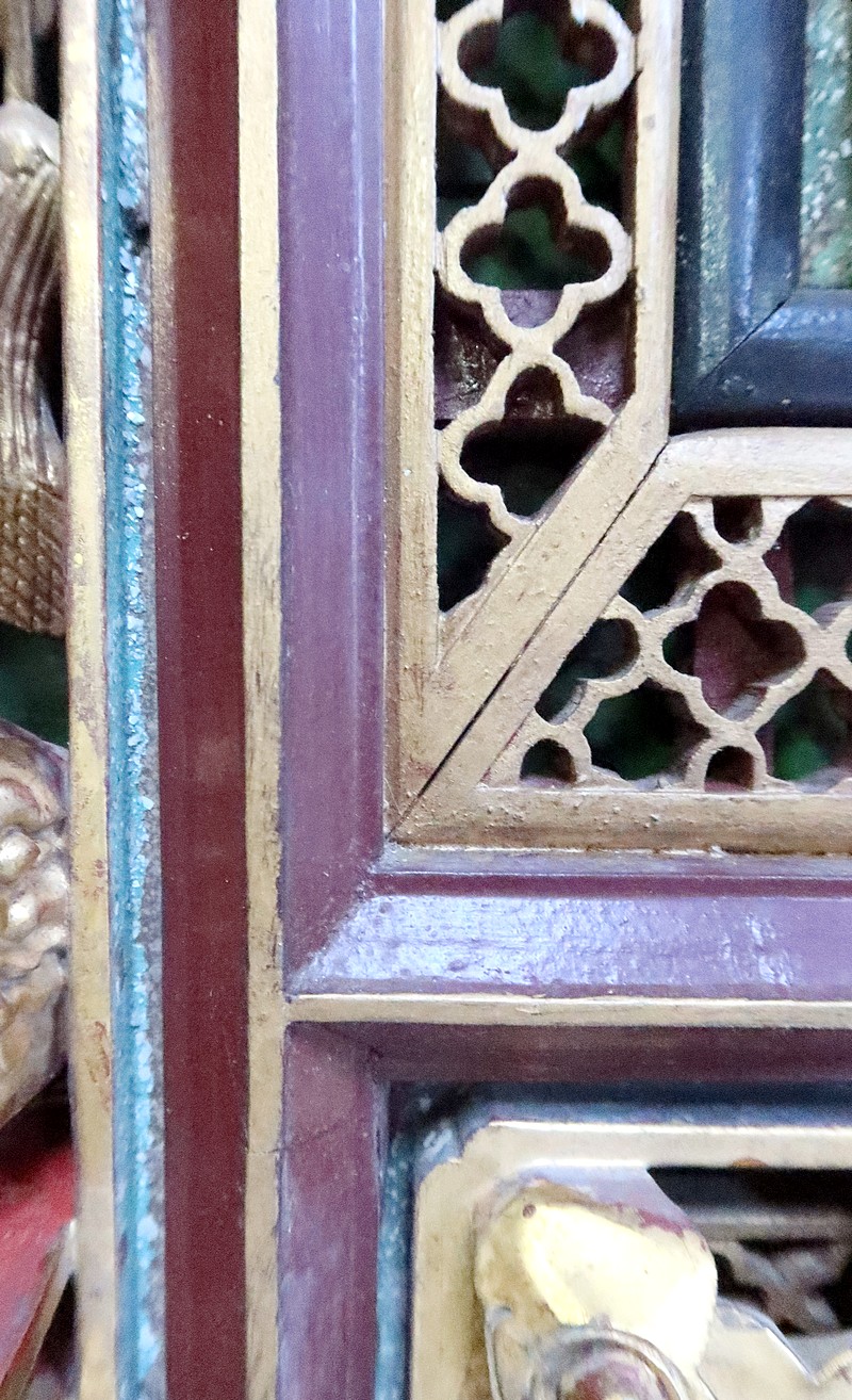 Grand Panneau rectangulaire en bois laqué or, bordeaux et noir.