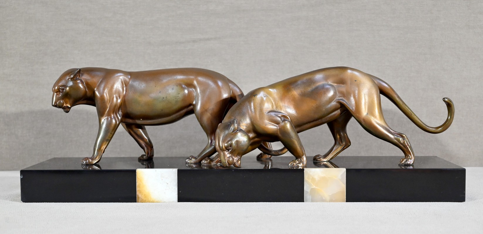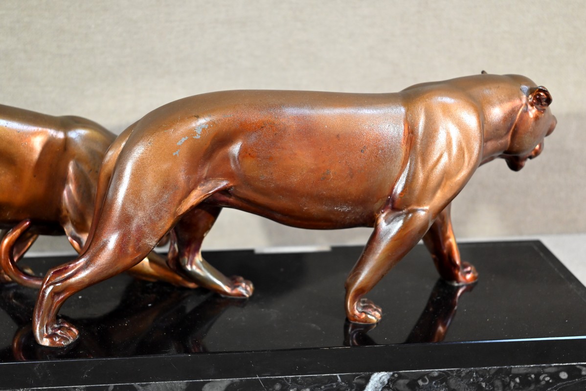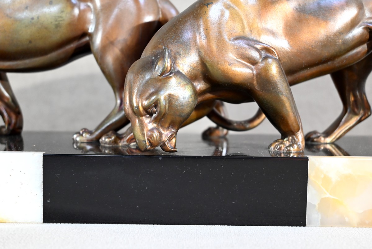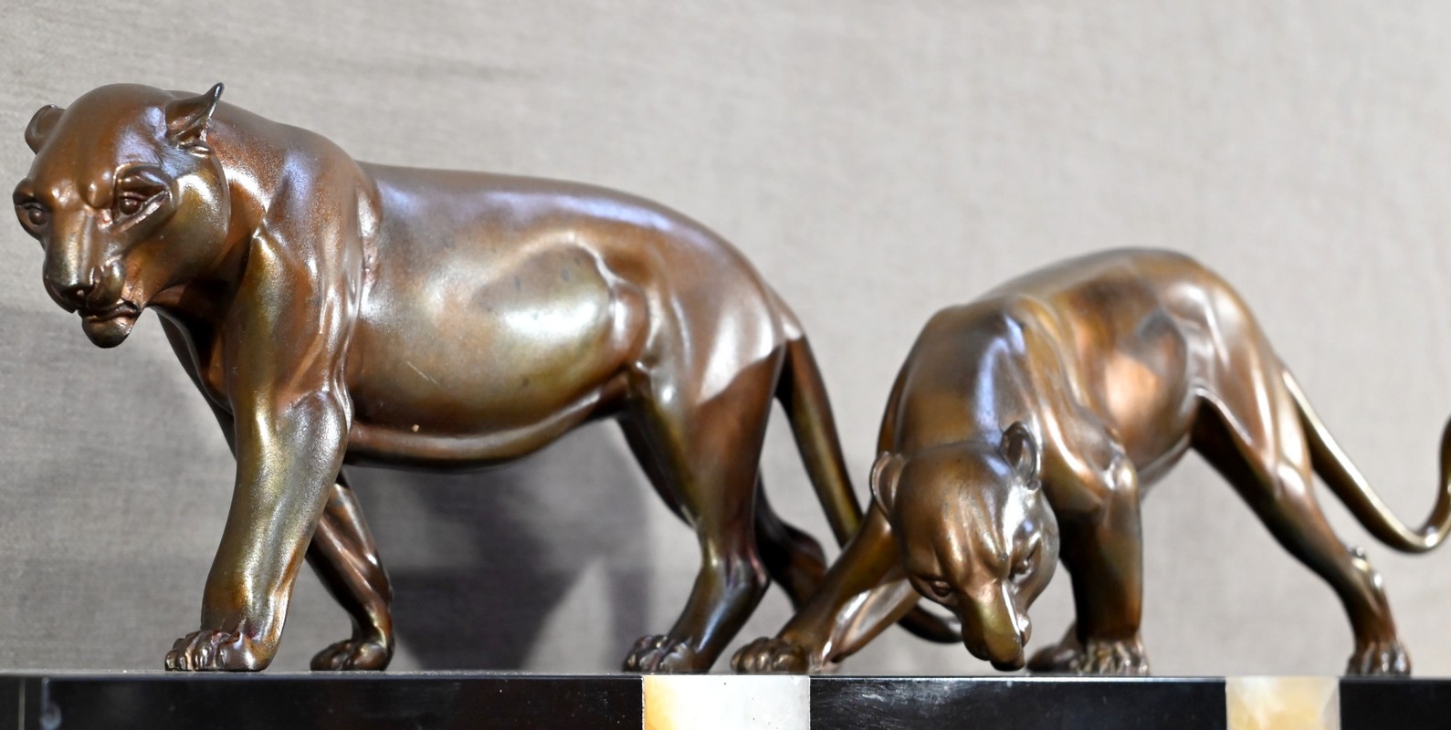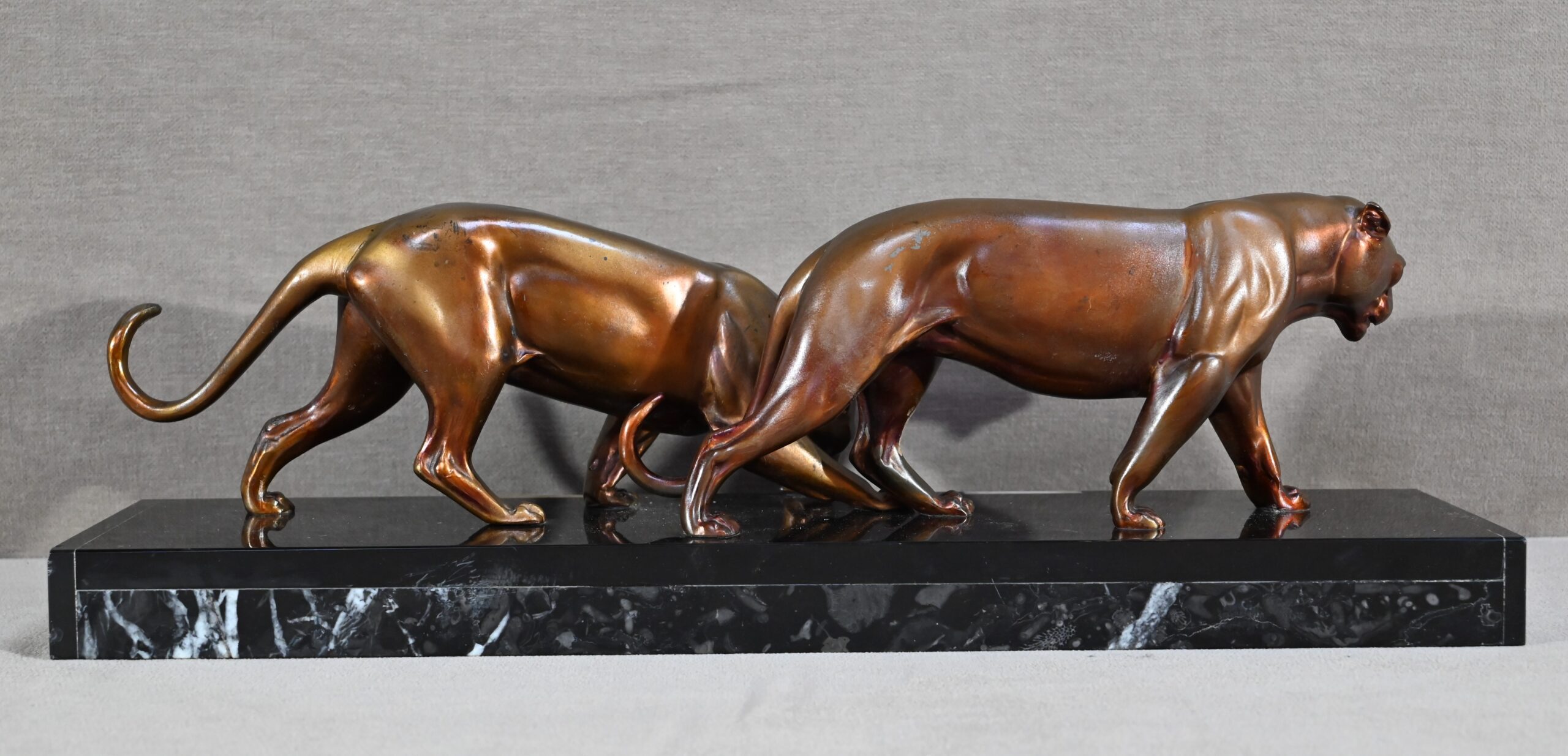 Cette œuvre figurative représente deux félins, aux puissants corps, avançant au pas.