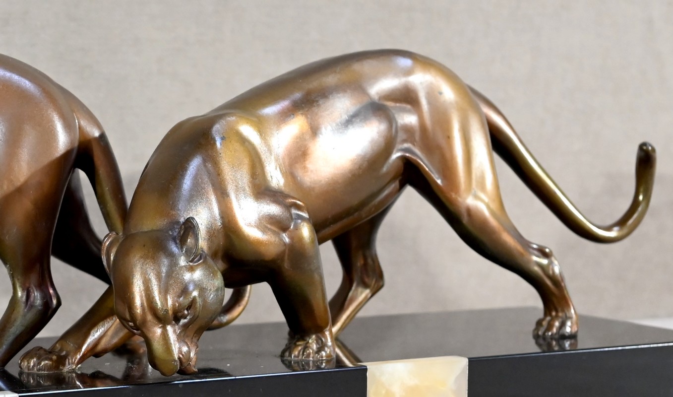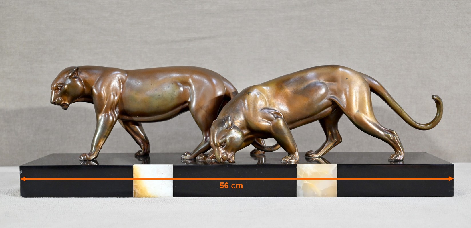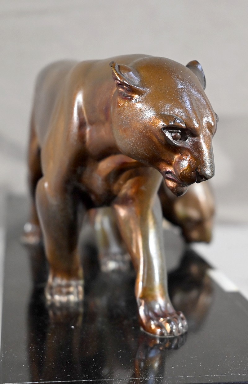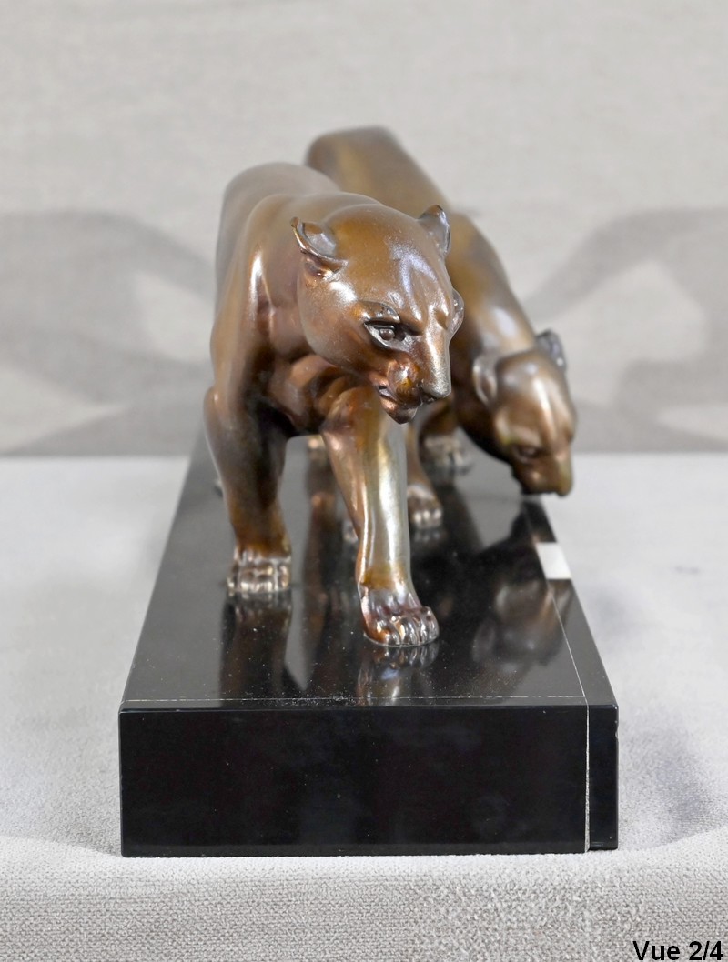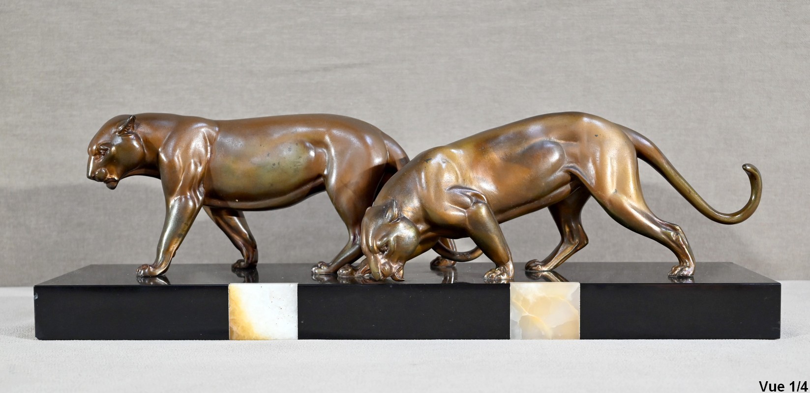 Cette œuvre figurative représente deux félins, aux puissants corps, avançant au pas.