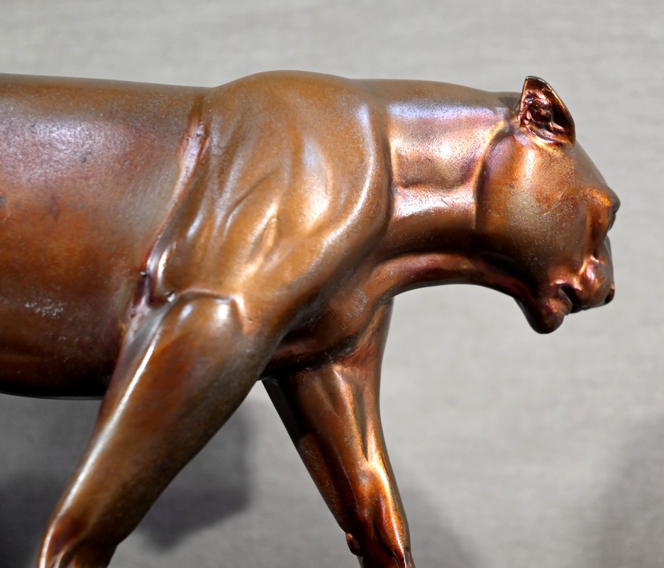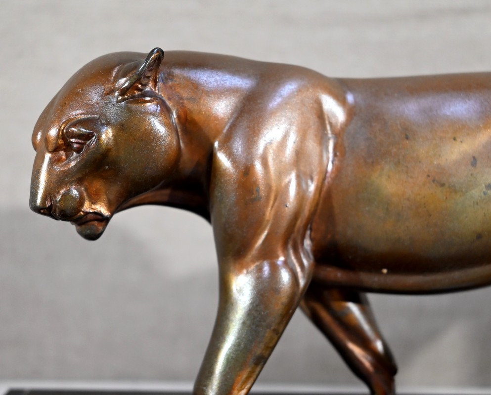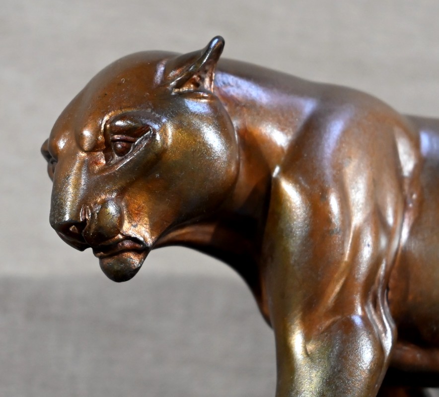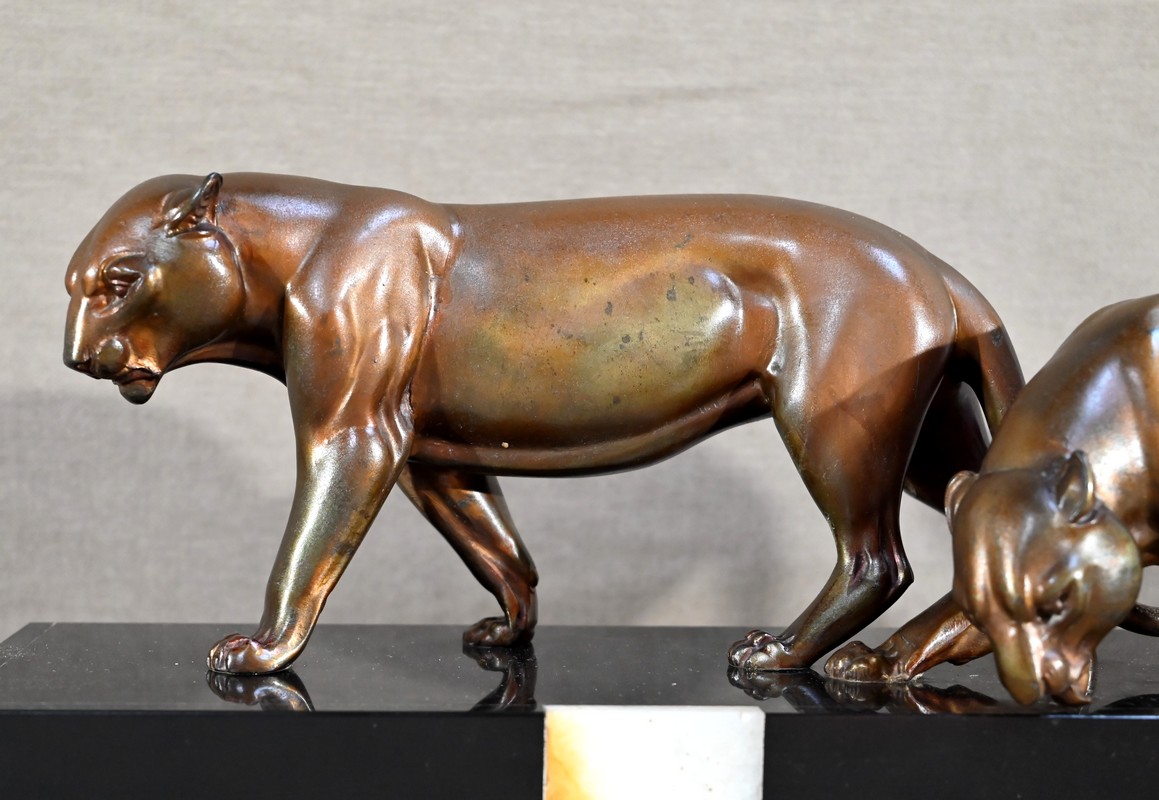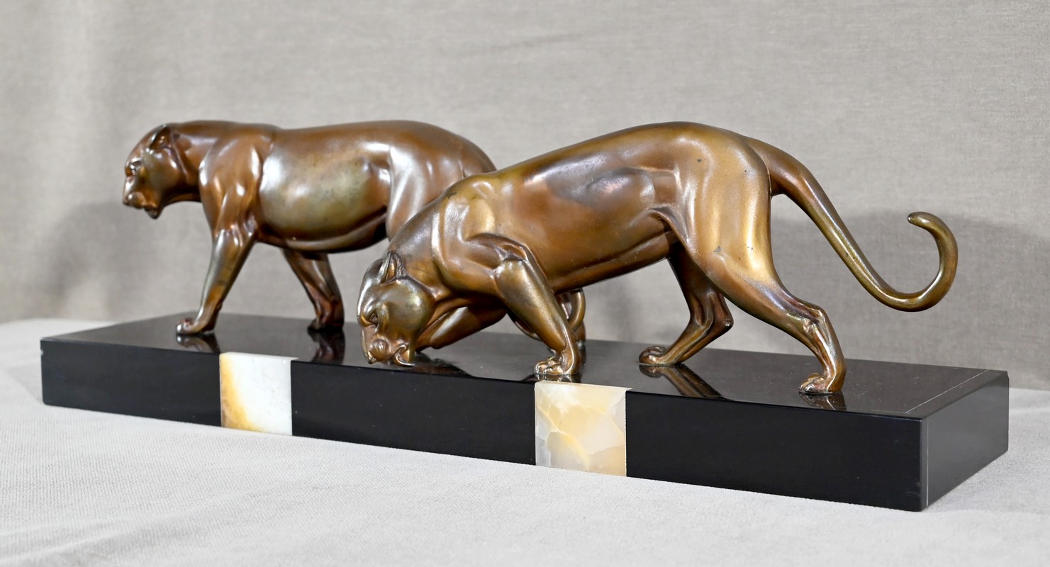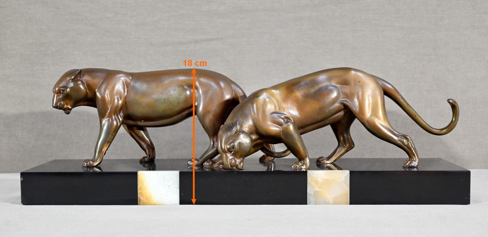 Cette œuvre figurative représente deux félins, aux puissants corps, avançant au pas.