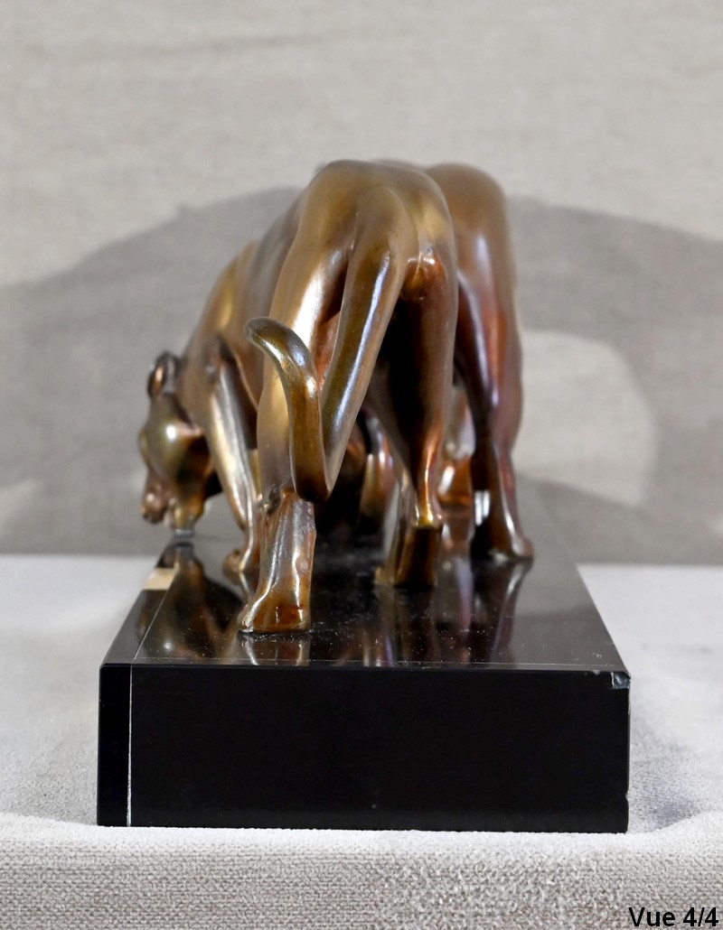Groupe de Lionnes en régule à patine nuancée de couleurs brune, bronze et dorée.