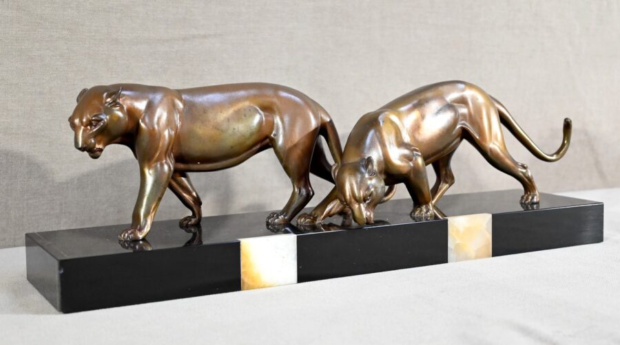 Cette œuvre figurative représente deux félins, aux puissants corps, avançant au pas.