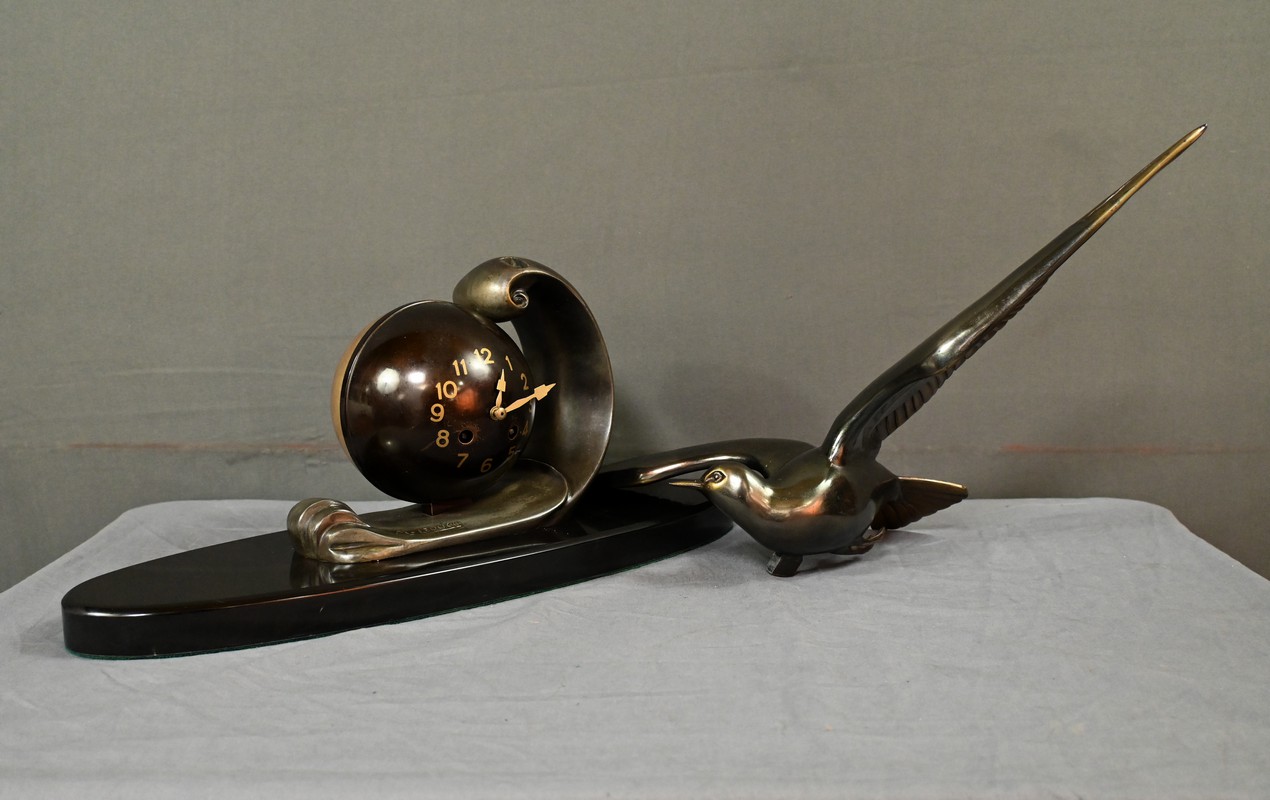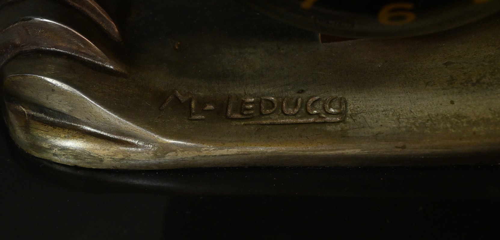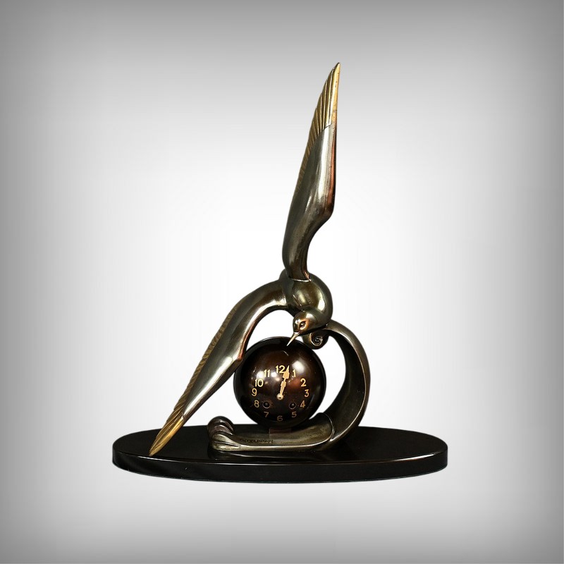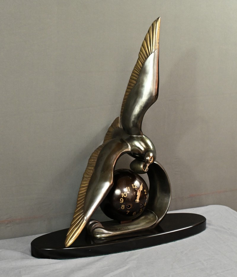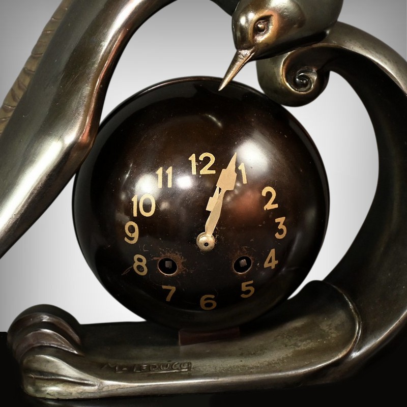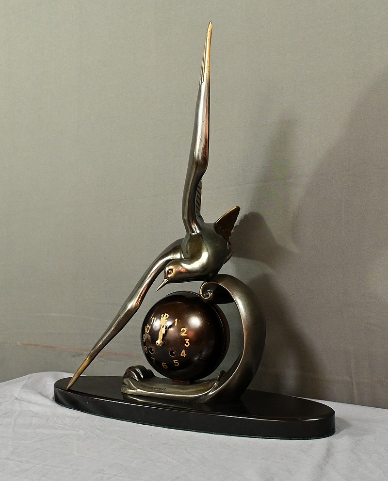 Cette horloge Art déco en régule à double patine, signée M. Leducq, est une œuvre qui marie avec finesse l’élégance sculpturale et la fonctionnalité du temps. Elle se présente comme une composition dynamique, où chaque élément s’assemble dans un équilibre parfait. Au sommet de la pièce, une mouette stylisée est figée dans un mouvement de descente, ailes déployées, comme si elle s’apprêtait à se poser. Sa posture évoque la grâce du vol et la puissance maîtrisée, caractéristiques souvent célébrées dans l’esthétique Art déco. Sous l’oiseau, une sphère abrite le cadran de l’horloge. Celui-ci est orné de chiffres arabes dorés et d’aiguilles assorties, apportant une touche de raffinement et de contraste. La sphère semble flotter au cœur d’une vague incurvée. Ce socle évoque le mouvement de l’eau, renforçant l’impression de fluidité et de légèreté. L’ensemble repose sur un support ovale noir brillant, qui ancre la composition tout en mettant en valeur les lignes épurées de la sculpture. La signature de M. Leducq confère à cette pièce une valeur artistique certaine, témoignant du savoir-faire et de la sensibilité du créateur.