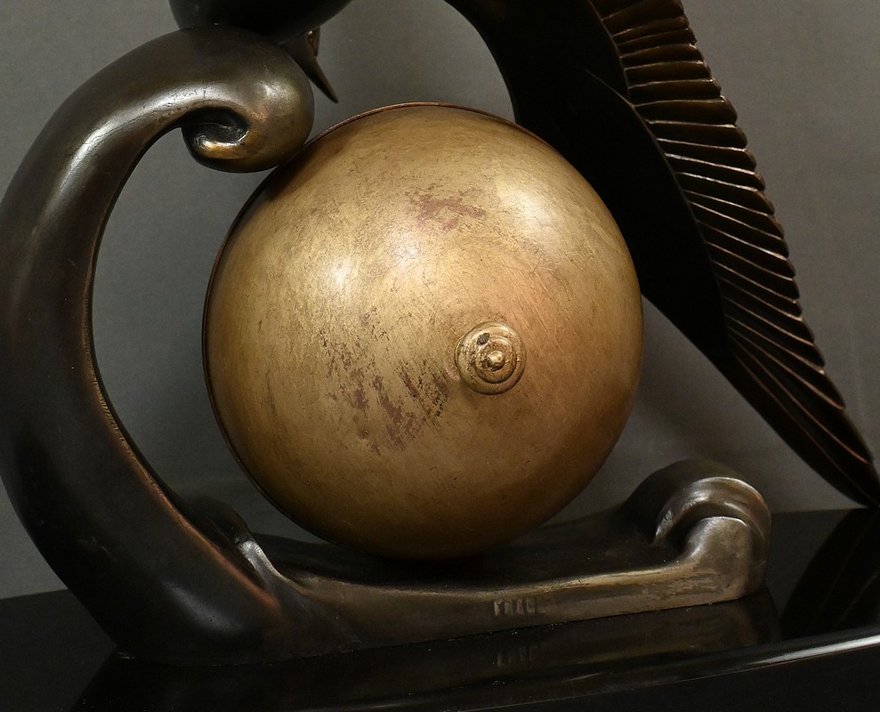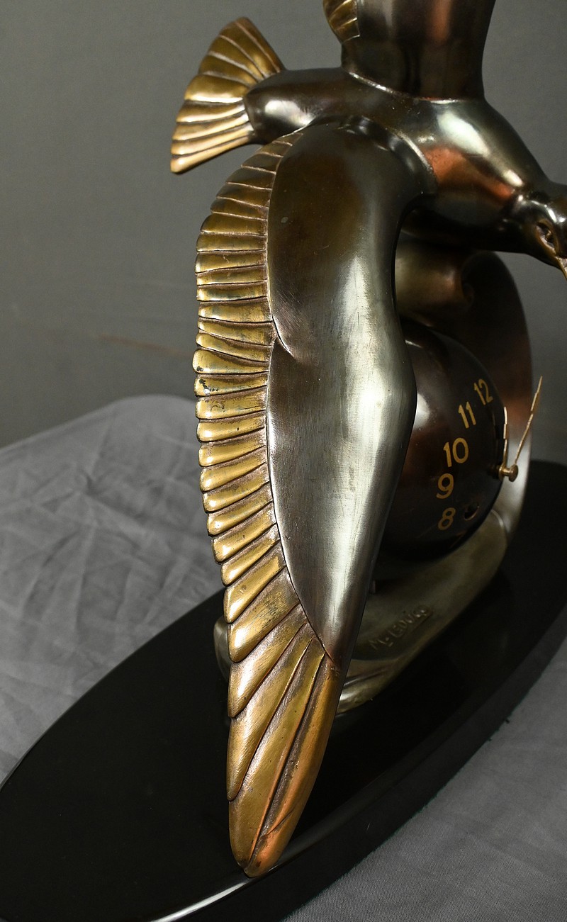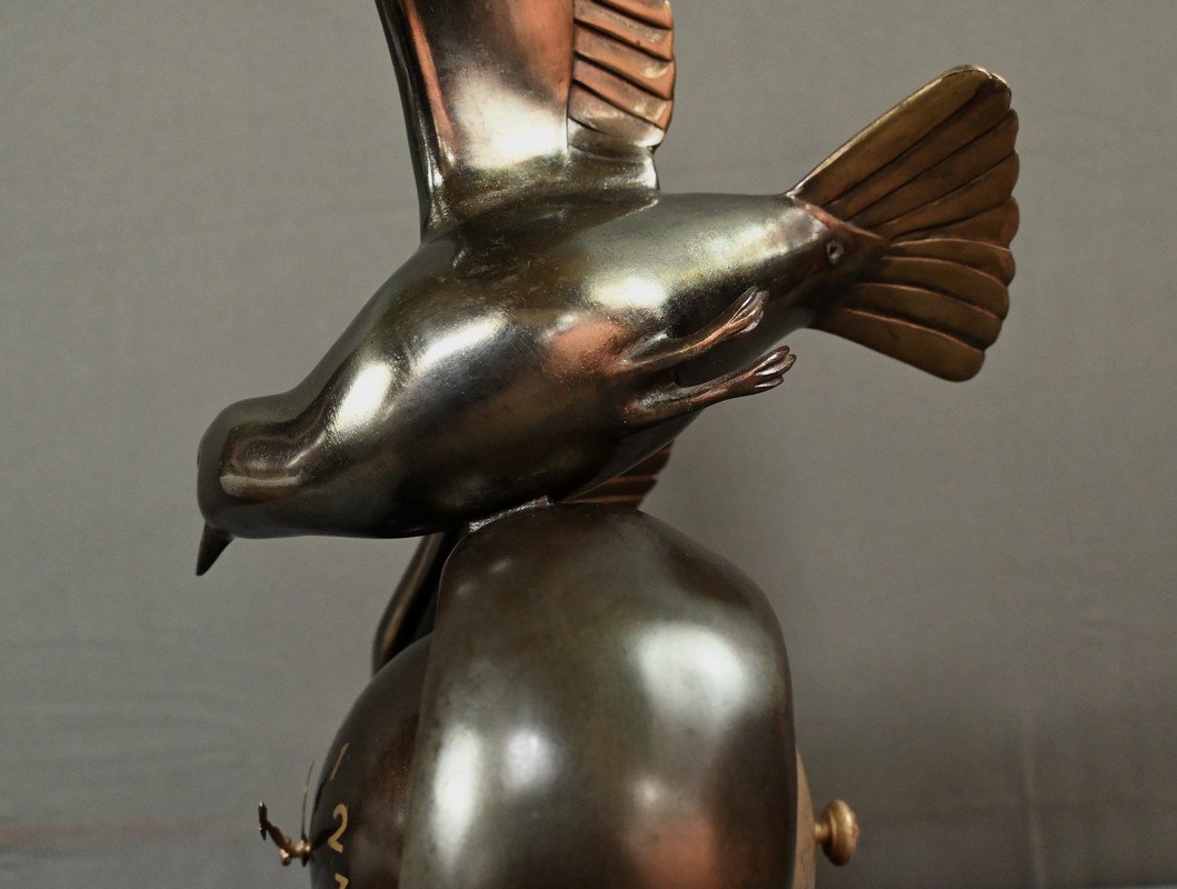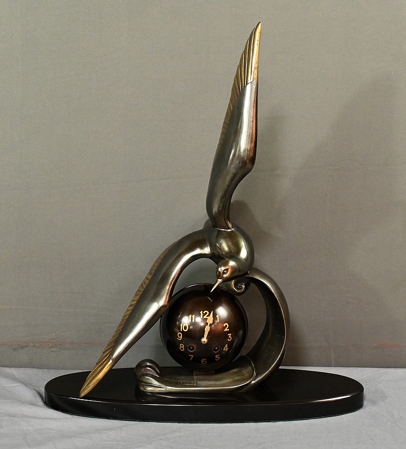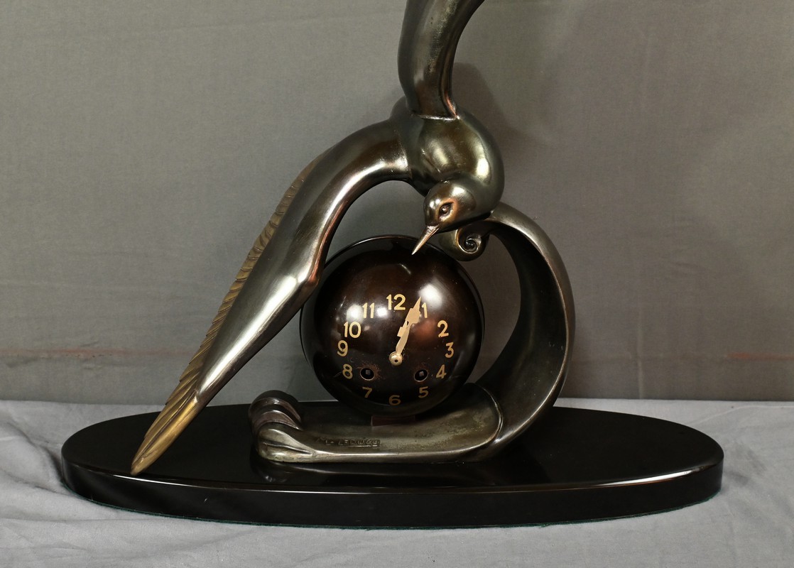 Cette horloge Art déco en régule à double patine, signée M. Leducq, est une œuvre qui marie avec finesse l’élégance sculpturale et la fonctionnalité du temps. Elle se présente comme une composition dynamique, où chaque élément s’assemble dans un équilibre parfait. Au sommet de la pièce, une mouette stylisée est figée dans un mouvement de descente, ailes déployées, comme si elle s’apprêtait à se poser. Sa posture évoque la grâce du vol et la puissance maîtrisée, caractéristiques souvent célébrées dans l’esthétique Art déco. Sous l’oiseau, une sphère abrite le cadran de l’horloge. Celui-ci est orné de chiffres arabes dorés et d’aiguilles assorties, apportant une touche de raffinement et de contraste. La sphère semble flotter au cœur d’une vague incurvée. Ce socle évoque le mouvement de l’eau, renforçant l’impression de fluidité et de légèreté. L’ensemble repose sur un support ovale noir brillant, qui ancre la composition tout en mettant en valeur les lignes épurées de la sculpture. La signature de M. Leducq confère à cette pièce une valeur artistique certaine, témoignant du savoir-faire et de la sensibilité du créateur.