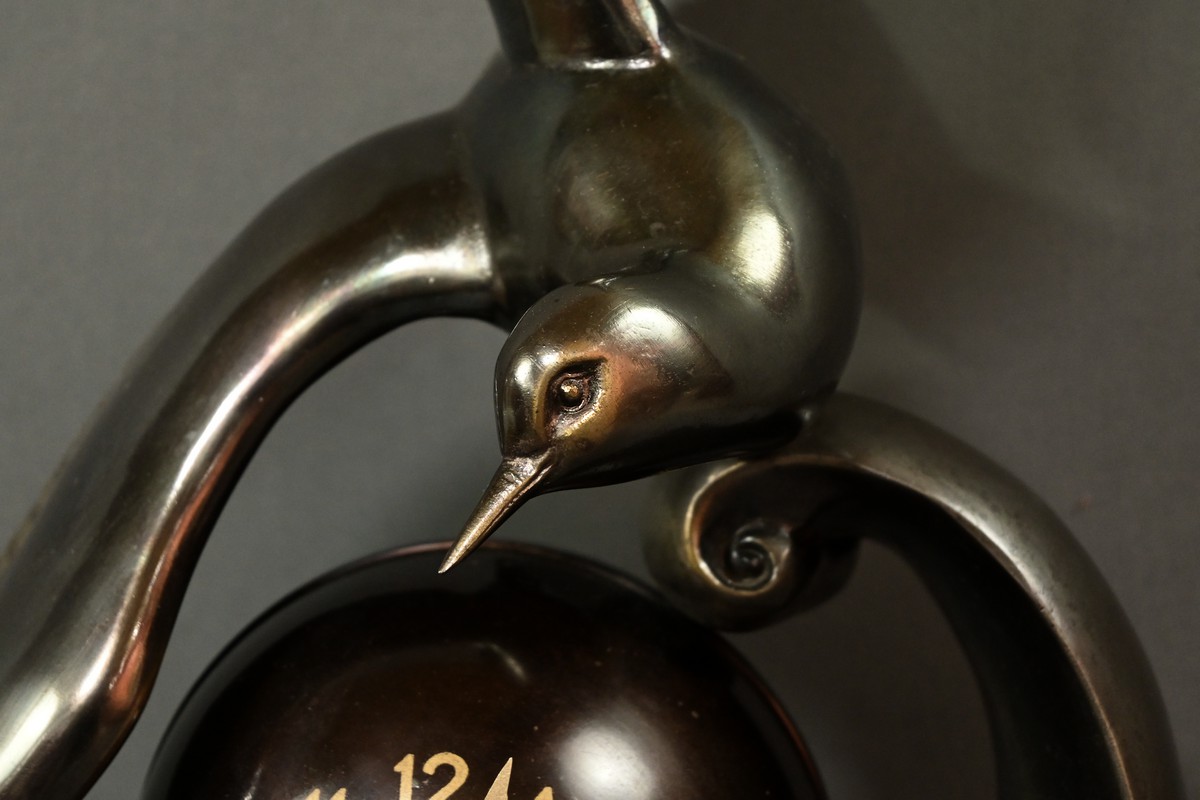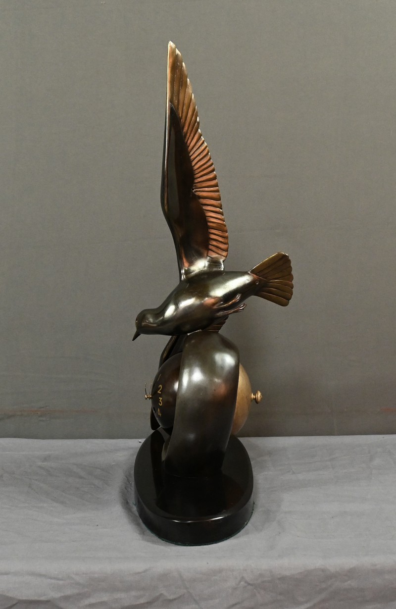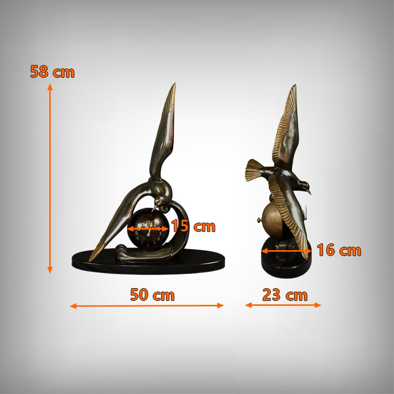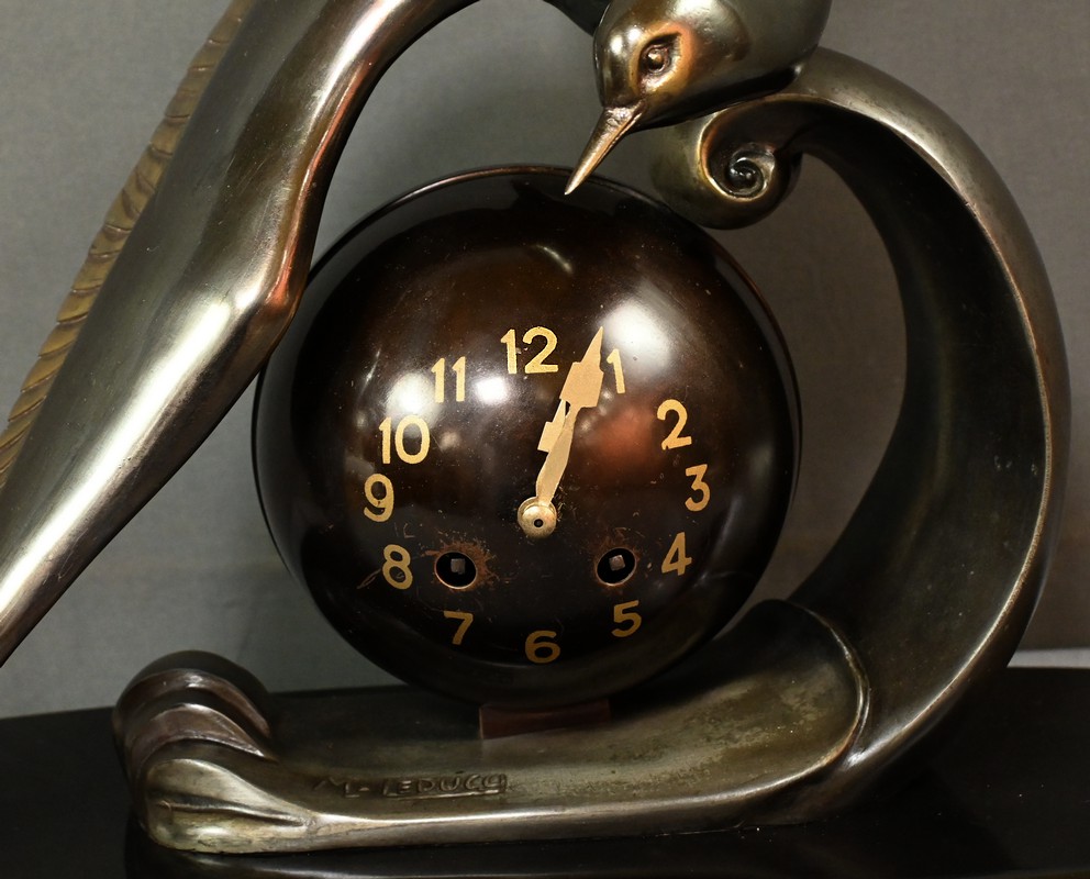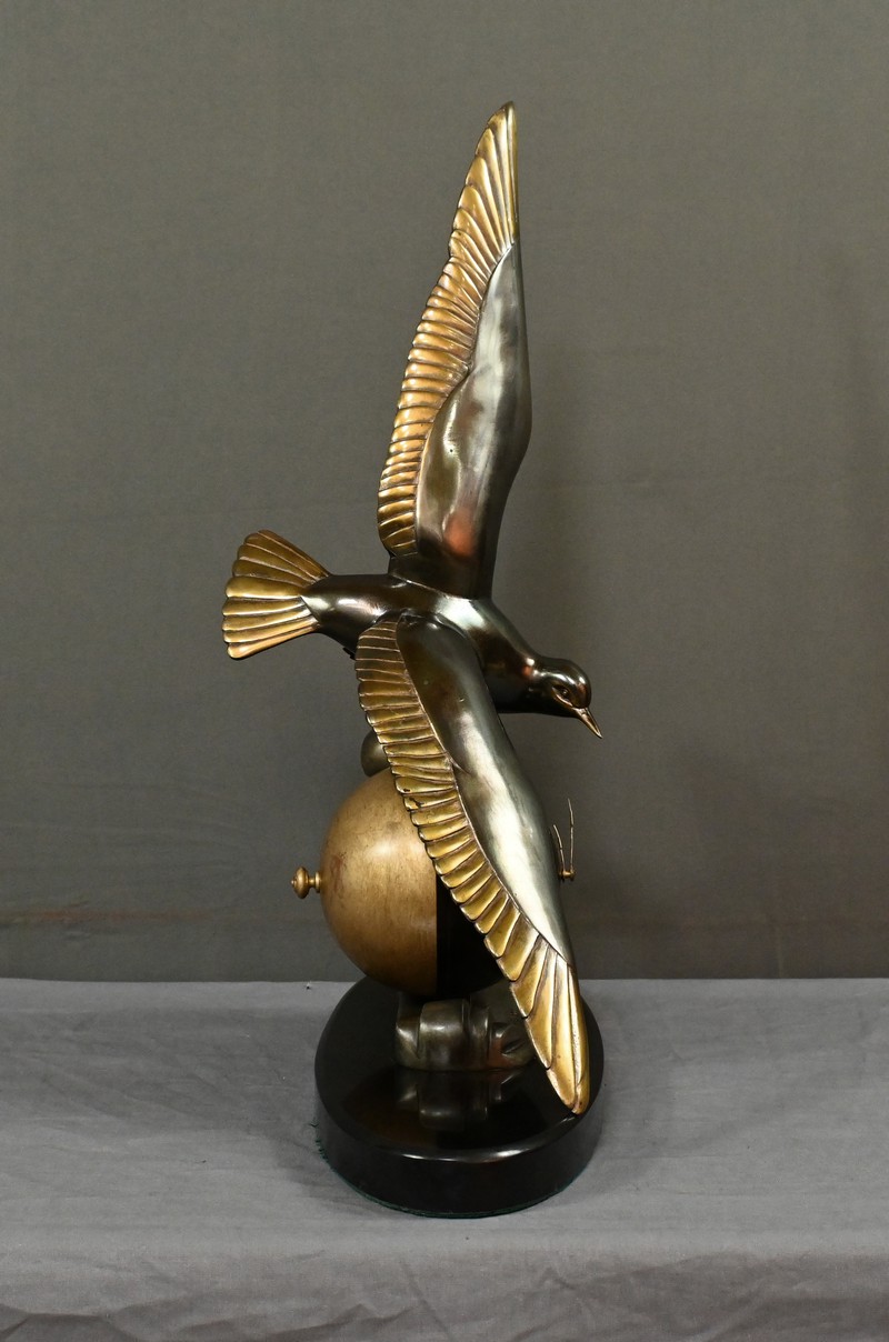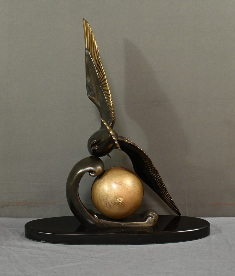 Cette horloge Art déco en régule à double patine, signée M. Leducq, est une œuvre qui marie avec finesse l’élégance sculpturale et la fonctionnalité du temps. Elle se présente comme une composition dynamique, où chaque élément s’assemble dans un équilibre parfait. Au sommet de la pièce, une mouette stylisée est figée dans un mouvement de descente, ailes déployées, comme si elle s’apprêtait à se poser. Sa posture évoque la grâce du vol et la puissance maîtrisée, caractéristiques souvent célébrées dans l’esthétique Art déco. Sous l’oiseau, une sphère abrite le cadran de l’horloge. Celui-ci est orné de chiffres arabes dorés et d’aiguilles assorties, apportant une touche de raffinement et de contraste. La sphère semble flotter au cœur d’une vague incurvée. Ce socle évoque le mouvement de l’eau, renforçant l’impression de fluidité et de légèreté. L’ensemble repose sur un support ovale noir brillant, qui ancre la composition tout en mettant en valeur les lignes épurées de la sculpture. La signature de M. Leducq confère à cette pièce une valeur artistique certaine, témoignant du savoir-faire et de la sensibilité du créateur.