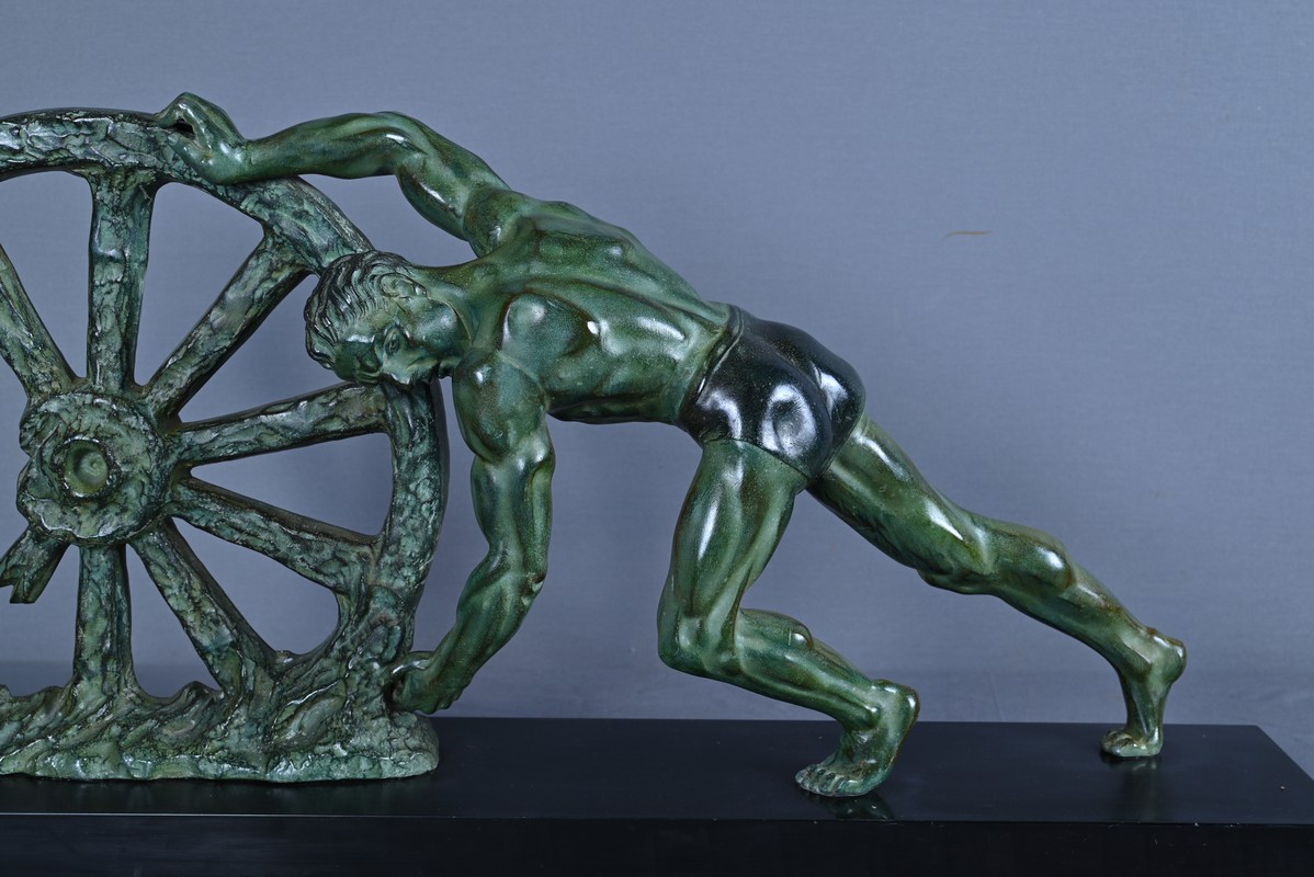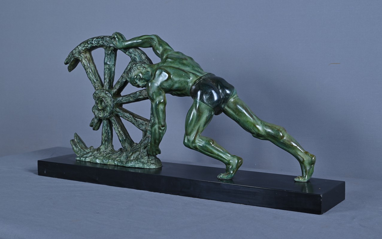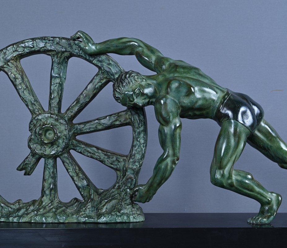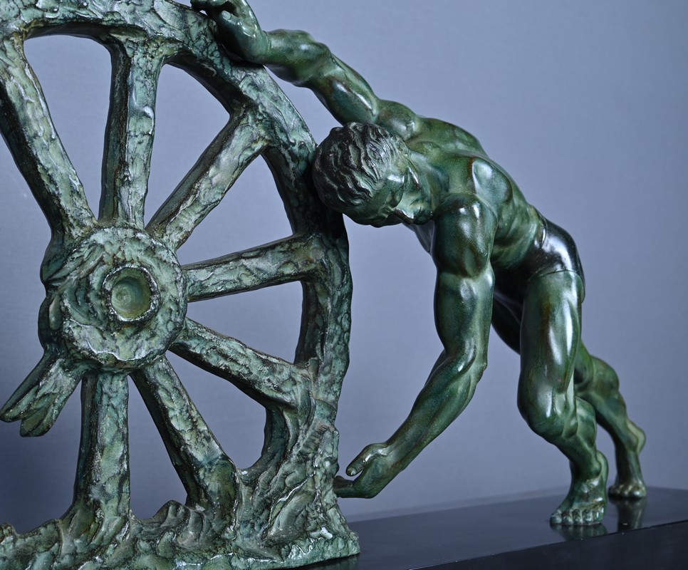 Sculpture monumentale en bronze à patine verte nuancée, représentant un homme athlétique en pleine tension, arc-bouté contre une roue brisée. Le corps puissant, tendu dans l’effort, évoque la force humaine confrontée à l’adversité mécanique. Le mouvement est saisi avec une intensité dramatique : jambes écartées, bras tendus, torse contracté, chaque muscle semble animé par la volonté de vaincre l’obstacle.