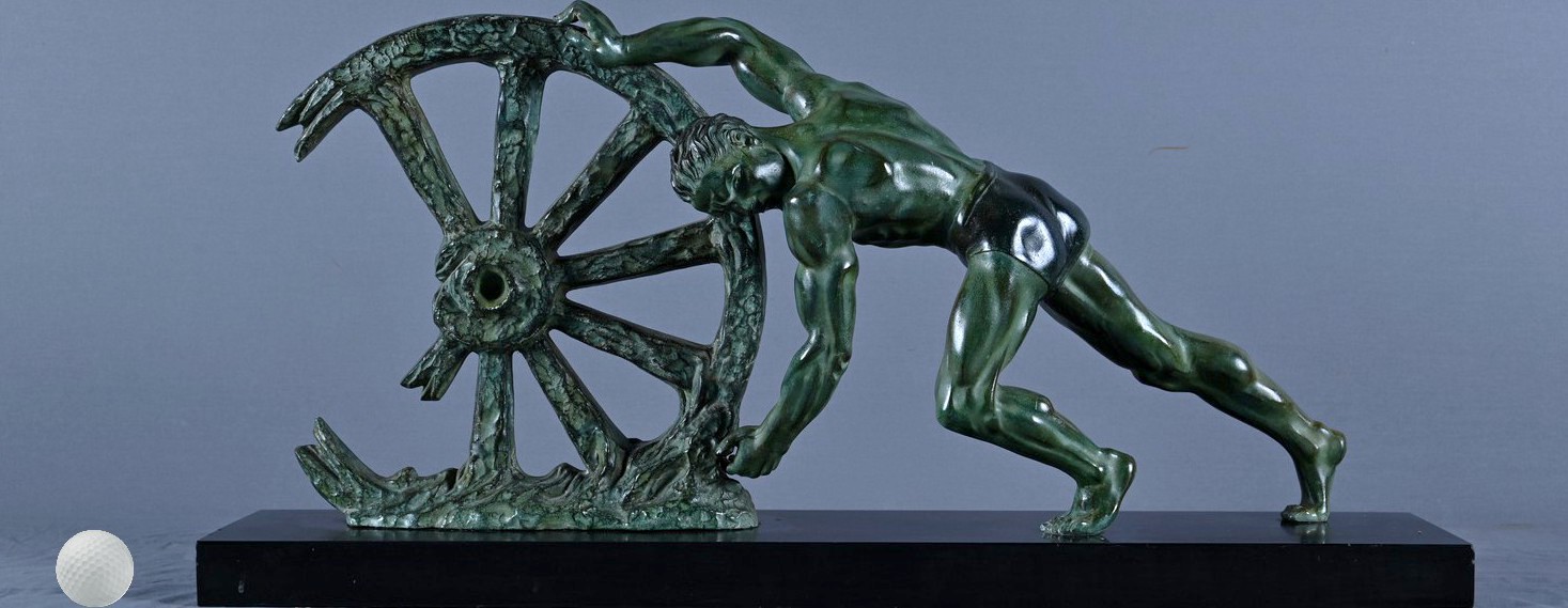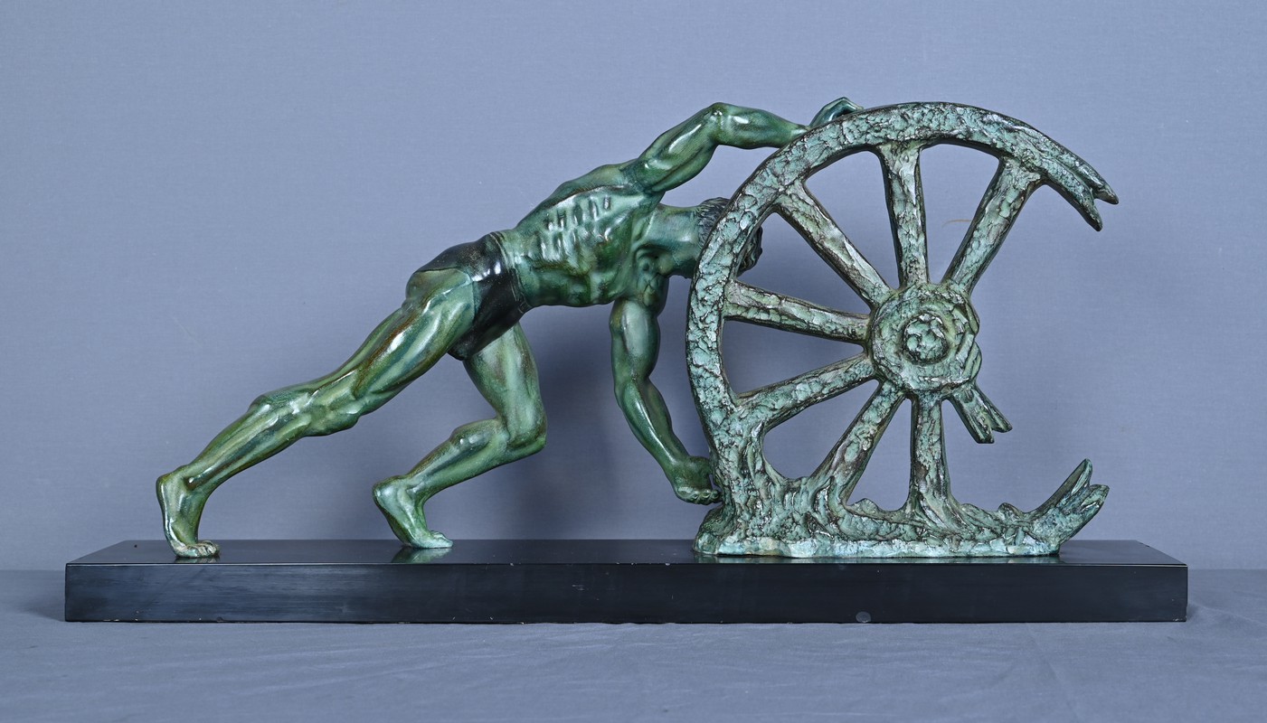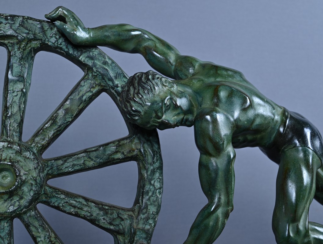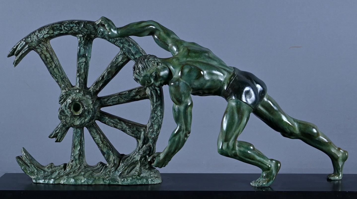 Sculpture monumentale en bronze à patine verte nuancée, représentant un homme athlétique en pleine tension, arc-bouté contre une roue brisée. Le corps puissant, tendu dans l’effort, évoque la force humaine confrontée à l’adversité mécanique. Le mouvement est saisi avec une intensité dramatique : jambes écartées, bras tendus, torse contracté, chaque muscle semble animé par la volonté de vaincre l’obstacle.