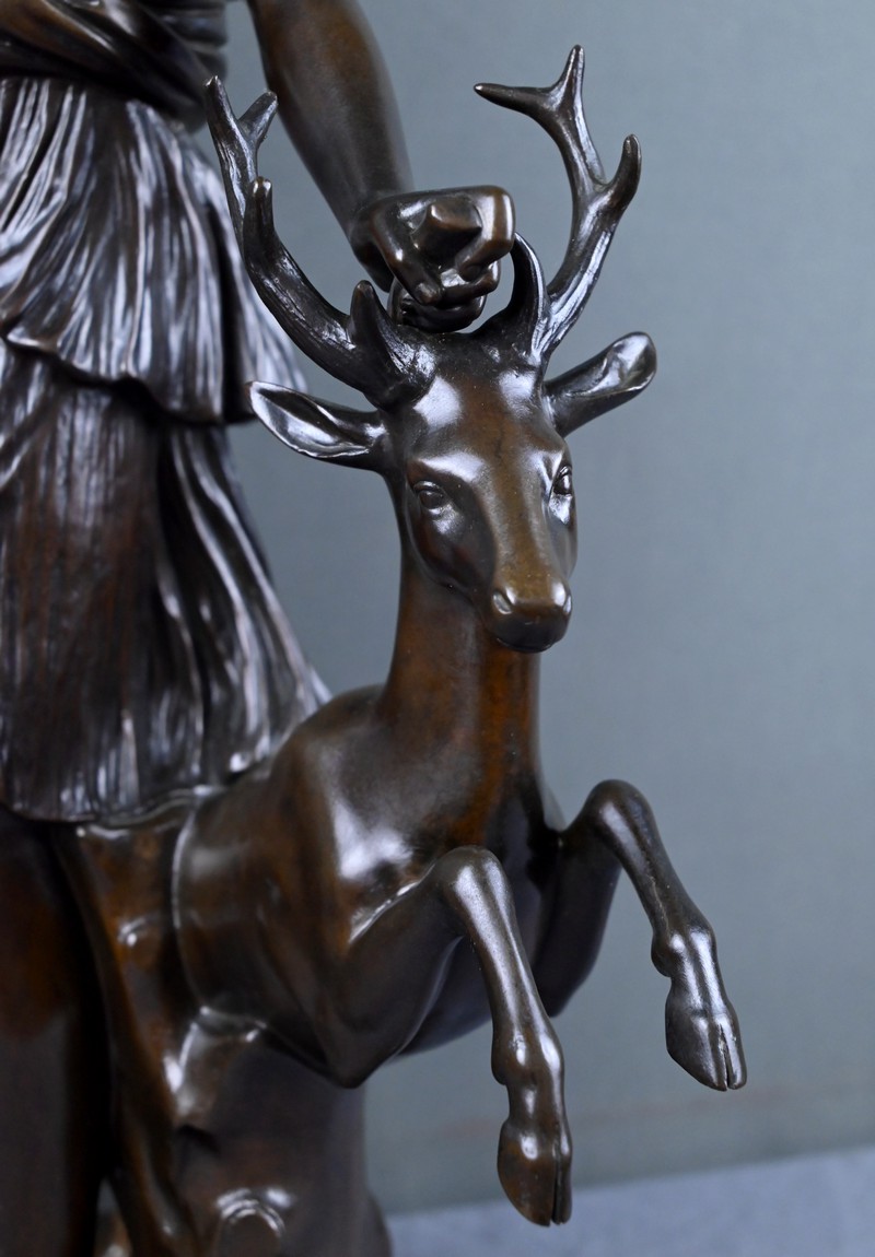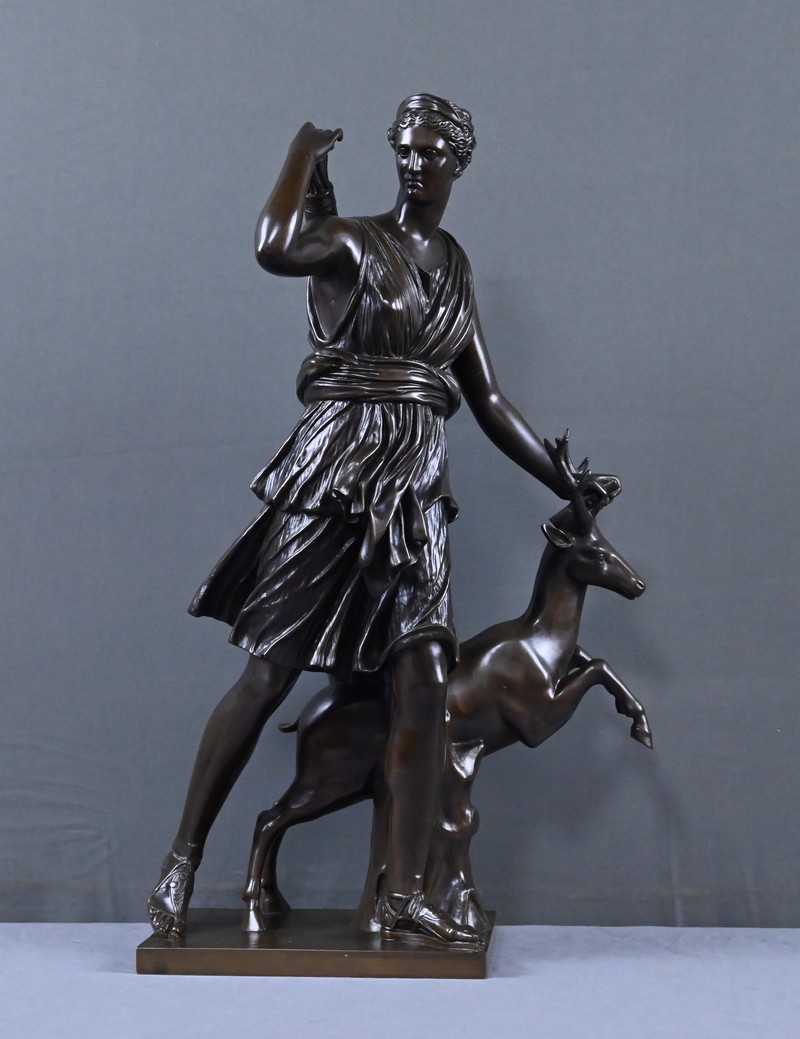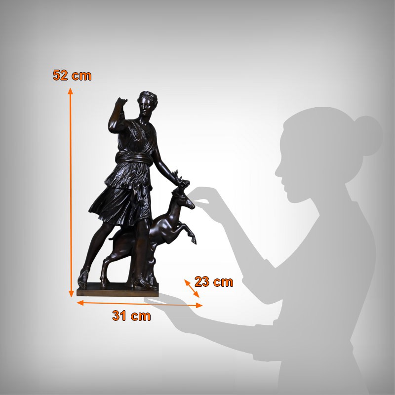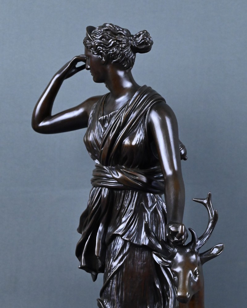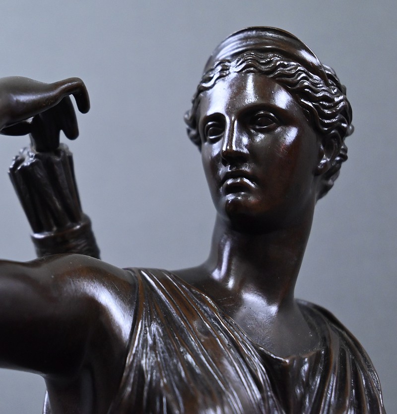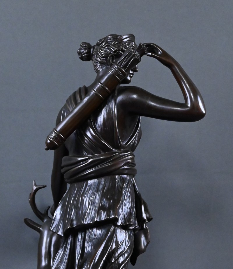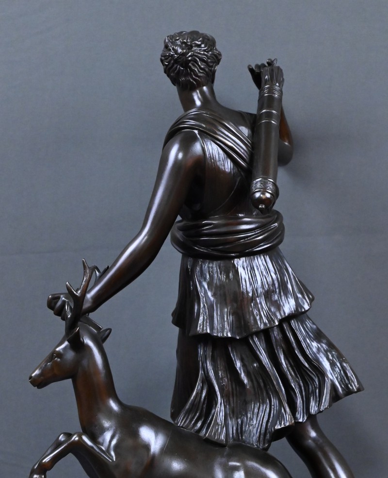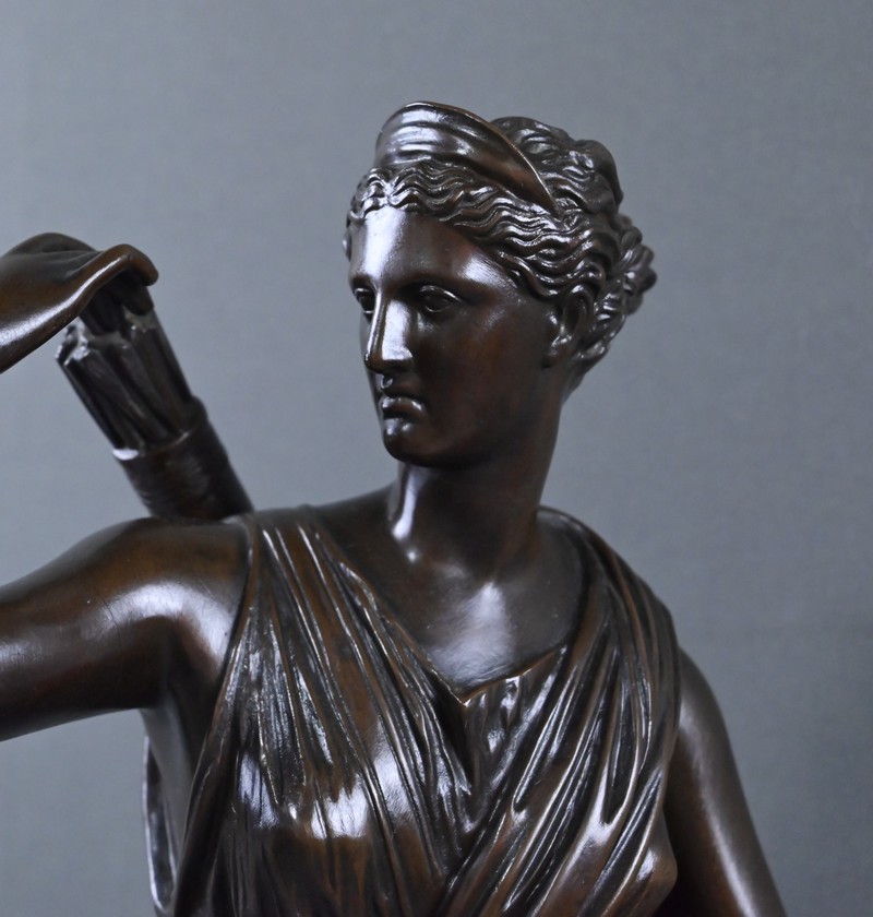 Cette grande réduction en bronze de la Diane de Versailles offre une présence souveraine et dynamique, fidèle à l’un des modèles antiques les plus emblématiques. La déesse romaine de la chasse, assimilée à Artémis chez les Grecs, est représentée en marche, saisissant de la main gauche les bois d’un petit cerf tandis que l’autre main attrape une flèche dans le carquois qu’elle porte en bandoulière. Sa tunique courte, ses sandales finement détaillées, son diadème et sa coiffure aux ondulations nouées sur la nuque témoignent d’un modelé précis et d’une grande maîtrise de la fonte. Le cachet « Réduction mécanique A. Collas » apposé sur la base atteste d’une édition de haute qualité et permet d’attribuer la fonte à la prestigieuse maison Barbedienne, dont le savoir-faire a largement contribué à la diffusion des chefs‑d’œuvre de l’Antiquité au XIXᵉ siècle. Le modèle reprend la célèbre copie romaine en marbre conservée au Musée du Louvre, elle-même inspirée d’un original grec du IVᵉ siècle av. J.-C. généralement attribué au sculpteur athénien Léocharès. Par son élégance, sa précision et son héritage historique, ce bronze réunit la force mythologique de Diane, la noblesse d’un grand modèle antique et l’excellence des grands fondeurs français, offrant une pièce de collection à la fois décorative, culturelle et intemporelle.