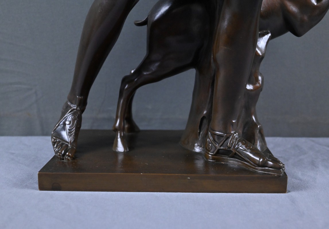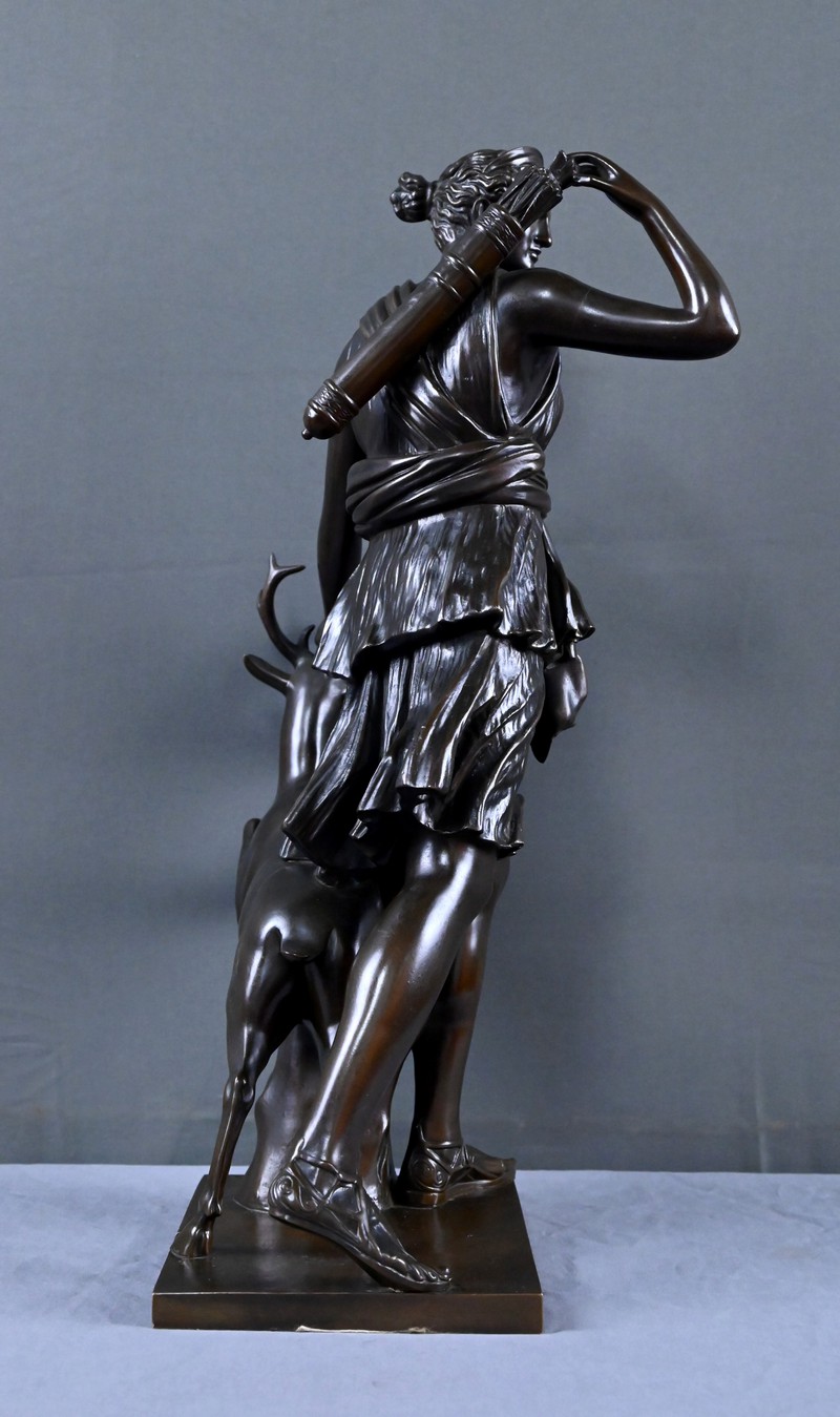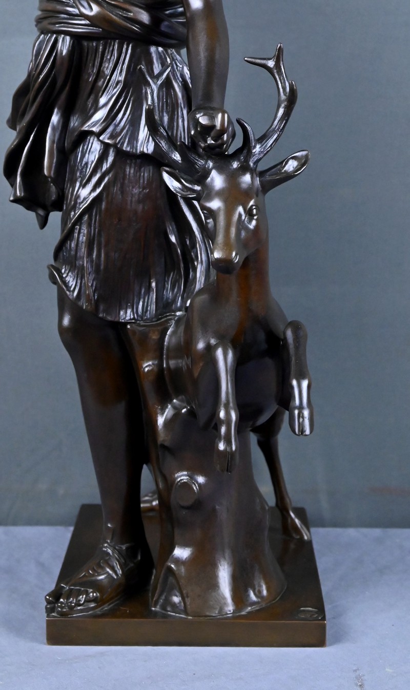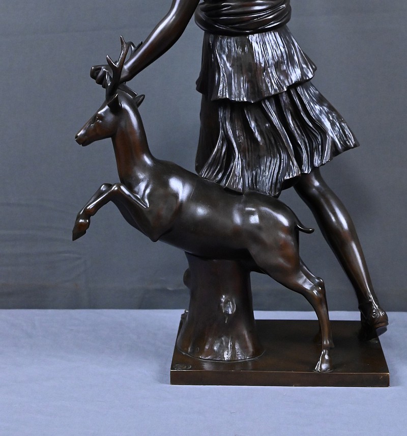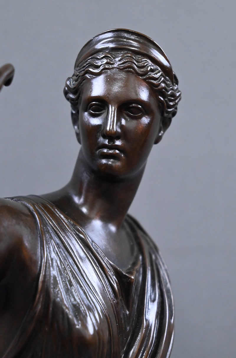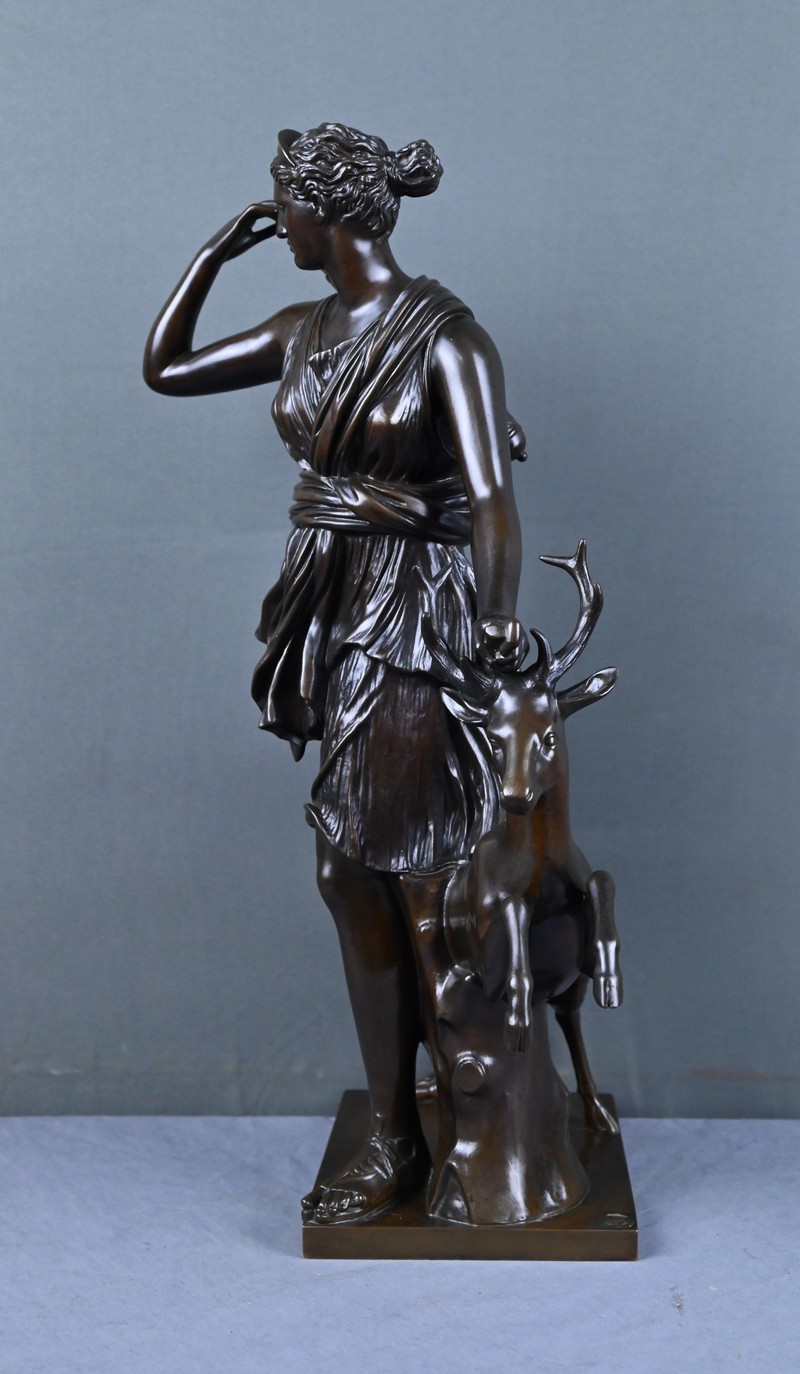 Cette grande réduction en bronze de la Diane de Versailles offre une présence souveraine et dynamique, fidèle à l’un des modèles antiques les plus emblématiques. La déesse romaine de la chasse, assimilée à Artémis chez les Grecs, est représentée en marche, saisissant de la main gauche les bois d’un petit cerf tandis que l’autre main attrape une flèche dans le carquois qu’elle porte en bandoulière. Sa tunique courte, ses sandales finement détaillées, son diadème et sa coiffure aux ondulations nouées sur la nuque témoignent d’un modelé précis et d’une grande maîtrise de la fonte. Le cachet « Réduction mécanique A. Collas » apposé sur la base atteste d’une édition de haute qualité et permet d’attribuer la fonte à la prestigieuse maison Barbedienne, dont le savoir-faire a largement contribué à la diffusion des chefs‑d’œuvre de l’Antiquité au XIXᵉ siècle. Le modèle reprend la célèbre copie romaine en marbre conservée au Musée du Louvre, elle-même inspirée d’un original grec du IVᵉ siècle av. J.-C. généralement attribué au sculpteur athénien Léocharès. Par son élégance, sa précision et son héritage historique, ce bronze réunit la force mythologique de Diane, la noblesse d’un grand modèle antique et l’excellence des grands fondeurs français, offrant une pièce de collection à la fois décorative, culturelle et intemporelle.