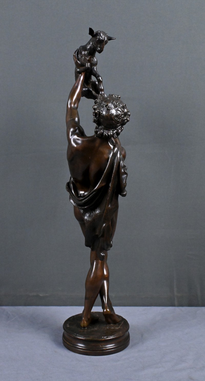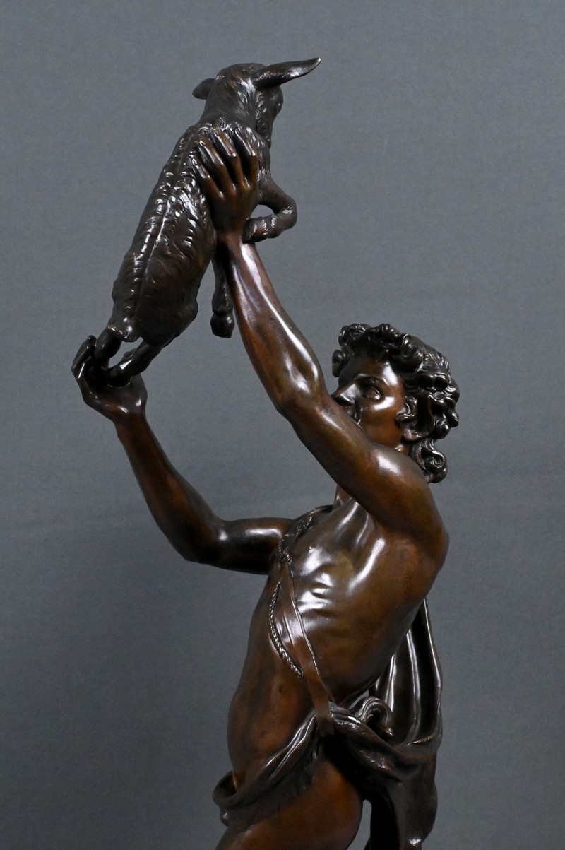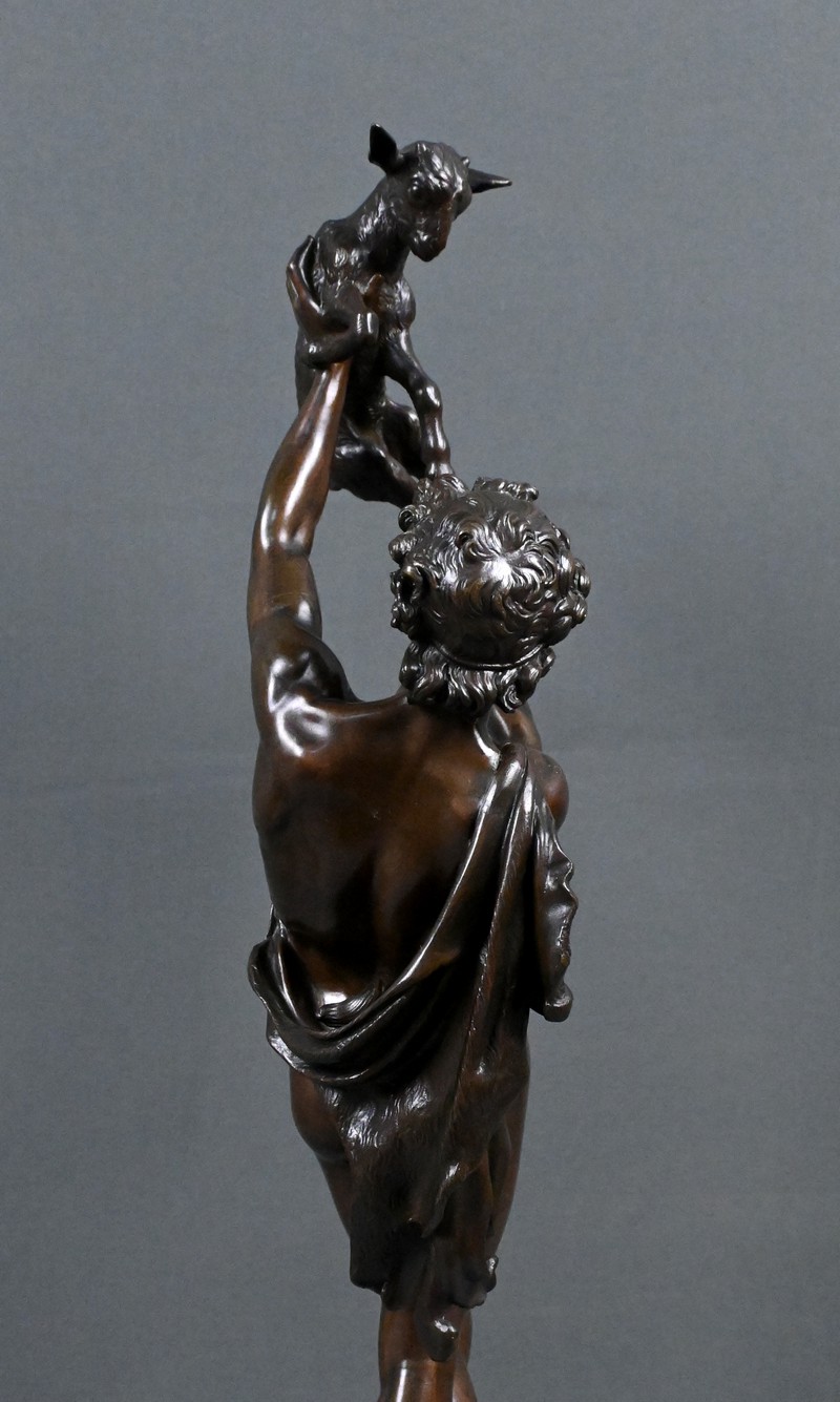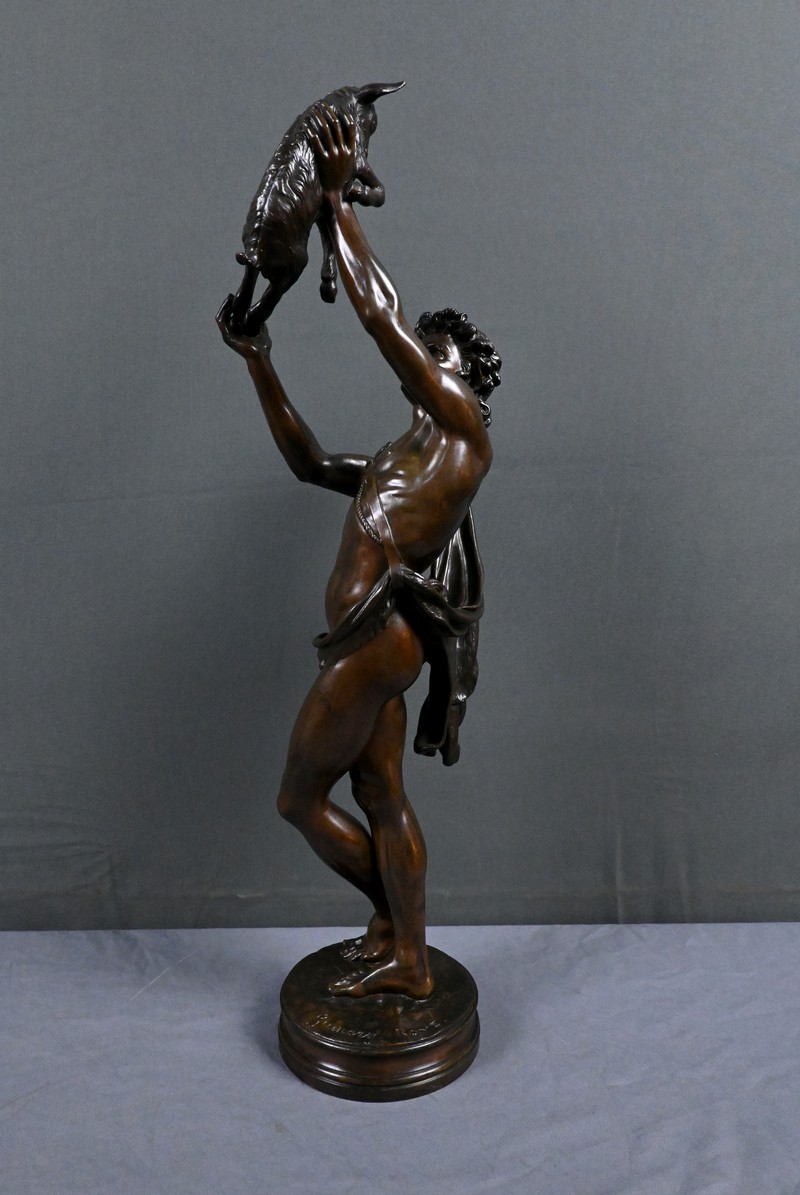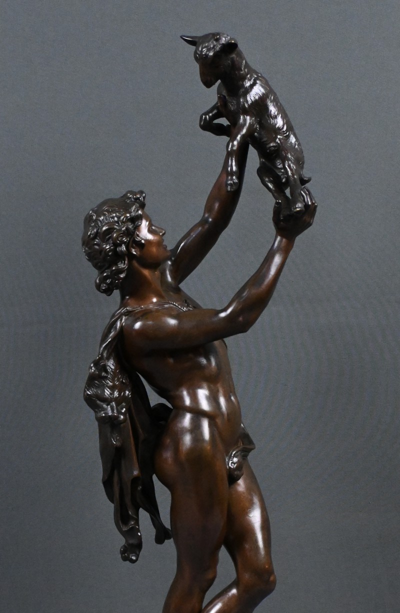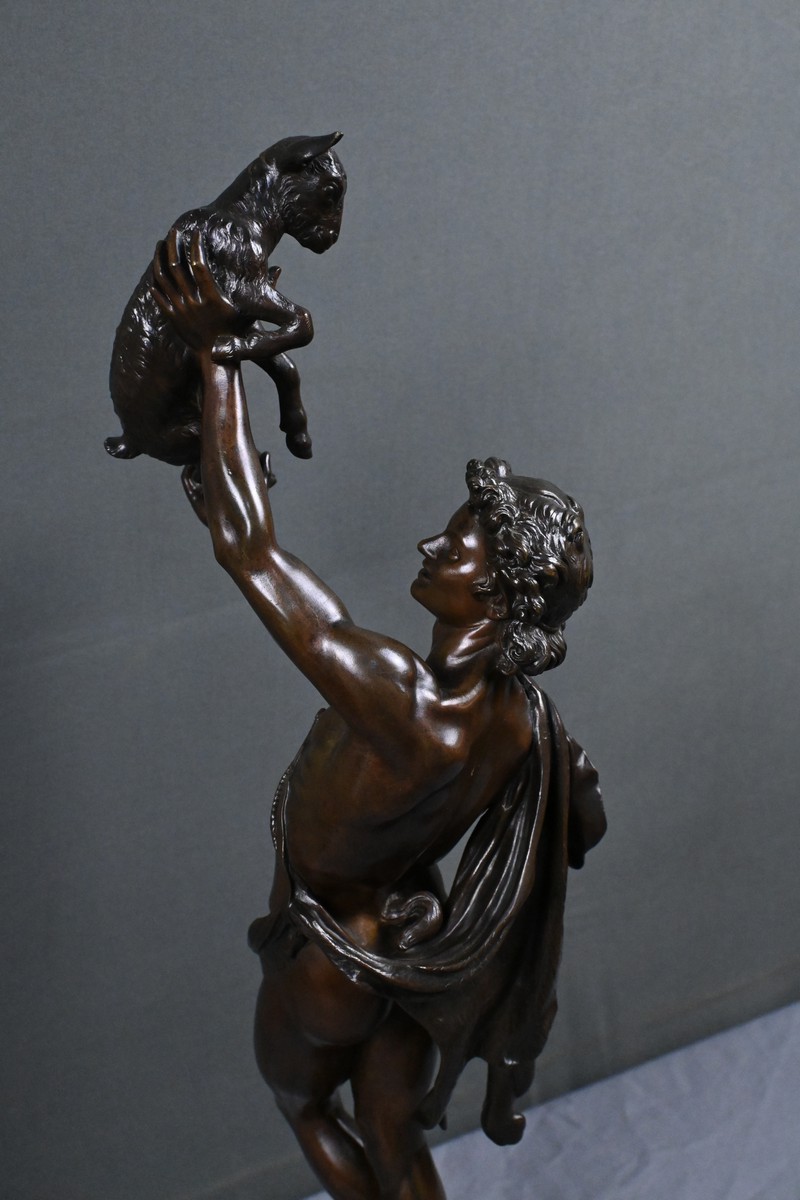 Élégant bronze à patine brune figurant un jeune homme portant un chevreau au‑dessus de sa tête, attribué au sculpteur Charles Alphonse Achille Gumery (1827‑1871), artiste reconnu du Second Empire.