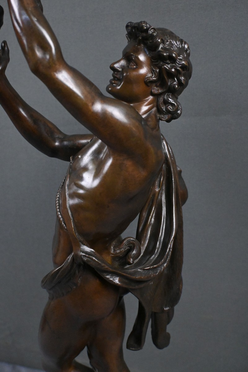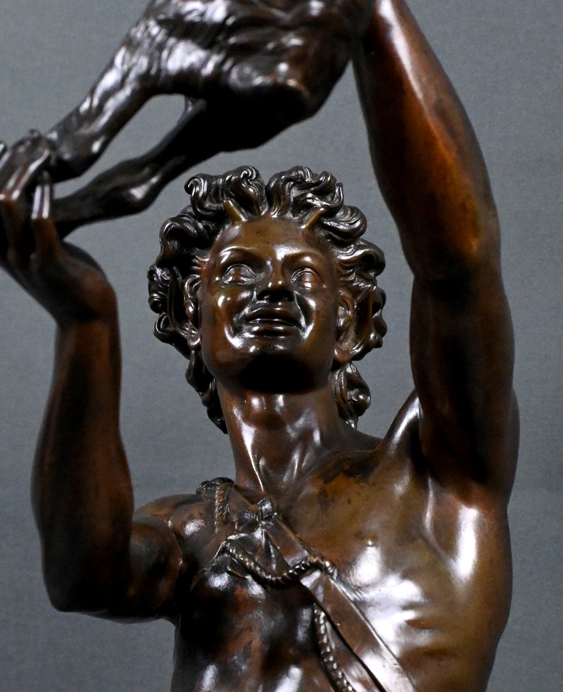 Le chevreau, tenu à bout de bras, est rendu avec un soin particulier : pelage finement texturé, attitude vivante, équilibre maîtrisé. L’ensemble témoigne d’une grande virtuosité dans le modelé anatomique et dans la qualité de ciselure, caractéristiques du travail de Gumery, élève de Jouffroy et figure marquante de la sculpture académique du XIXᵉ siècle.