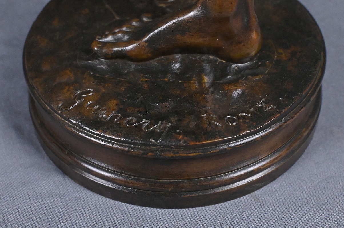 La patine brune, profonde et régulière, met en valeur les volumes et les jeux de lumière sur la surface du bronze. L’œuvre repose sur une base circulaire sobre qui renforce la verticalité et l’élégance de la figure. La signature « Gumery, Rome » est apposée sur la terrasse.