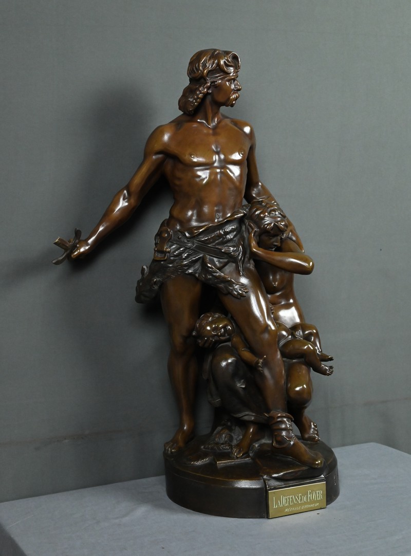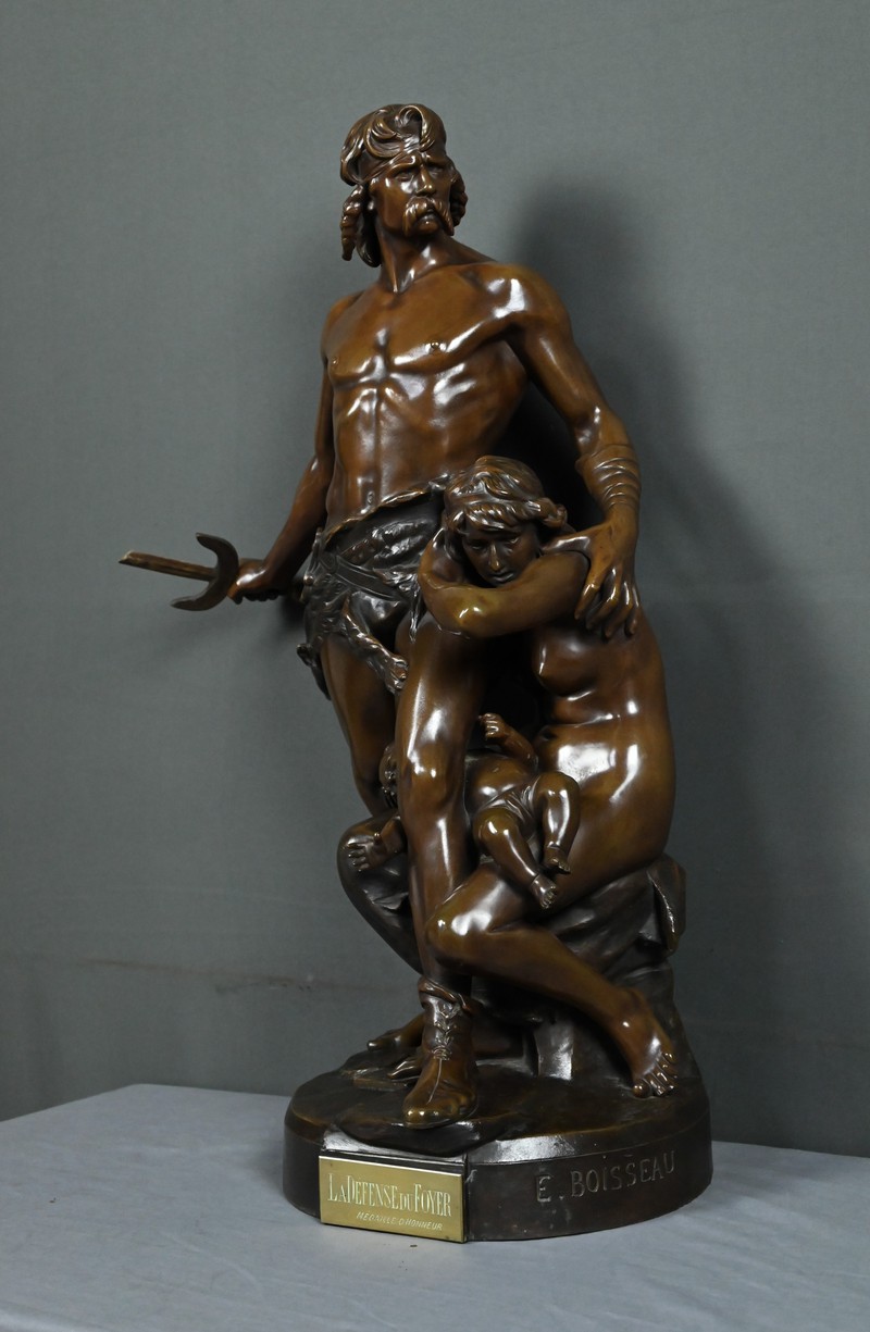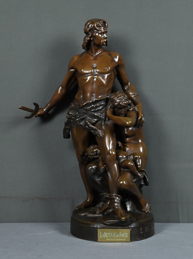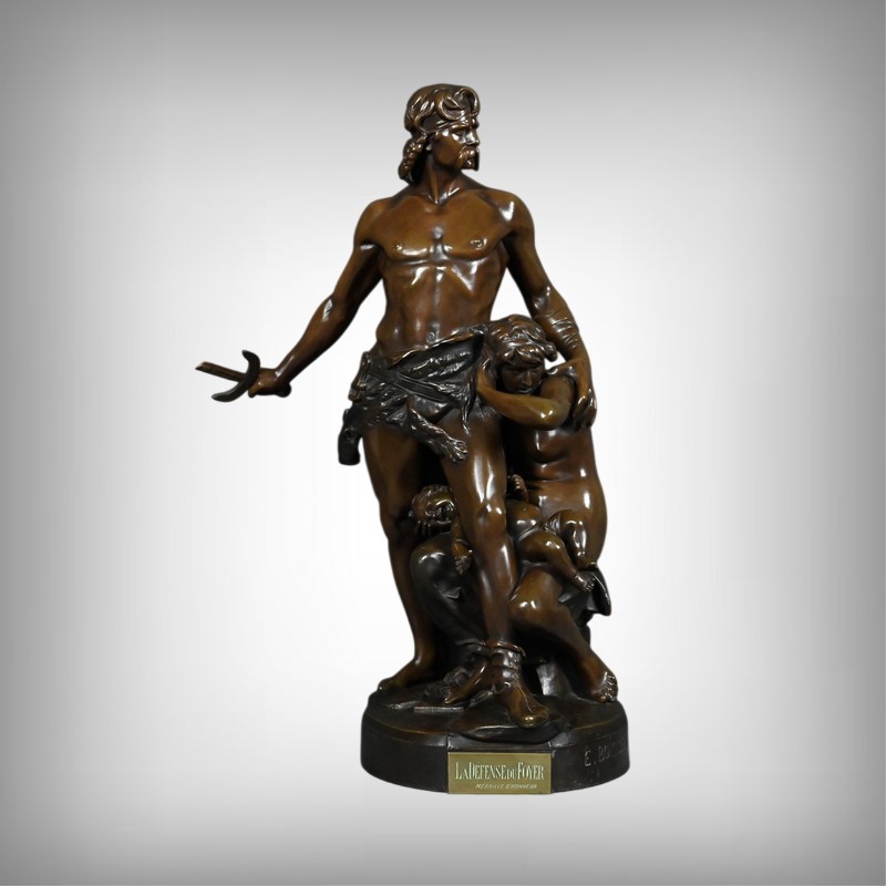 Puissant et émouvant, ce grand groupe en bronze à patine brune intitulé « La défense du Foyer », incarne avec force le thème universel de la protection familiale face au péril. Réalisé par le sculpteur Émile Boisseau, il transpose en format réduit le modèle original érigé au square d’Ajaccio, à Paris, devant les Invalides.