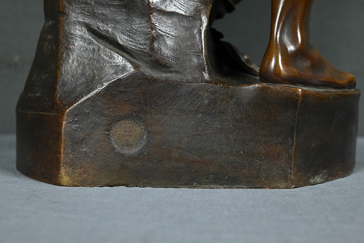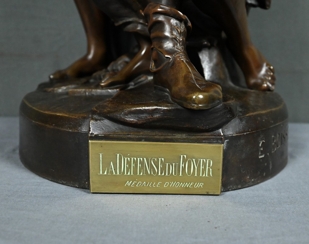 Ce bronze titré dans un cartouche est accompagné de la mention « Médaille d’Honneur », témoignant de la reconnaissance officielle accordée à l’œuvre pour sa qualité artistique et son message patriotique. Il s’inscrit dans la tradition des sculptures commémoratives de la fin du XIXe siècle, exaltant les valeurs de courage, de devoir et d’amour familial. Cette oeuvre est signée sur la terrasse et porte le cachet du fondeur « Société des Bronzes de Paris ».