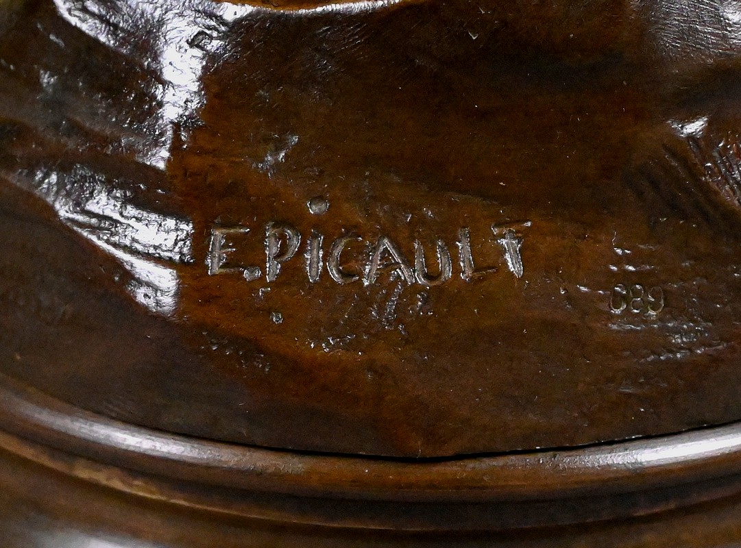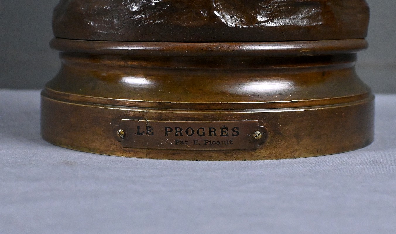 La base est ornée d’une plaque portant la citation : « Fils de la science, il entraîne l’homme dans son évolution ascendante et éternelle. » Une phrase parfaitement accordée à l’esprit de l’artiste, qui associait souvent ses bronzes à des devises exaltant l’effort, la clarté et l’élévation. La signature de l’artiste se retrouve en terrasse. Un cartouche intitulé « Le Progrès par E. Picault »est situé en façade de la base pivotante.