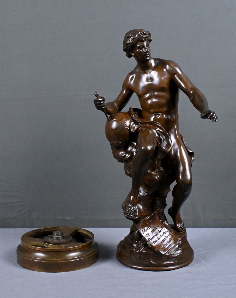 La composition sur socle pivotant met en scène un jeune homme nu, au corps tendu, torse légérement vrillé, incarnant l’élan vital de l’humanité vers la connaissance. Son attitude ascendante, presque prométhéenne, traduit la confiance absolue de l’époque dans la science, l’étude et l’intelligence humaine. Accolé à un globe, il tient un compas dans sa main droite. Sous lui, des outils représentent les forces scientifiques et industrielles.