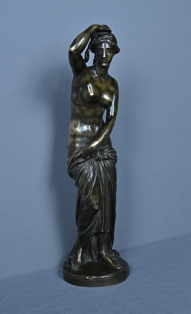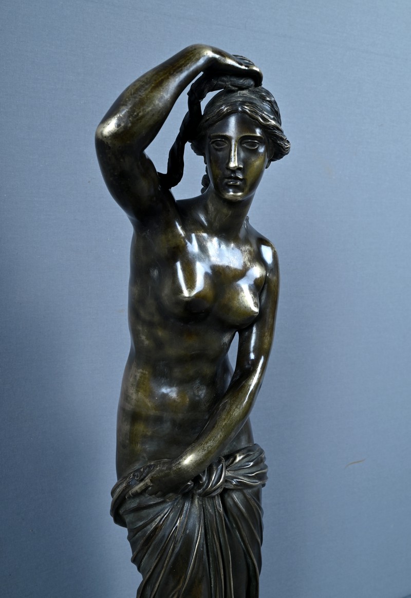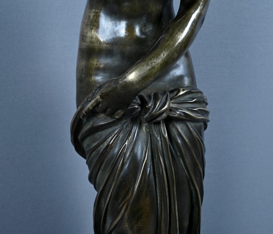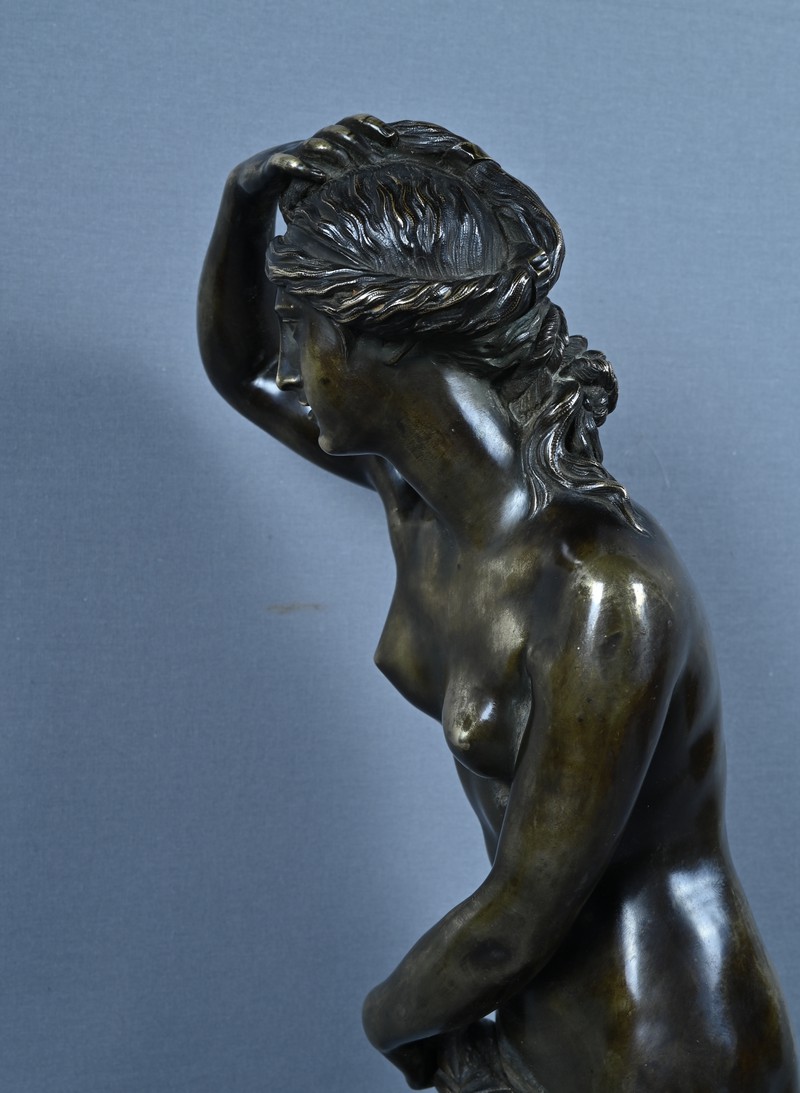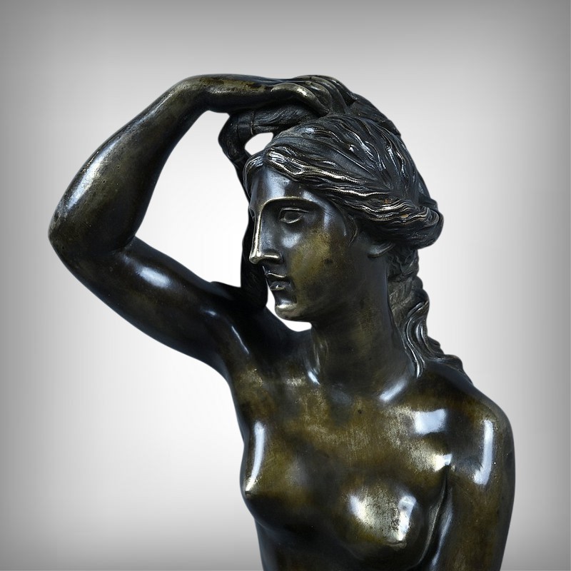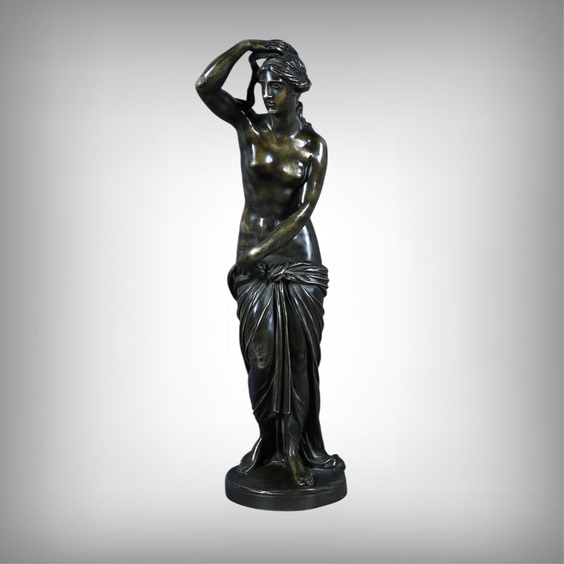 Élégante et sensuelle, cette sculpture en bronze patiné incarne avec grâce l’idéal néoclassique de la beauté féminine. Représentée debout, Vénus émerge du bain dans une posture à la fois pudique et théâtrale : le bras droit relevé tenant ses cheveux et la main gauche retenant délicatement le drapé qui ceint ses hanches. Le corps, partiellement dénudé, révèle une maîtrise remarquable du modelé, soulignant la douceur des courbes, la tension des muscles et la fluidité du mouvement.