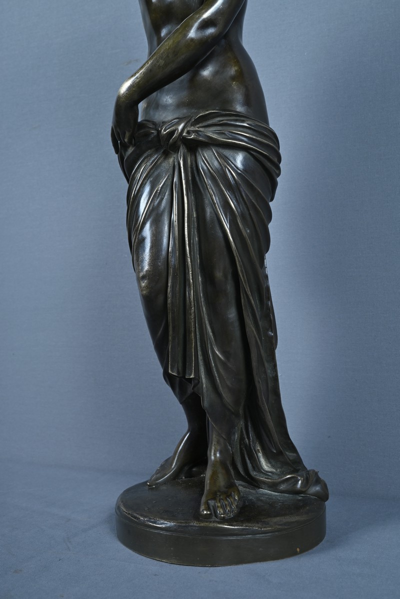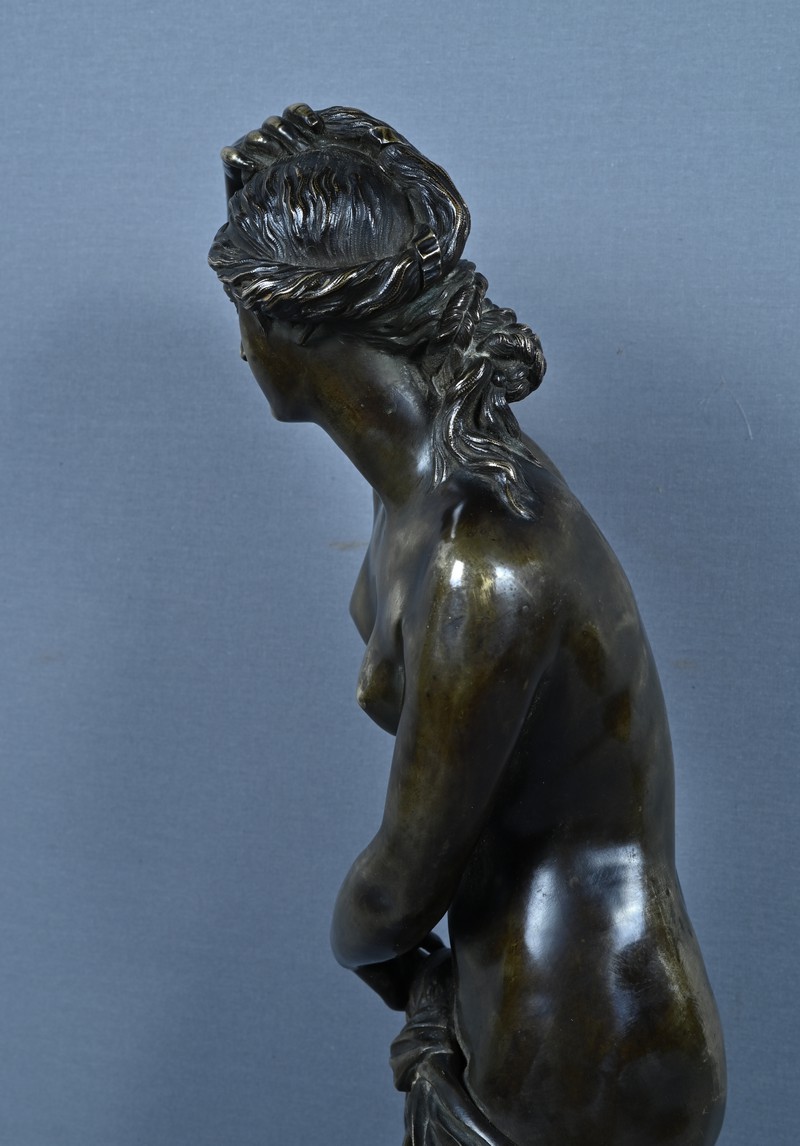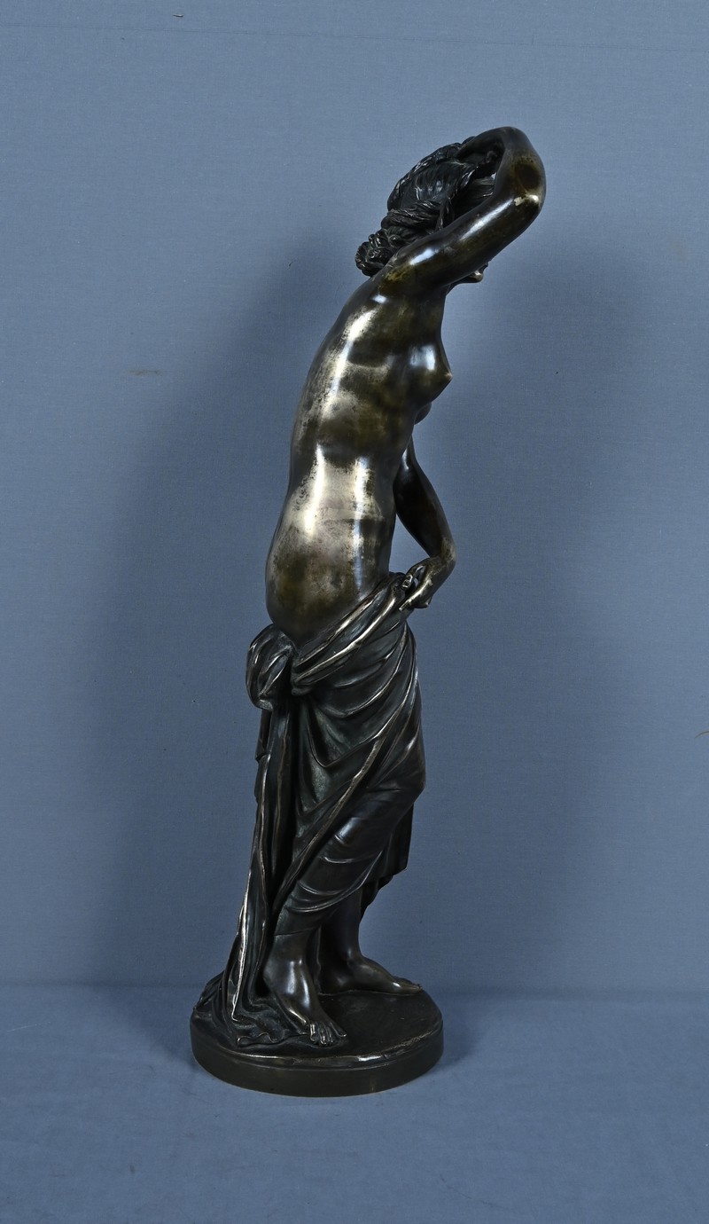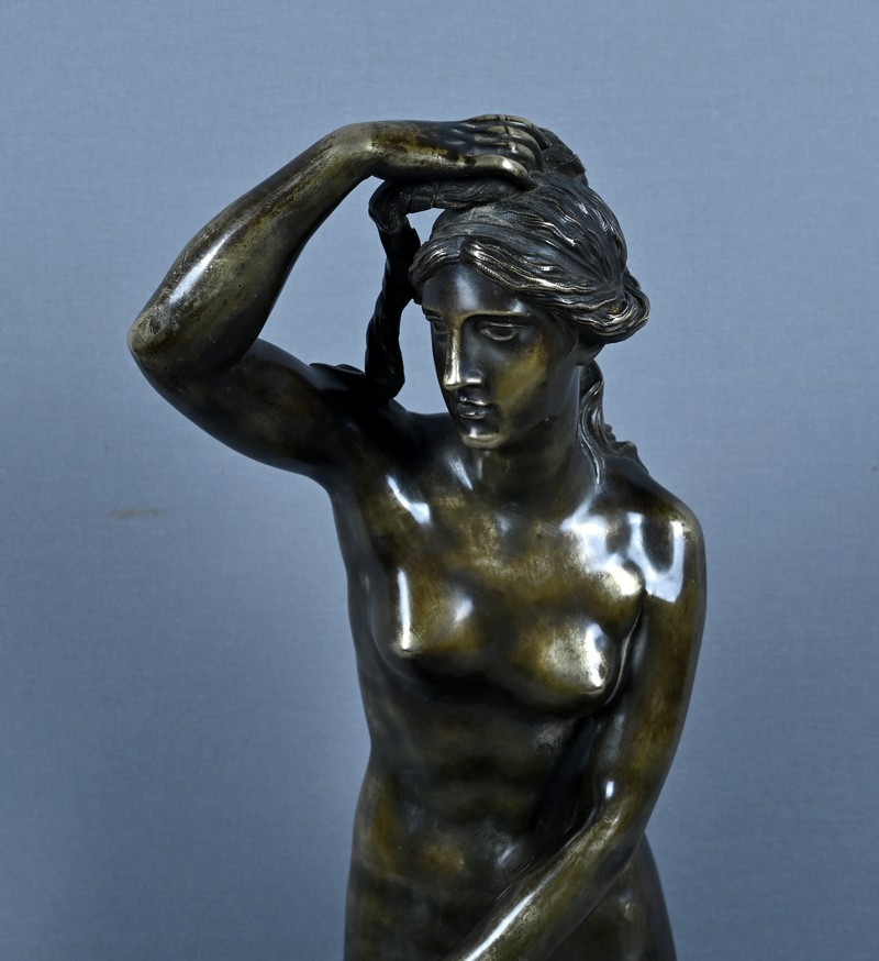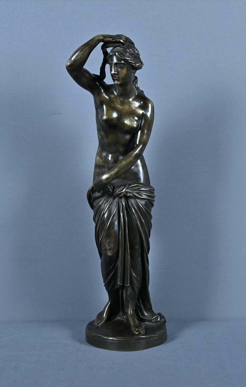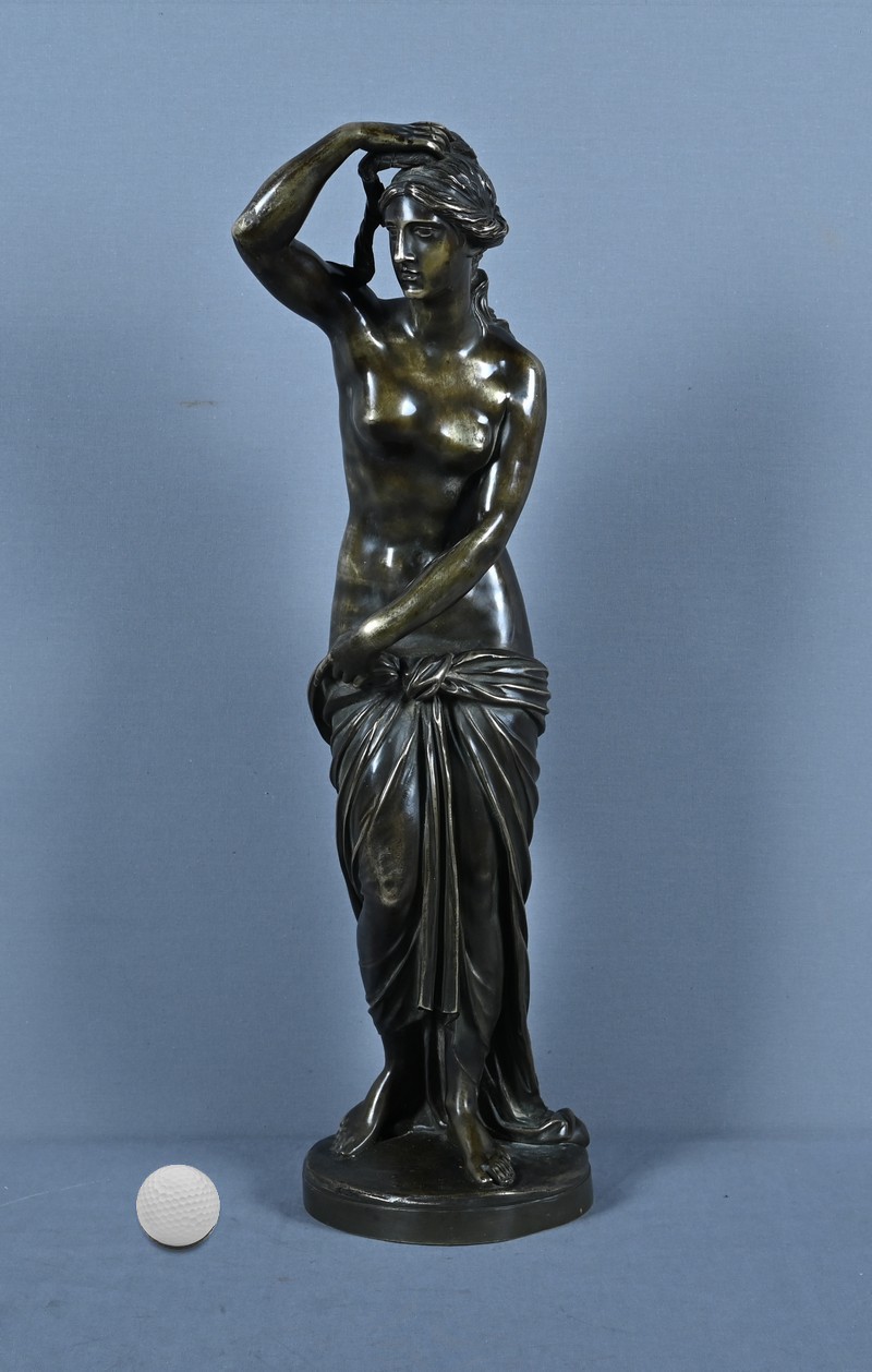 Élégante et sensuelle, cette sculpture en bronze patiné incarne avec grâce l’idéal néoclassique de la beauté féminine. Représentée debout, Vénus émerge du bain dans une posture à la fois pudique et théâtrale : le bras droit relevé tenant ses cheveux et la main gauche retenant délicatement le drapé qui ceint ses hanches. Le corps, partiellement dénudé, révèle une maîtrise remarquable du modelé, soulignant la douceur des courbes, la tension des muscles et la fluidité du mouvement.
