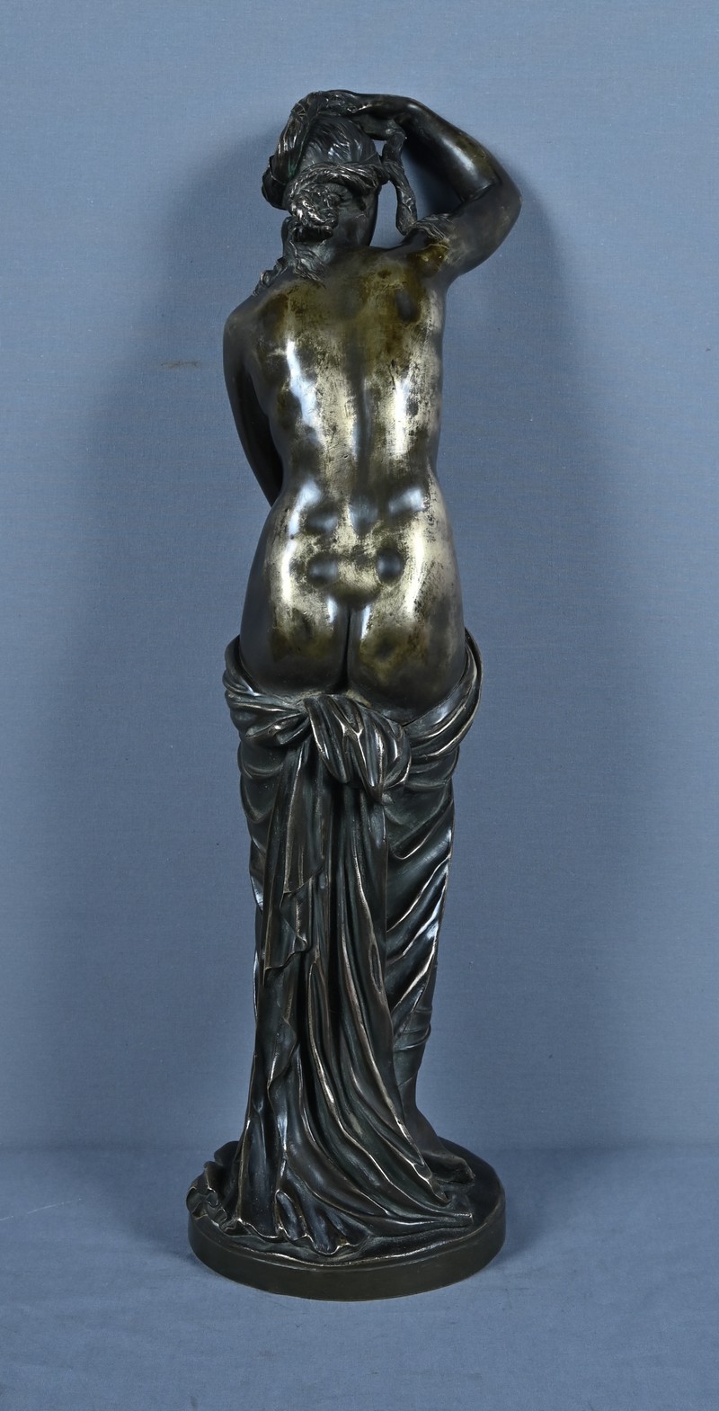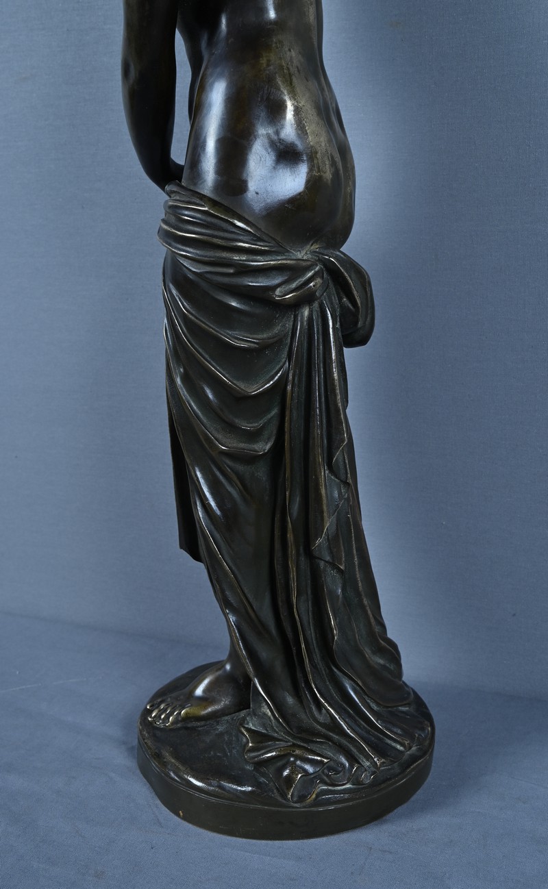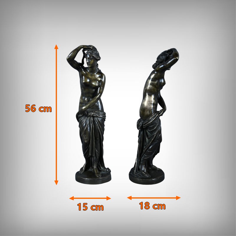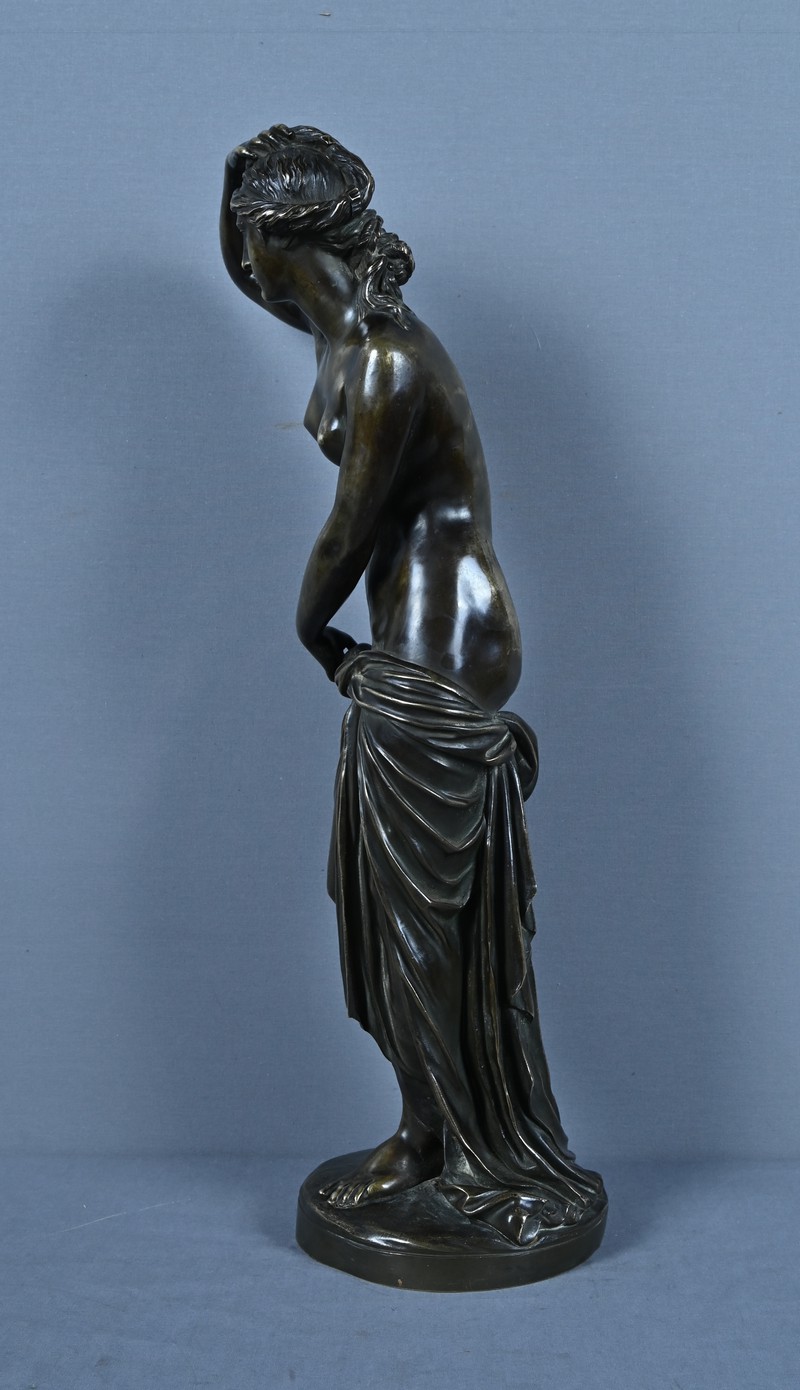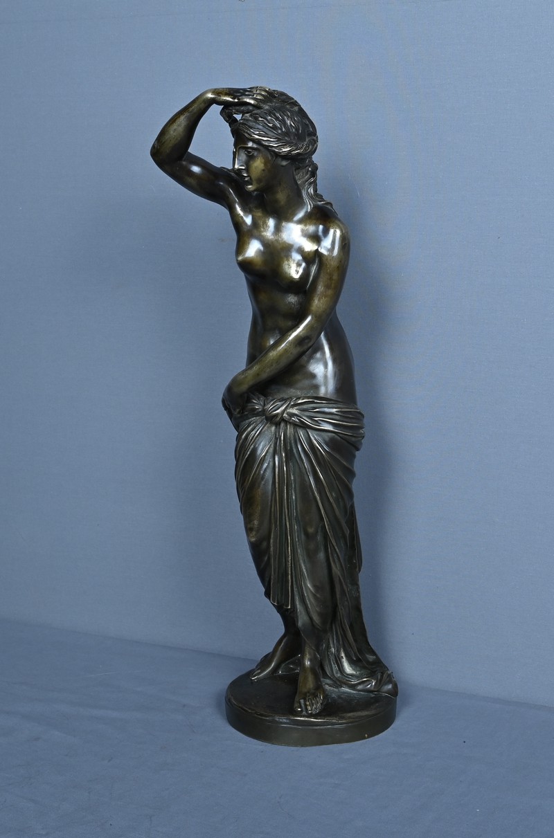 Élégante et sensuelle, cette sculpture en bronze patiné incarne avec grâce l’idéal néoclassique de la beauté féminine. Représentée debout, Vénus émerge du bain dans une posture à la fois pudique et théâtrale : le bras droit relevé tenant ses cheveux et la main gauche retenant délicatement le drapé qui ceint ses hanches. Le corps, partiellement dénudé, révèle une maîtrise remarquable du modelé, soulignant la douceur des courbes, la tension des muscles et la fluidité du mouvement.
