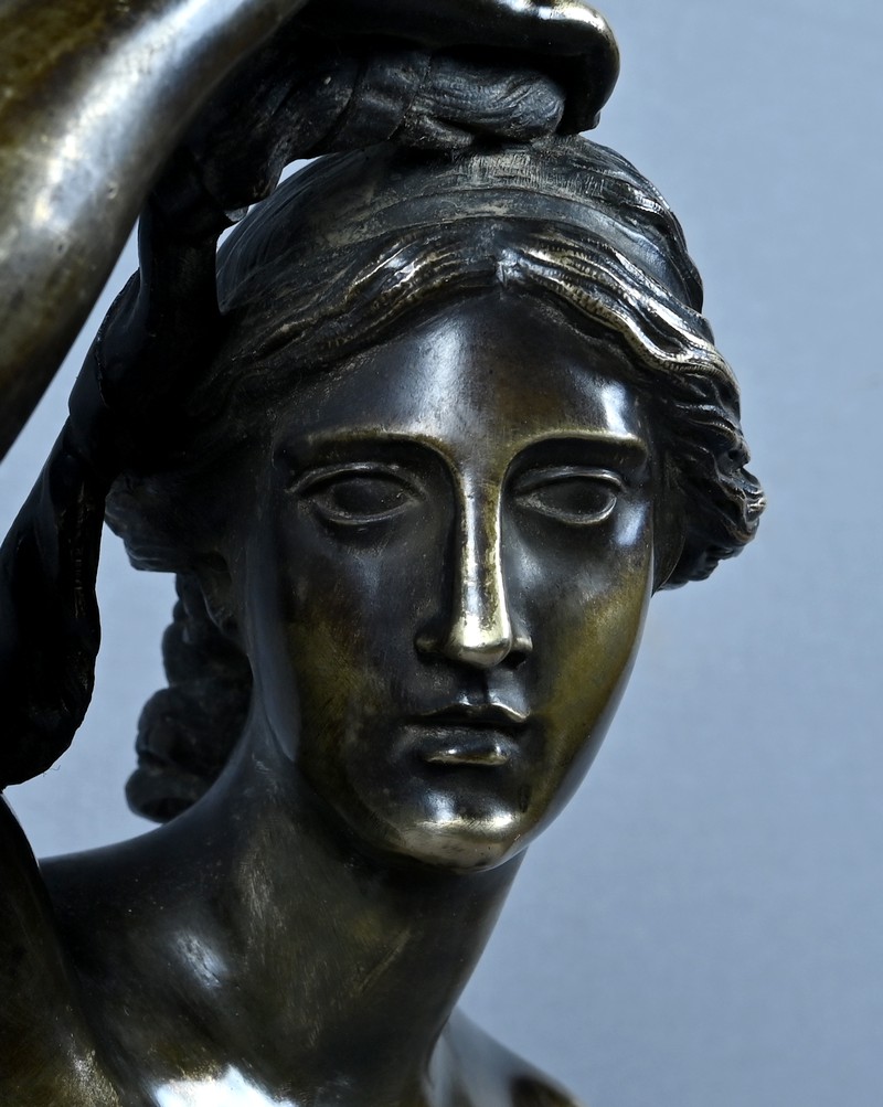 Ce bronze réalisé dans la seconde moitié du XIXe siècle, témoigne de l’engouement romantique pour les thèmes mythologiques et les canons esthétiques hérités de l’Antiquité. Il s’inscrit dans la tradition des grands sculpteurs académiques, alliant virtuosité technique et raffinement décoratif.