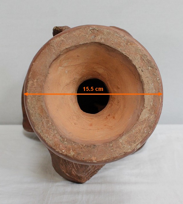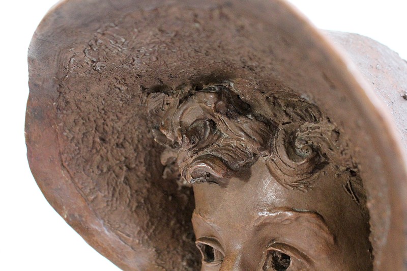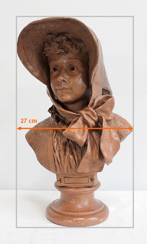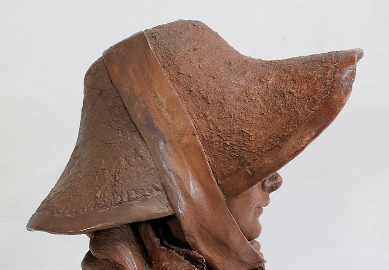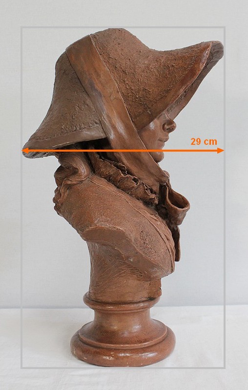 Ce buste repose sur un piédouche mouluré, également en terre cuite.