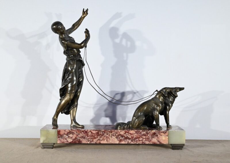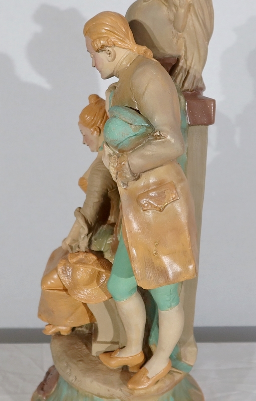Important sujet représentant une jeune femme ingénue courtisée par un jeune homme. « Le loup et l’agneau » est une sculpture de François Alphonse Piquemal (1869-1911), élève de Cavelin, qui figura au salon et reçu la mention honorable en 1909. Il est également inscrit « Nardi Editeur » sur l’arrière de l’œuvre.