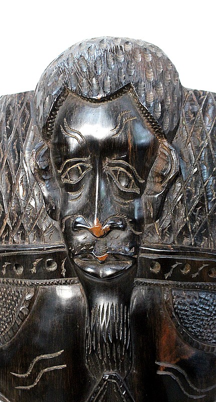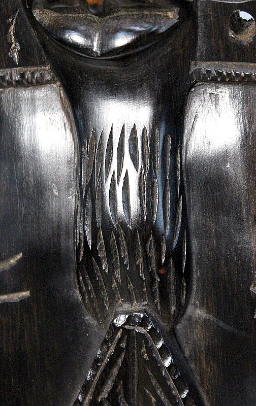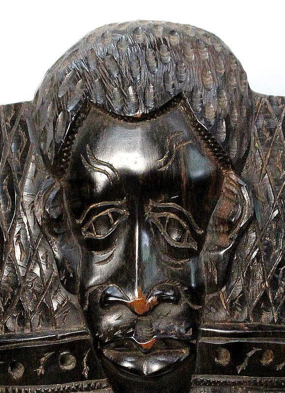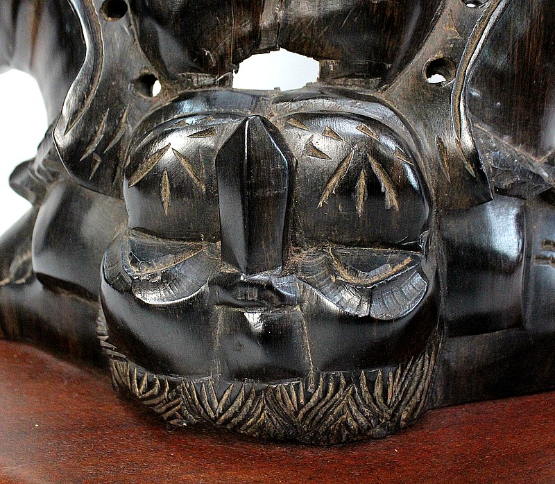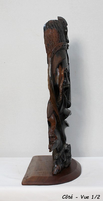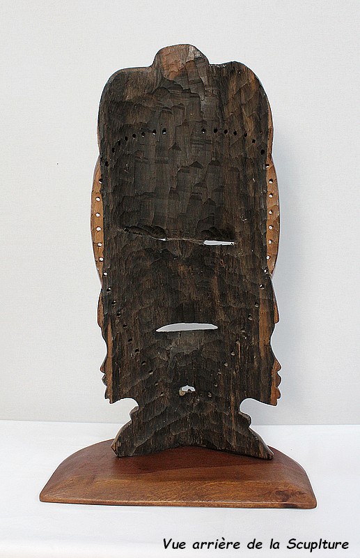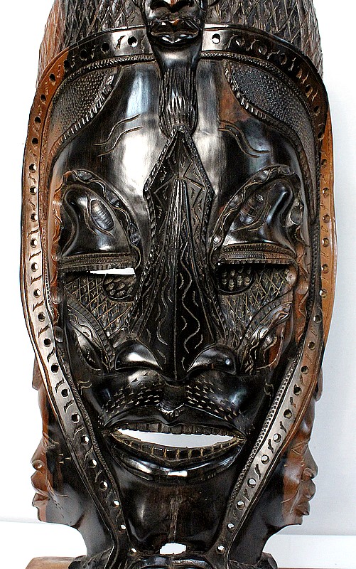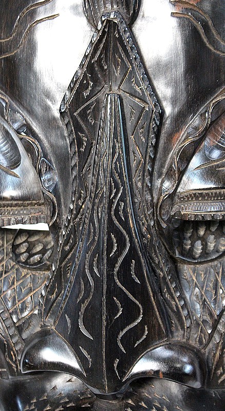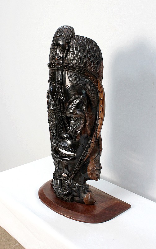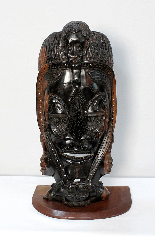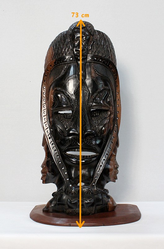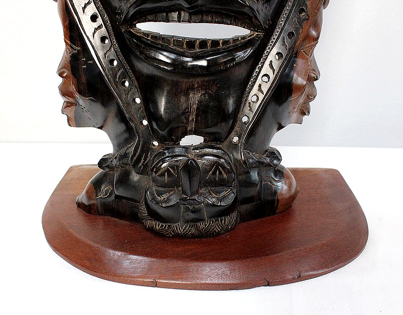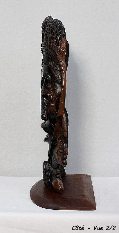 Grand masque à plusieurs têtes, originaire du Bangui, capitale de la République centrafricaine et composé essentiellement d’ébène massif : bois dure à la couleur noire et unie, provenant de cette région.