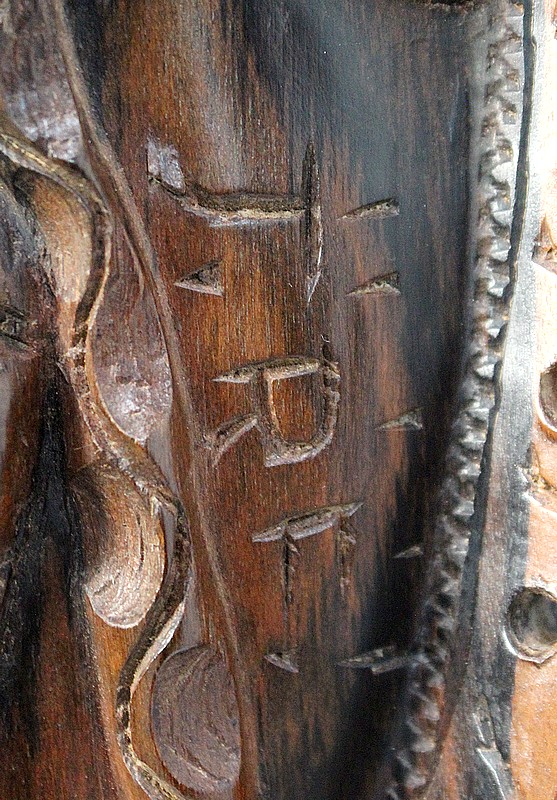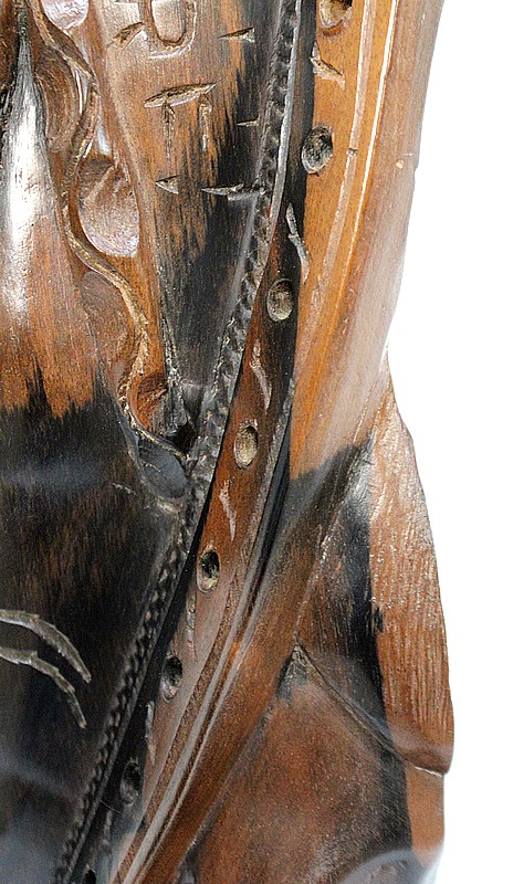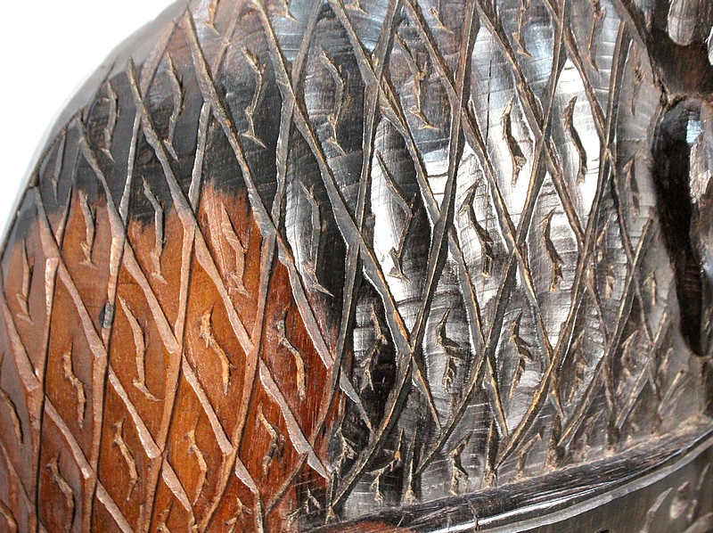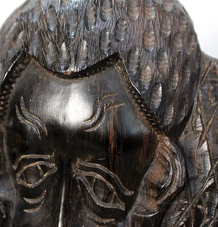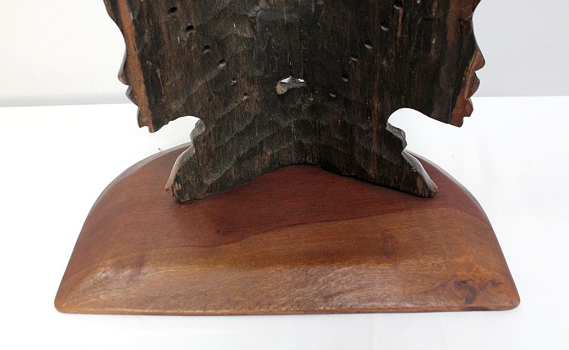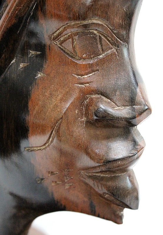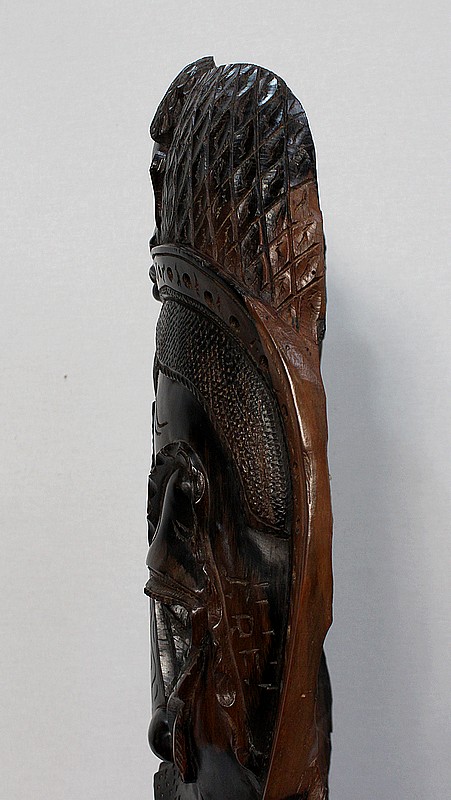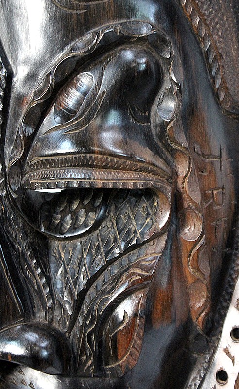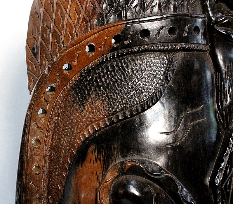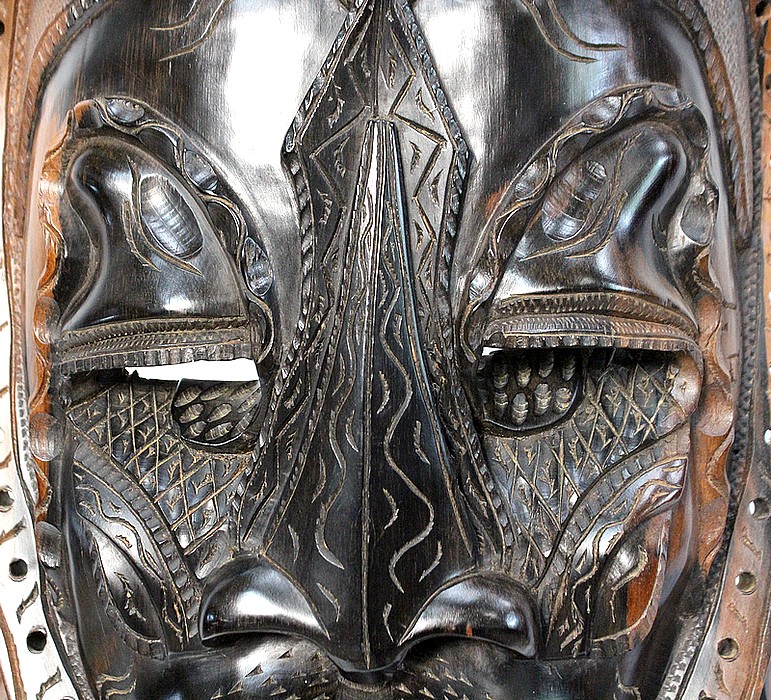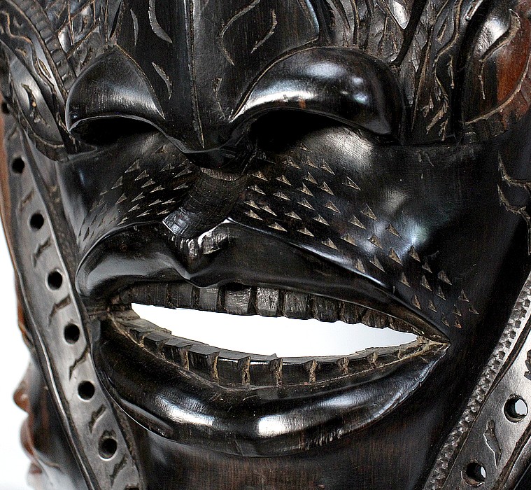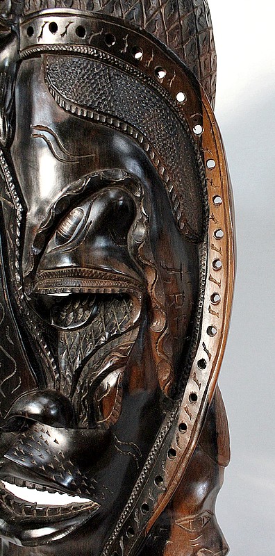 Il représente un visage tribal ornementé de diverses gravures géométriques sur sa surface et d’une large frise ajourée et ciselée l’entourant. De belles nuances de bois, de couleurs chaudes embellissent l’autochtone, lui apportant toute sa singularité.