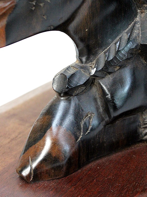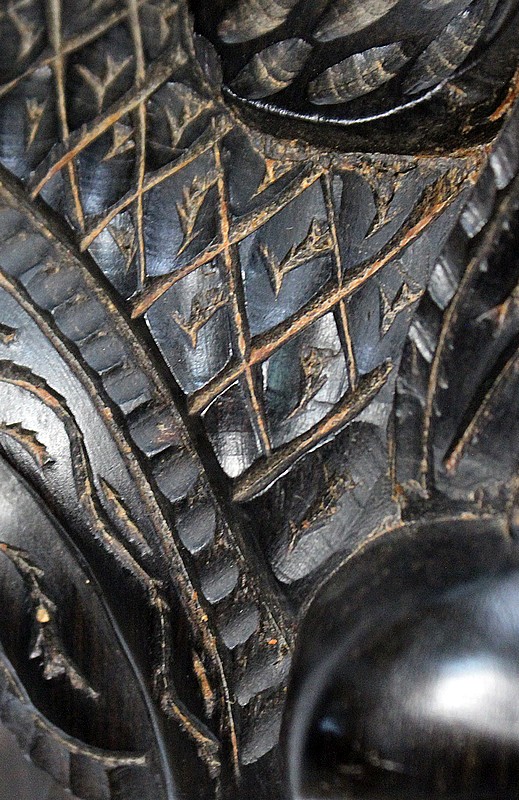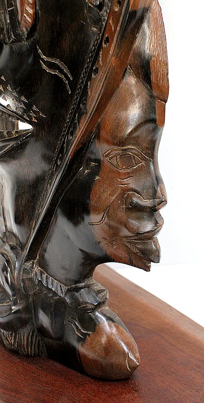 Sur ces côtés on retrouve deux discrets visages de femmes, de profils, certainement d’origine africaine. Une chaîne autour de leur cou les accessoirise.