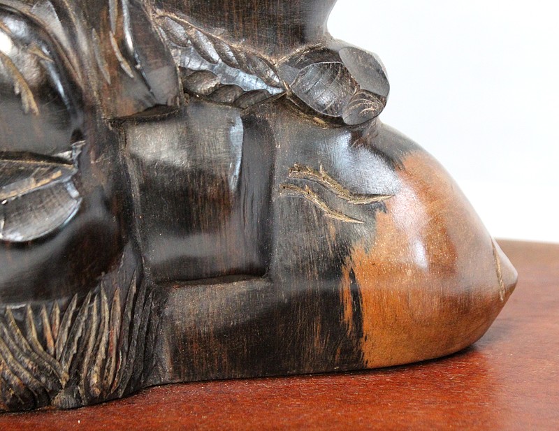 Cet objet décoratif est coiffée d’une tête d’homme barbu.