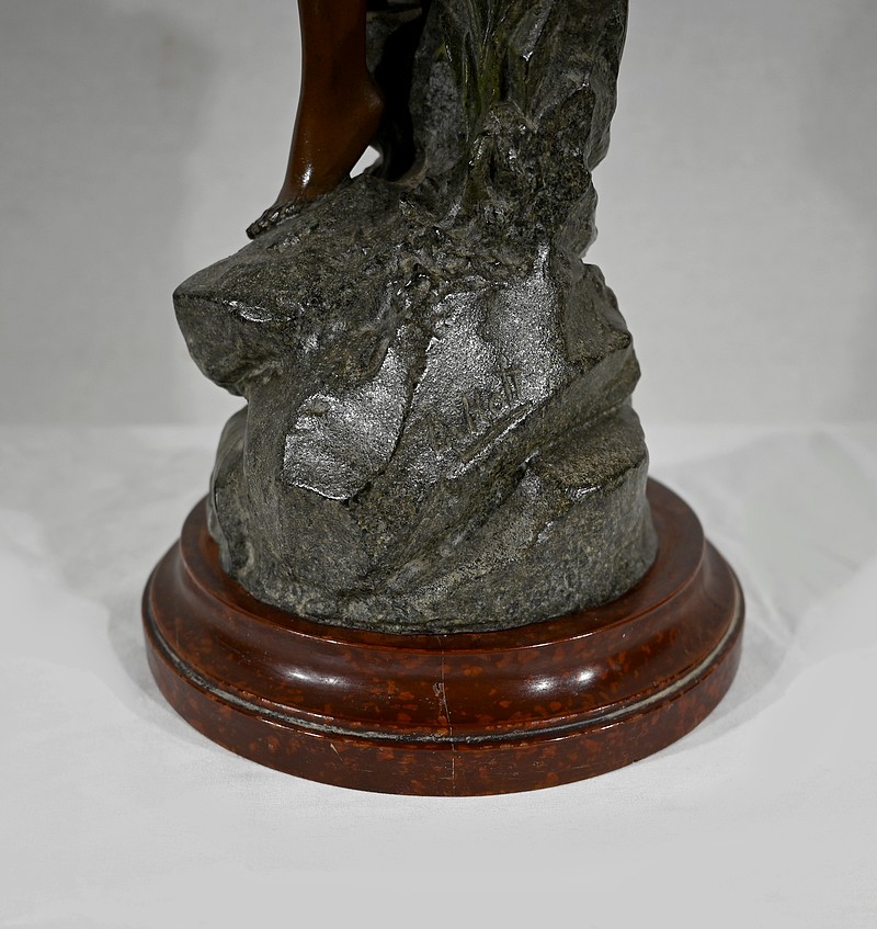 Légèrement vêtue d’un voile mettant en valeur les courbes de son corps, la belle se tient sur un rocher. Son visage doux et souriant est tourné vers le ciel. Ses longs cheveux ondulés sont agrémentés d’une large couronne de fleurs. A ses pieds, un ruisseau s’échappe d’une fontaine en forme de cruche.