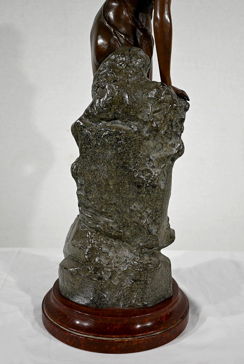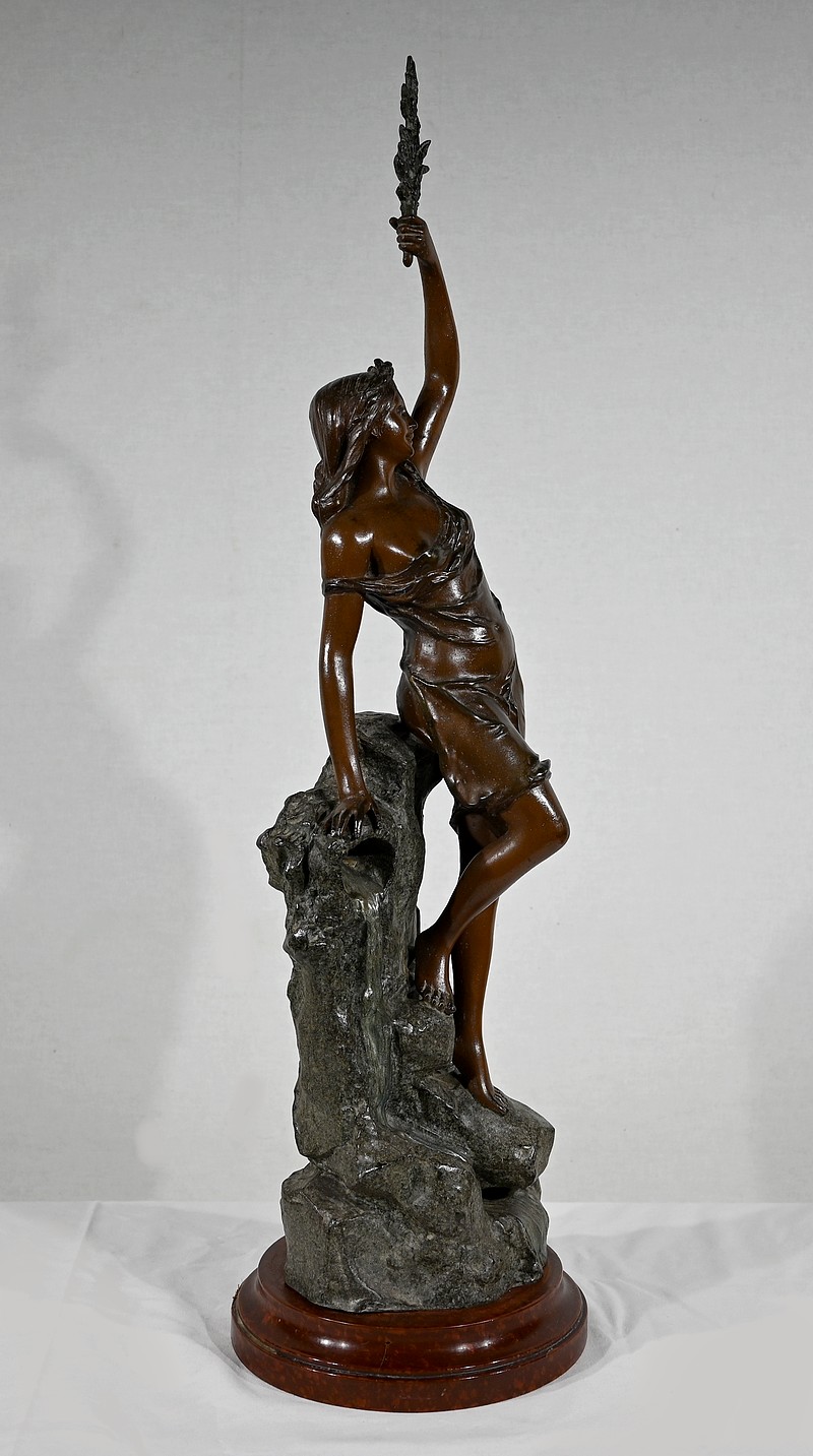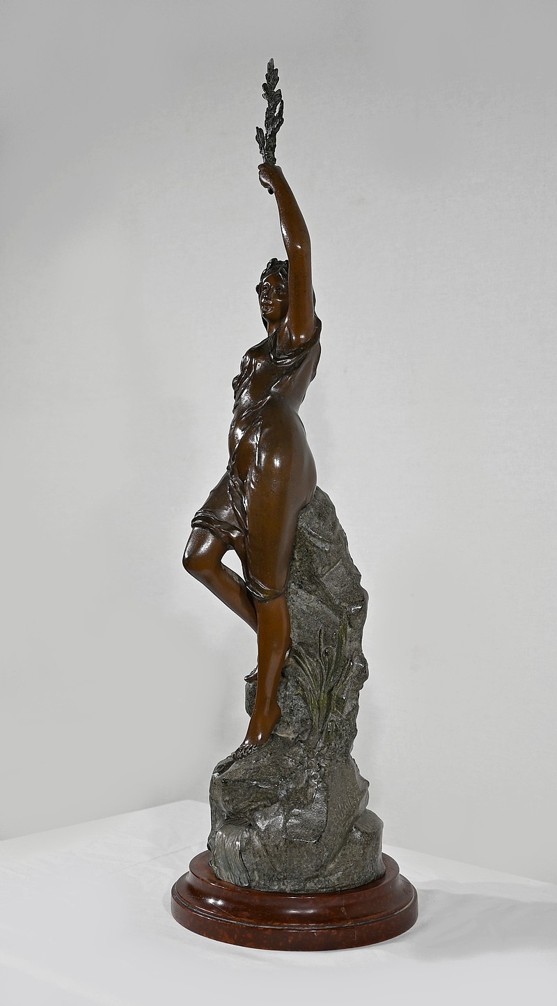 Grande épreuve en régule patiné tricolore, représentant une jeune femme tenant un rameau d’olivier au-dessus de sa tête.