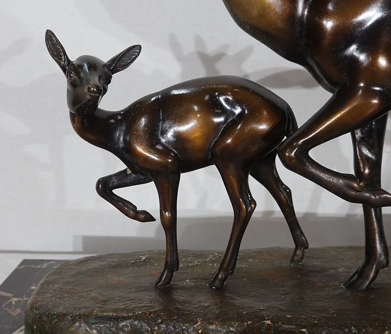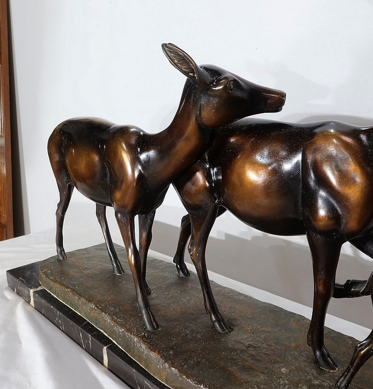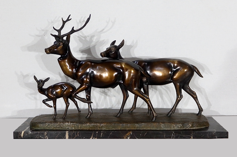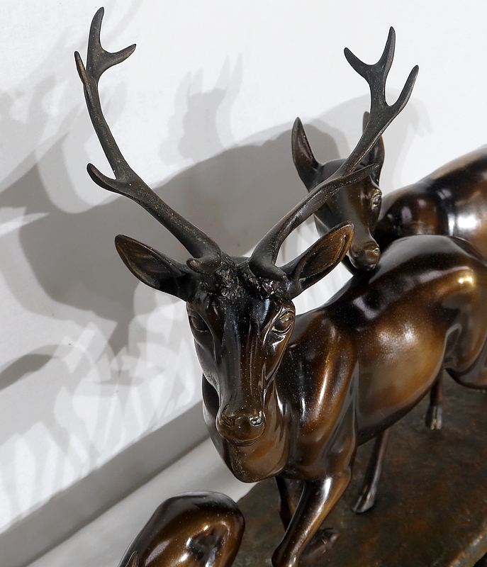 Grande sculpture en régule représentant un cerf, une biche et un faon, réalisée par M. Leducq (1879-1955), artiste français du début du XXe siècle.