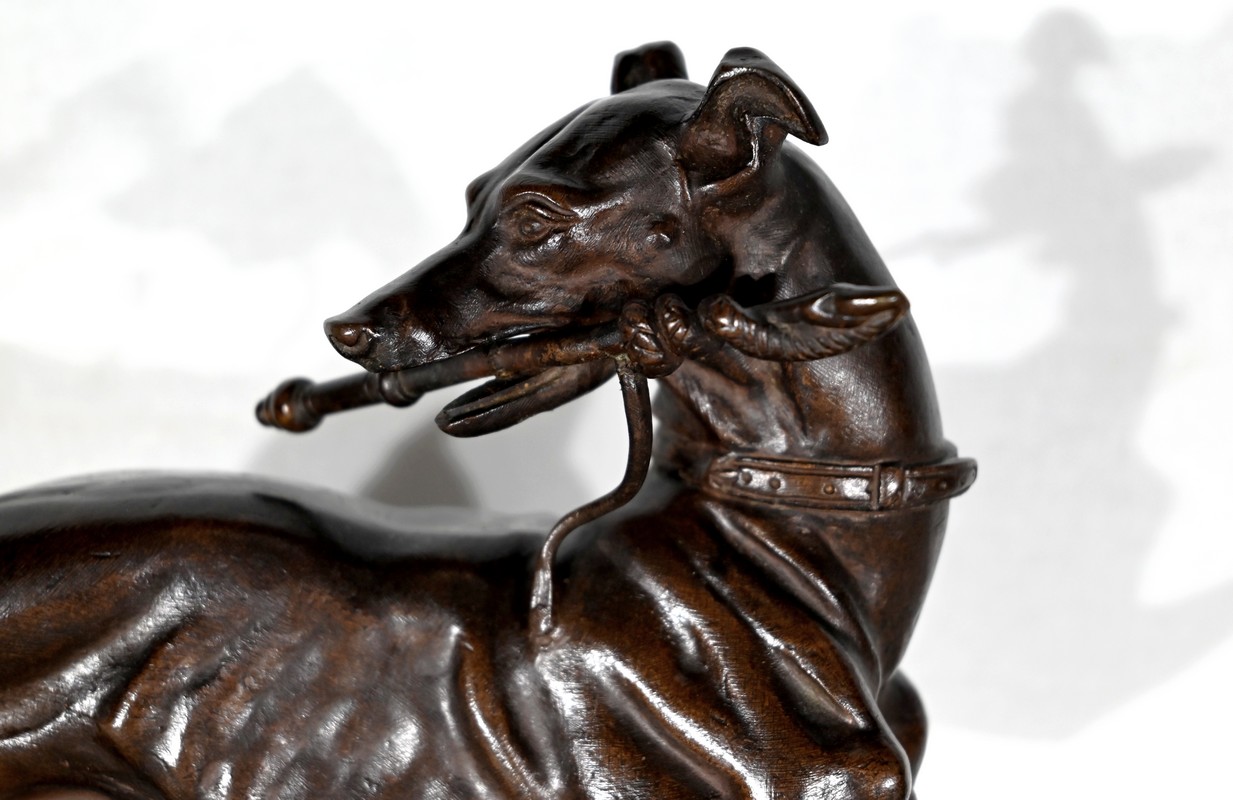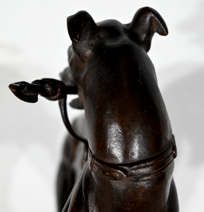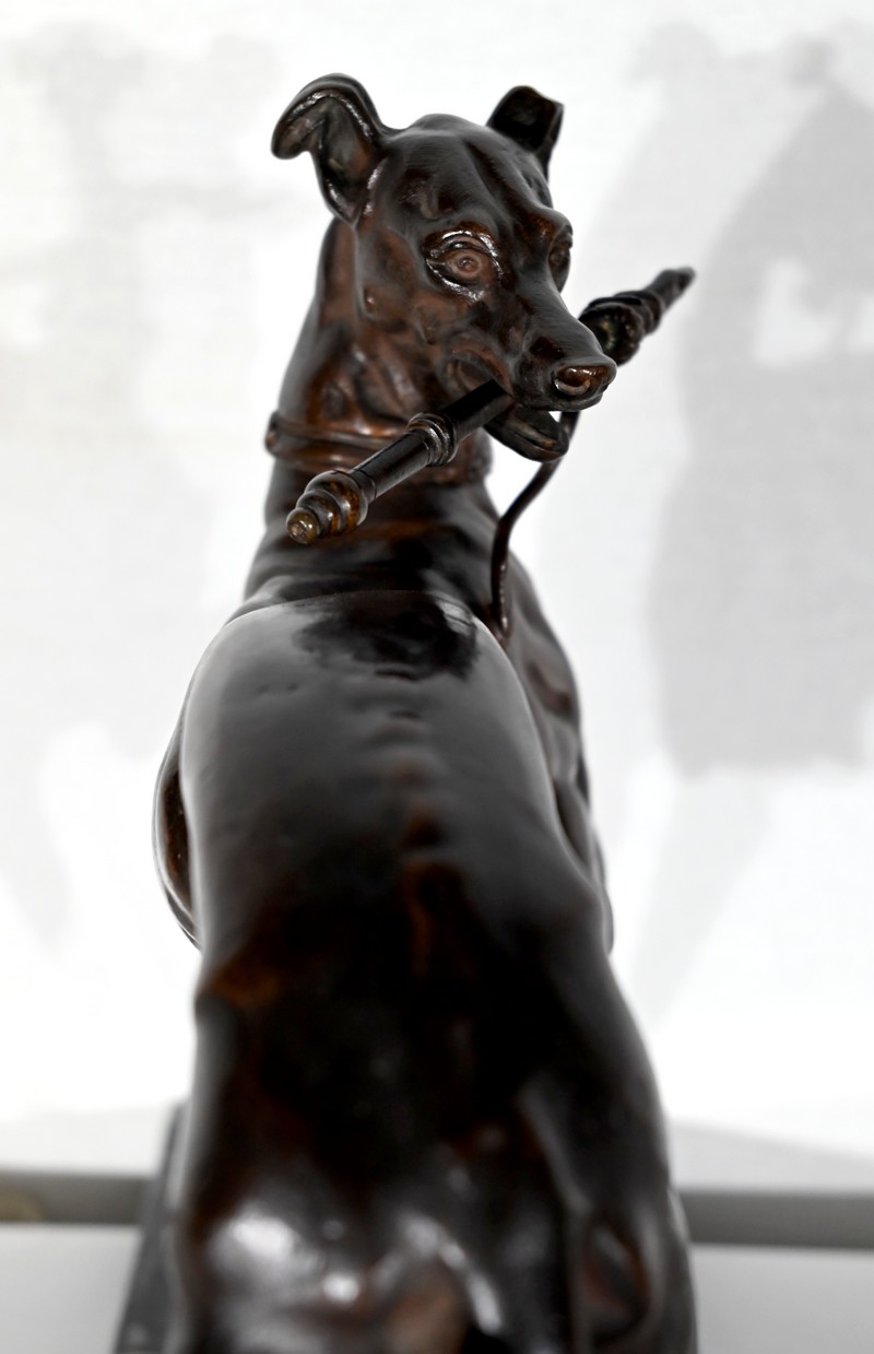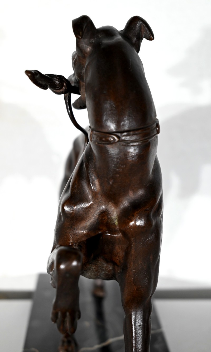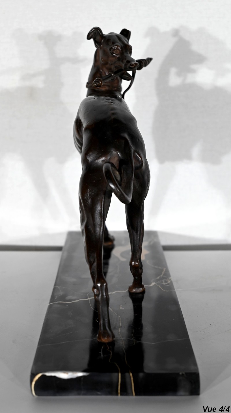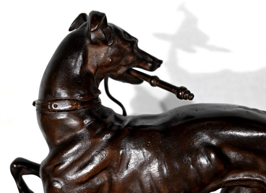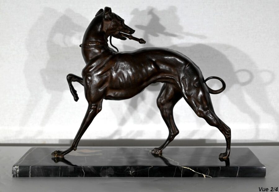 Ce chien longiligne, très musclé, aux longues pattes fines et au corps souple, tient fermement un bâton qu’il vient d’attraper entre ses crocs.