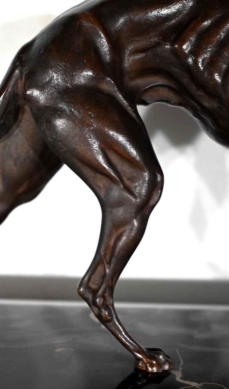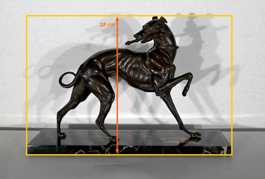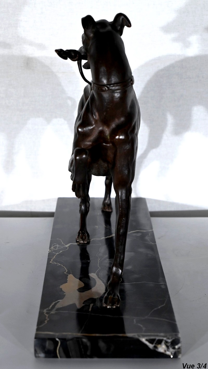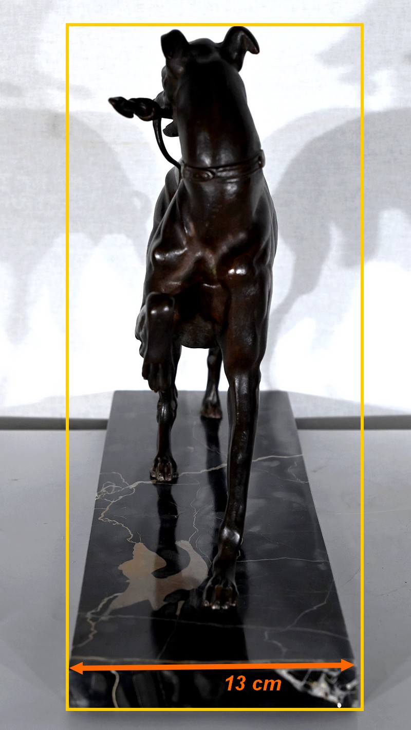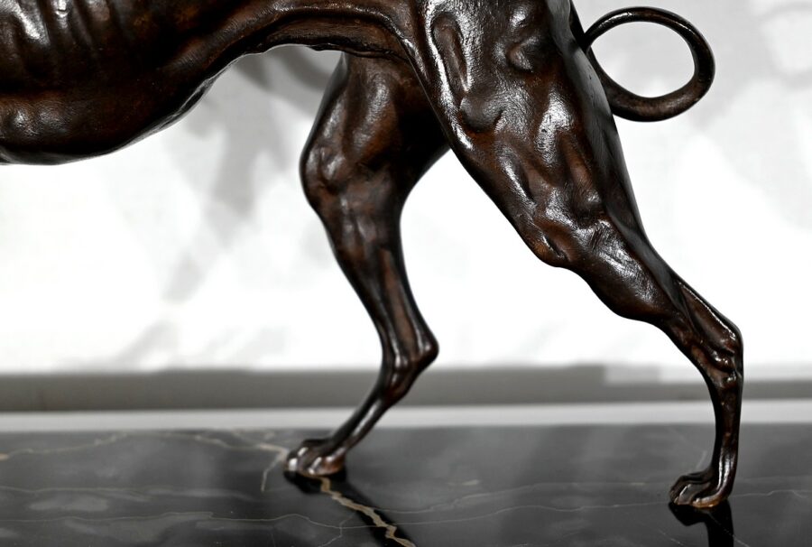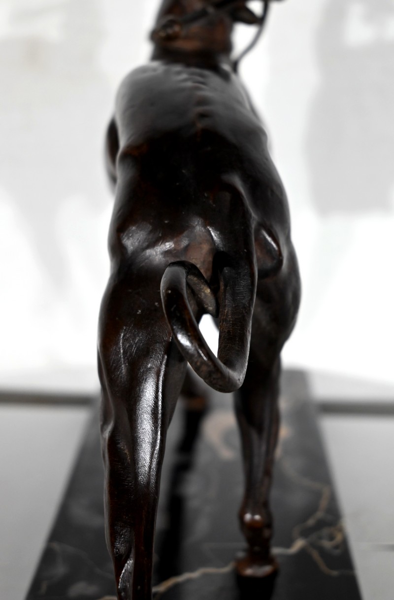 Sujet en fonte à patine brune, reposant sur un socle en marbre de Portor.