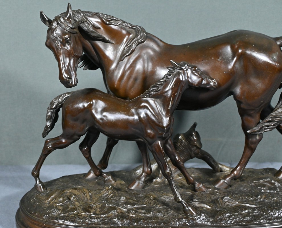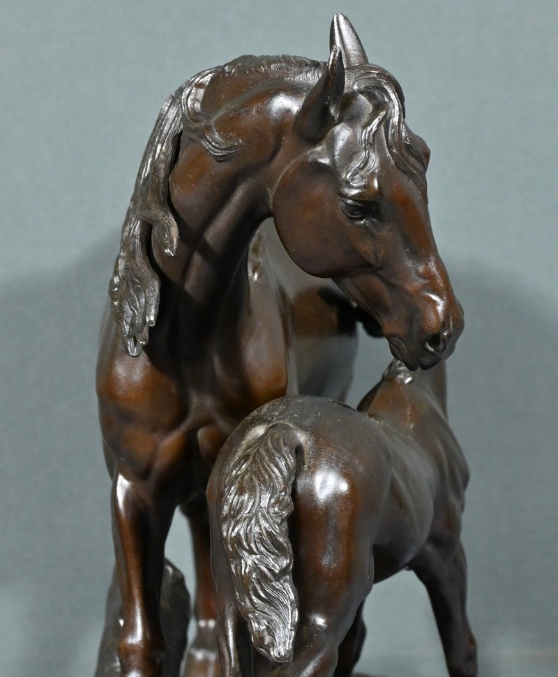 Cette sculpture en régule à patine brune, représentant une jument et son poulain, est une belle illustration de l’œuvre de Pierre-Jules Mène, sculpteur animalier français du XIXe siècle.
